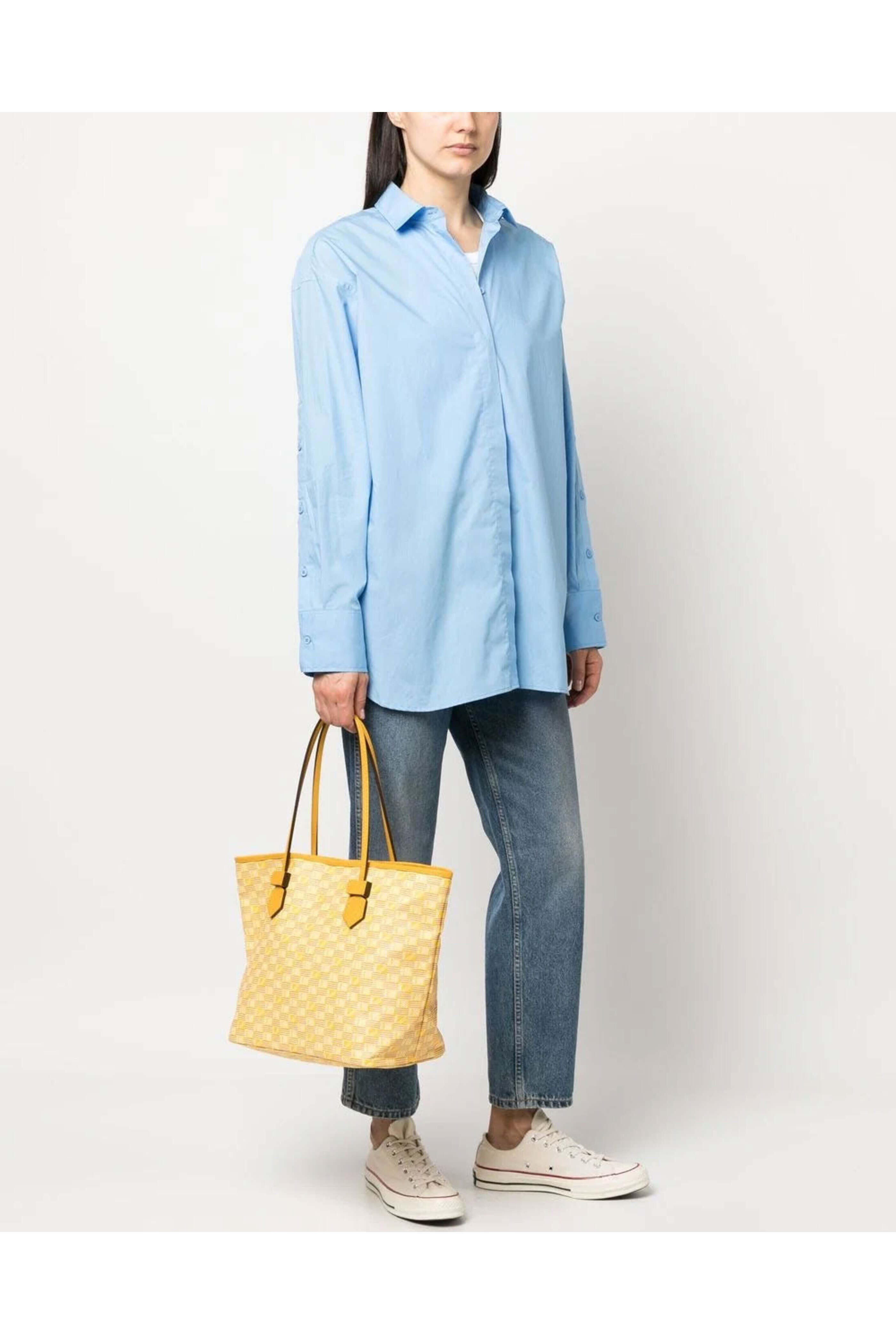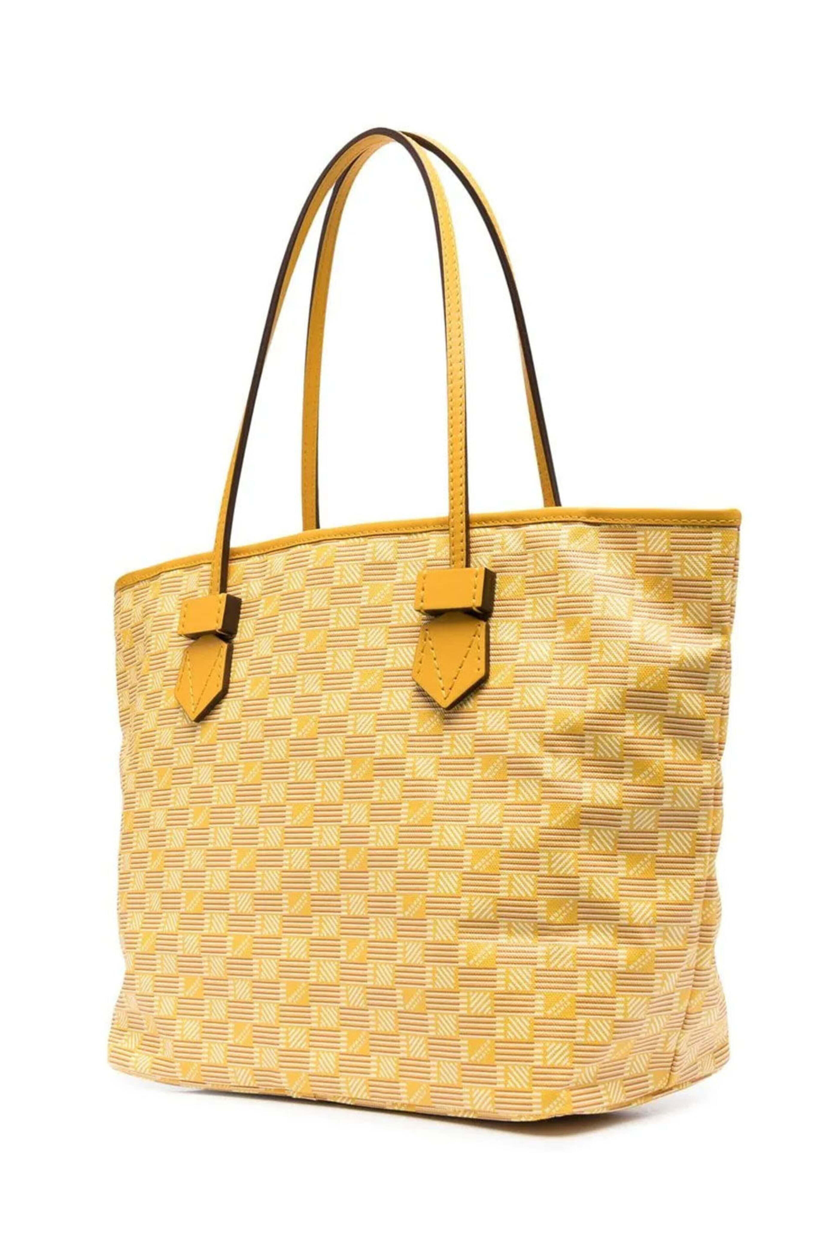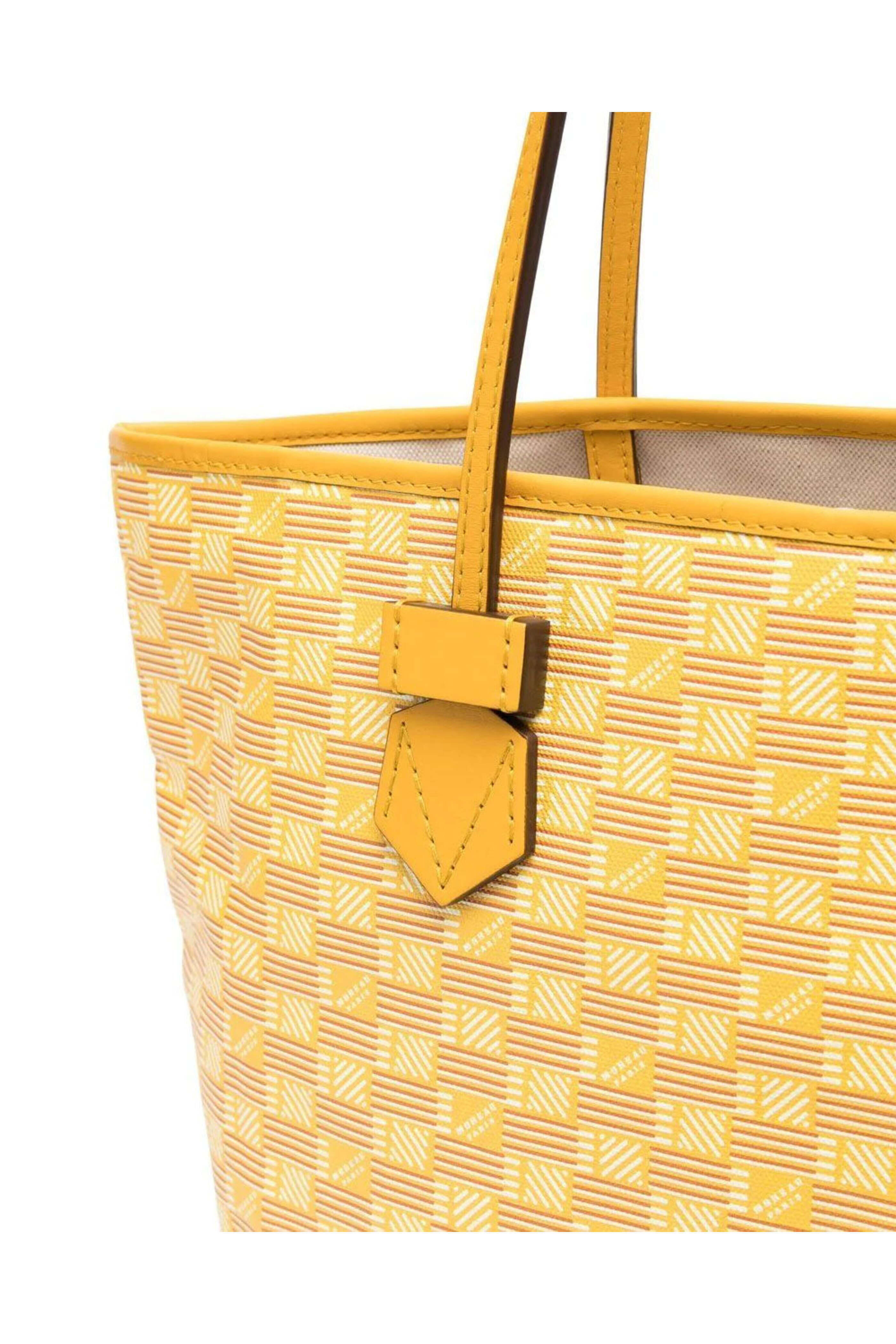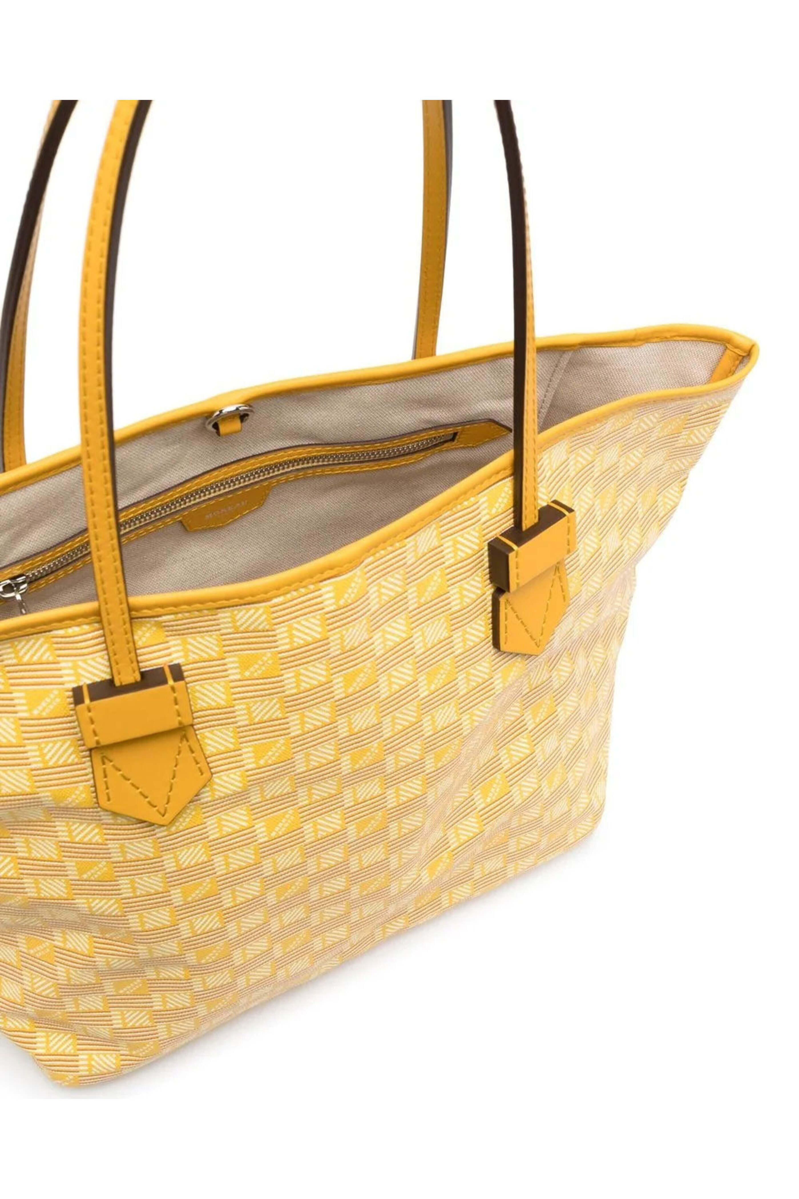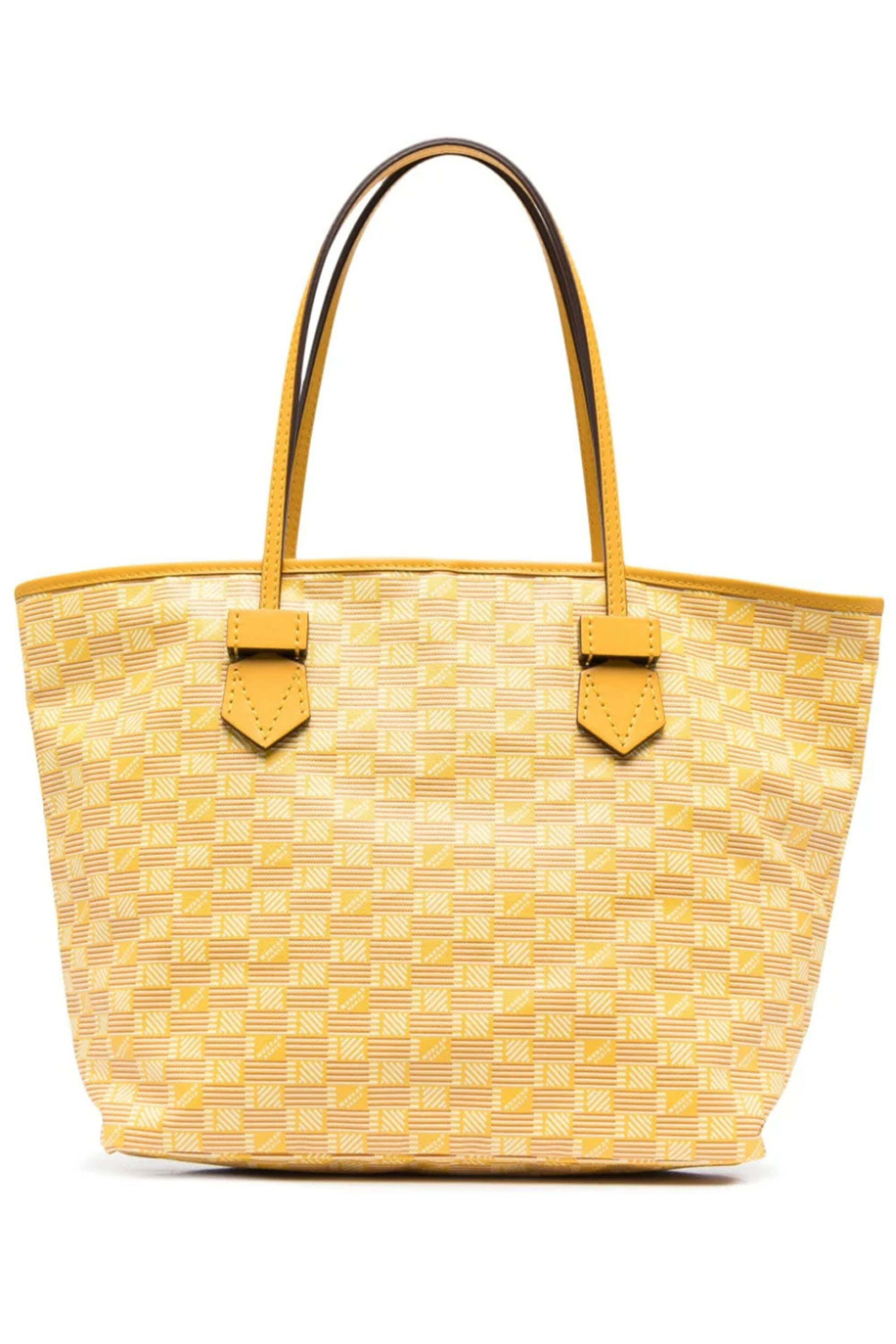 Moreau Medium Saint Tropez Tote in Yellow. Yacht inspired chain closure. Dual top handles. Internal patch pocket with zip closure. Signature moreaunette. Silver tone hardware. Ecocalf yellow outer, handles, and trim. Champagne canvas lining. 17.3 x 11 x 6.3. Made in Italy.