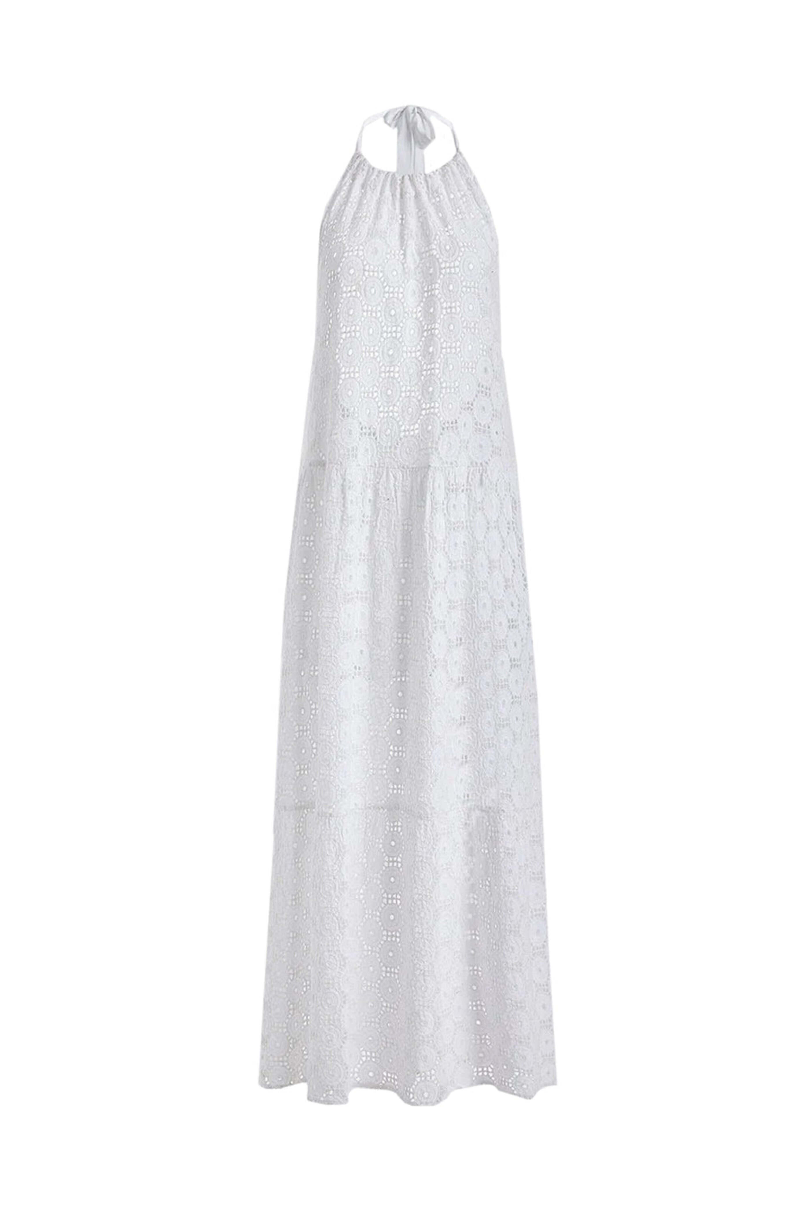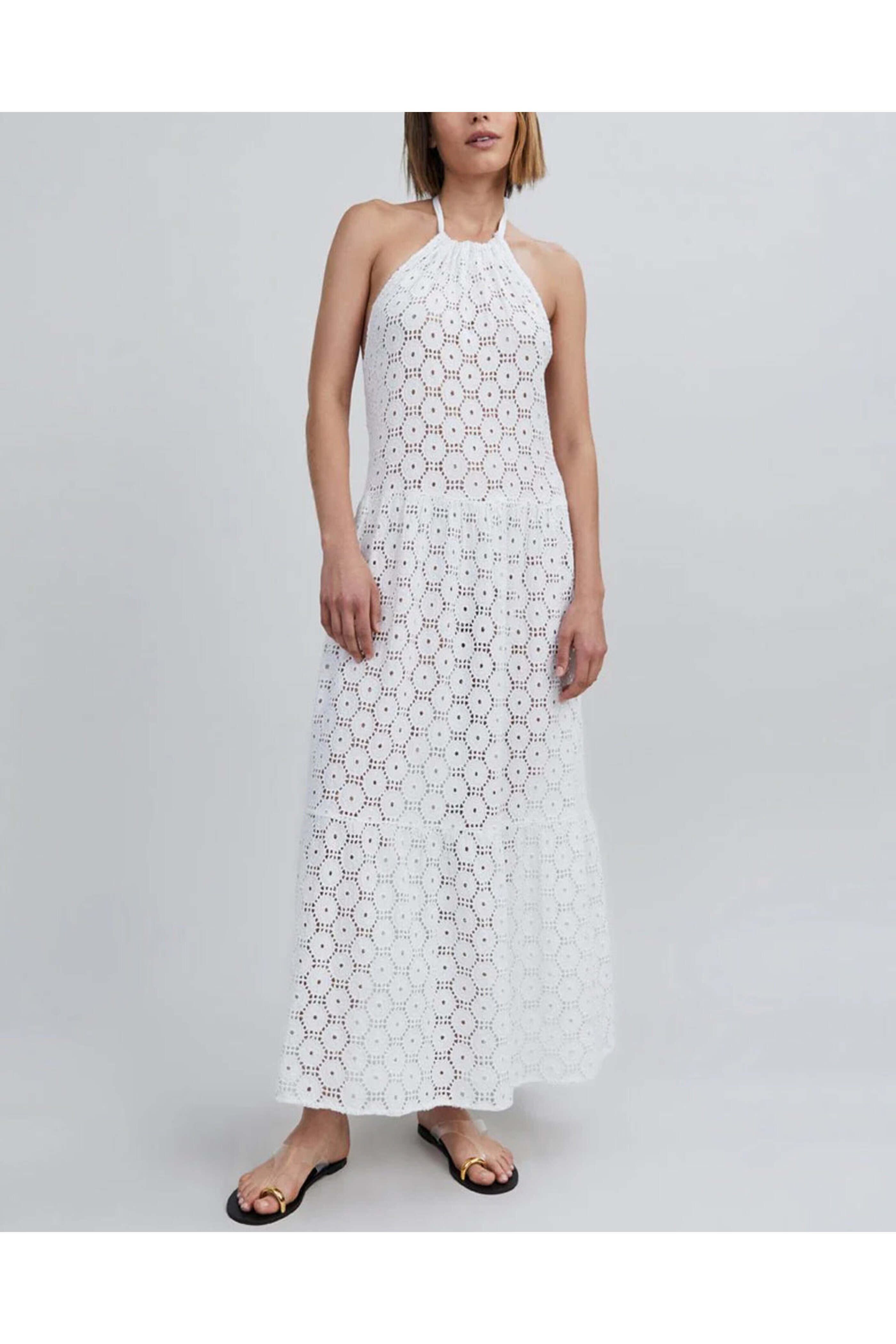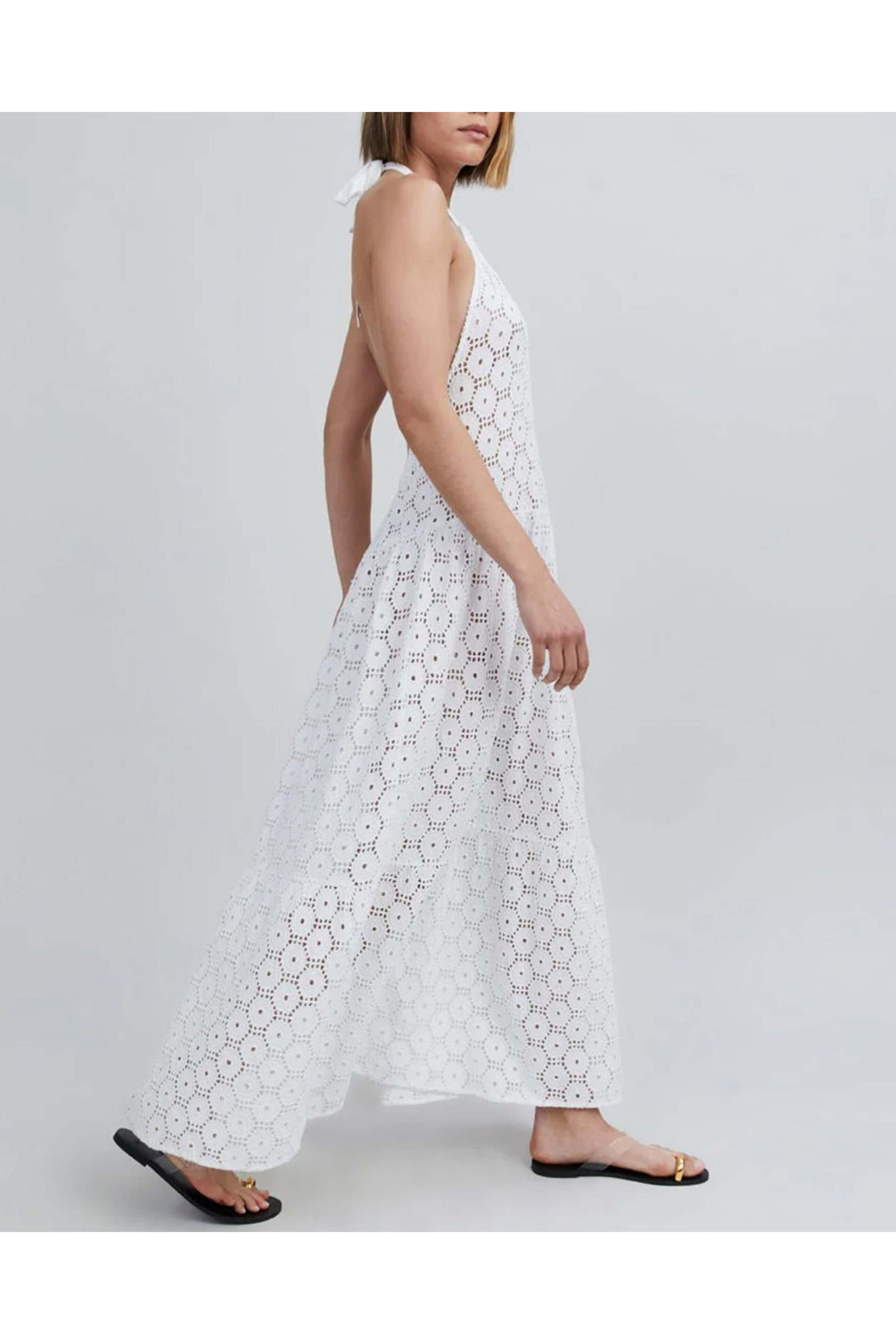Solid & Striped Optic White Eyelet Kai Dress. High halter neck; self-tie back closure. Low scoop back. Relaxed fit. Tiered aline silhouette. Maxi length. Eyelet fabrication. 100% rayon.