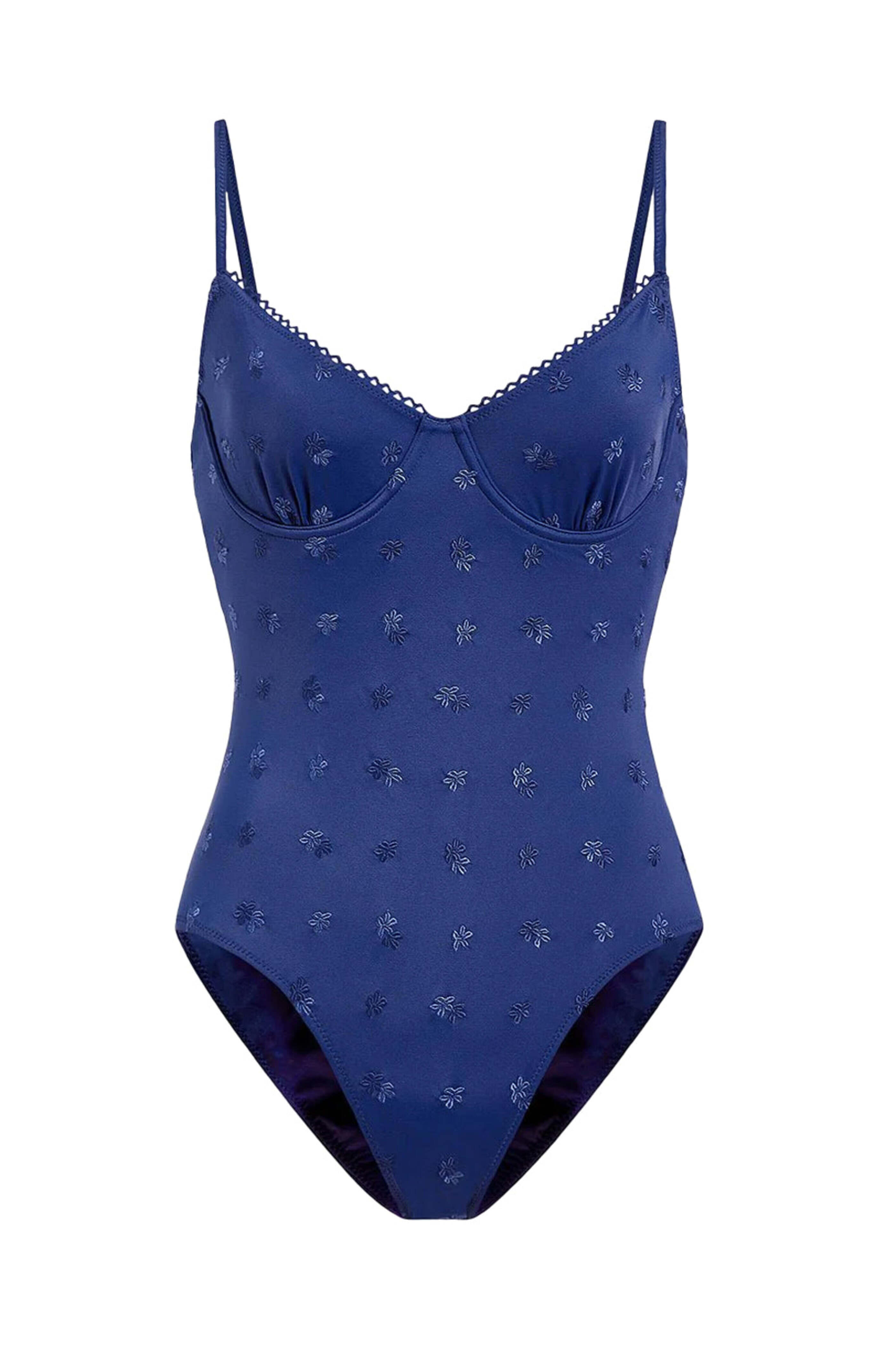 Solid & Striped French Navy Taylor One Piece Swimsuit. V neck. Low square back. Thin adjustable shoulder straps. Underwire cups. Slim silhouette. Embroidered detail. 80% recycled nylon, 20% spandex.