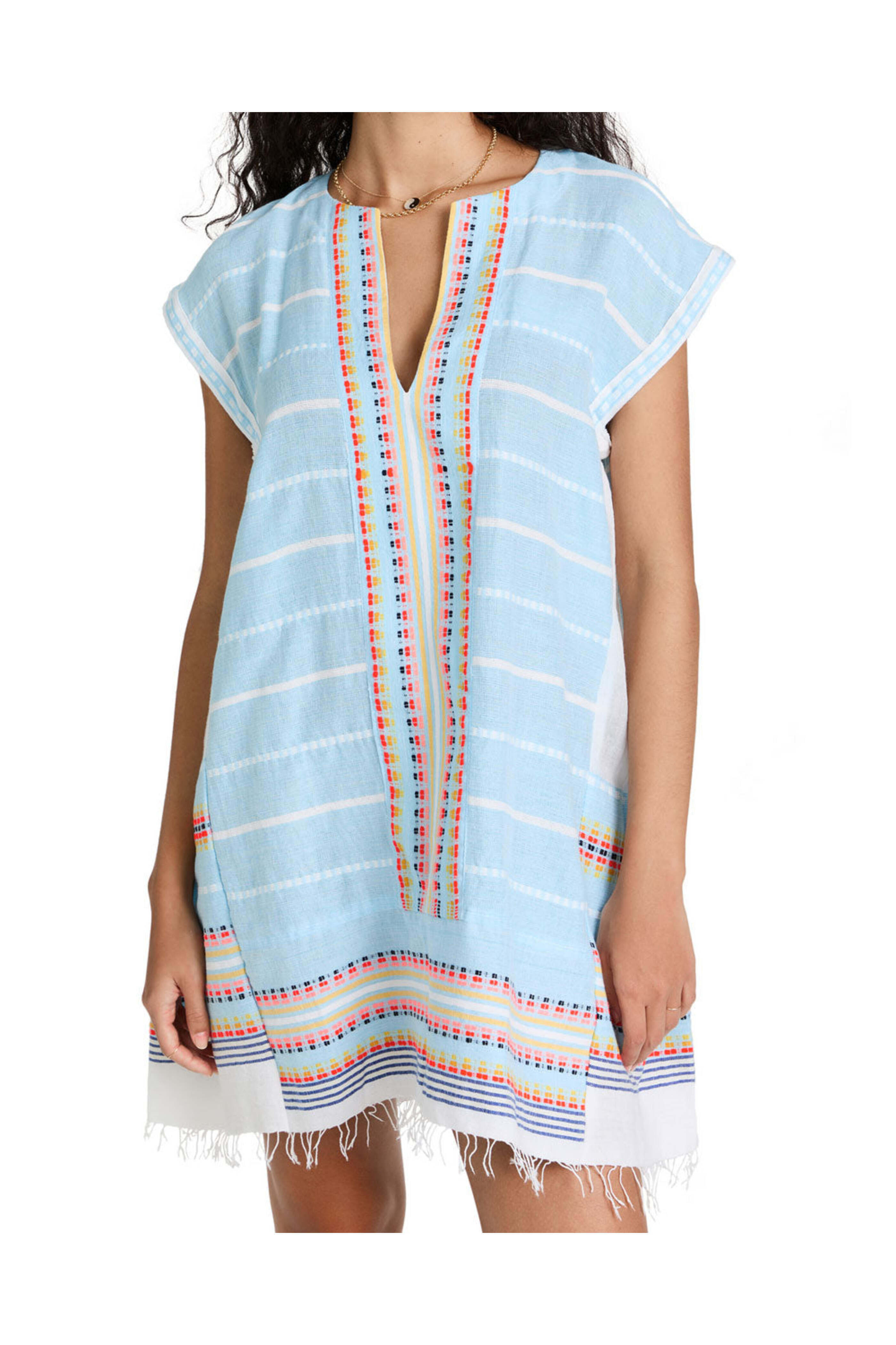 Lemlem Aqua Multi Doti Caftan Dress. V neck. Cap sleeves. Relaxed fit. Mini length. Fringe hem. 95% cotton, 5% acrylic.
