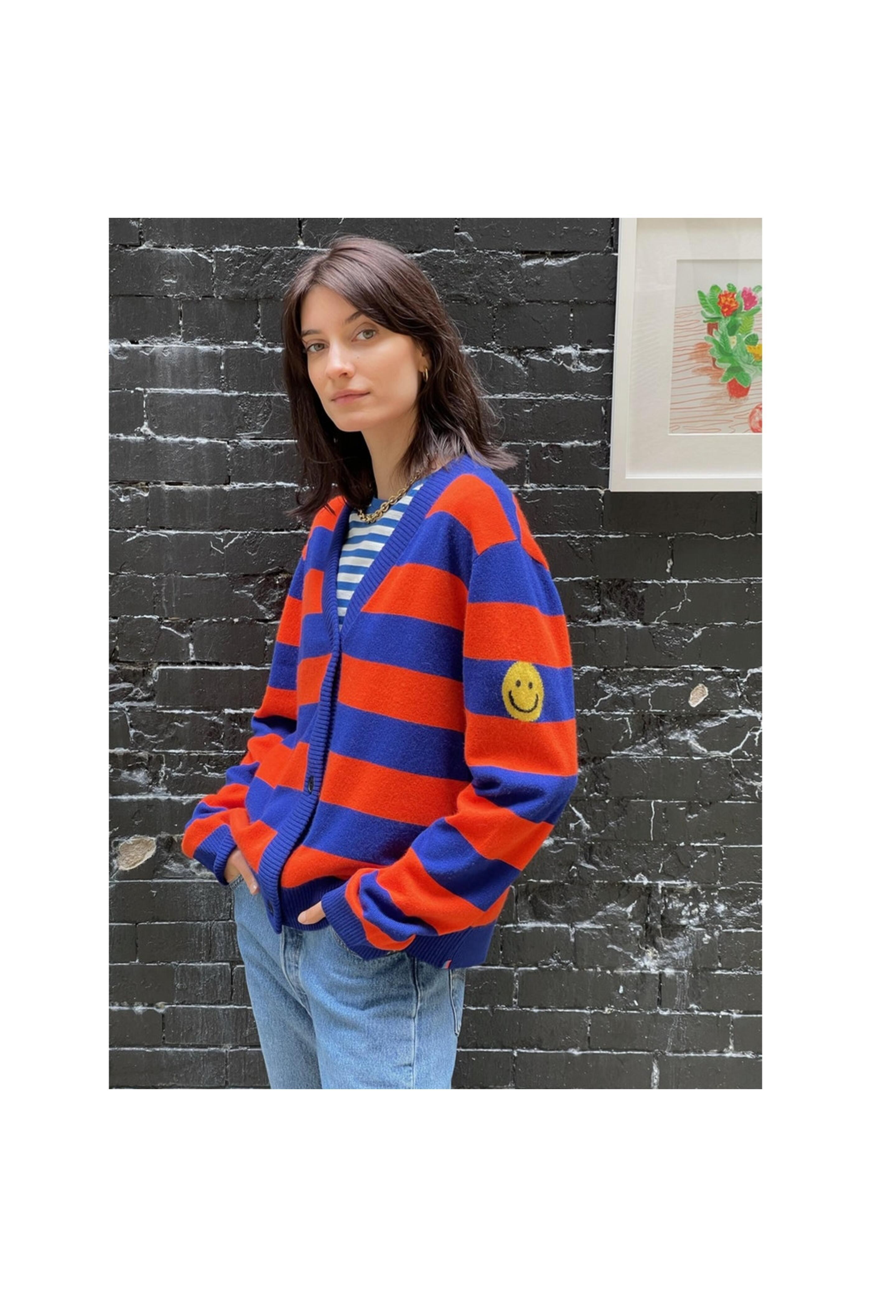 Kule The Remus Smile Cardigan in Blue Poppy Stripe. V neck. Long sleeves. Front button closure. Smiley face graphic at left sleeve. Relaxed fit. 100% cotton.