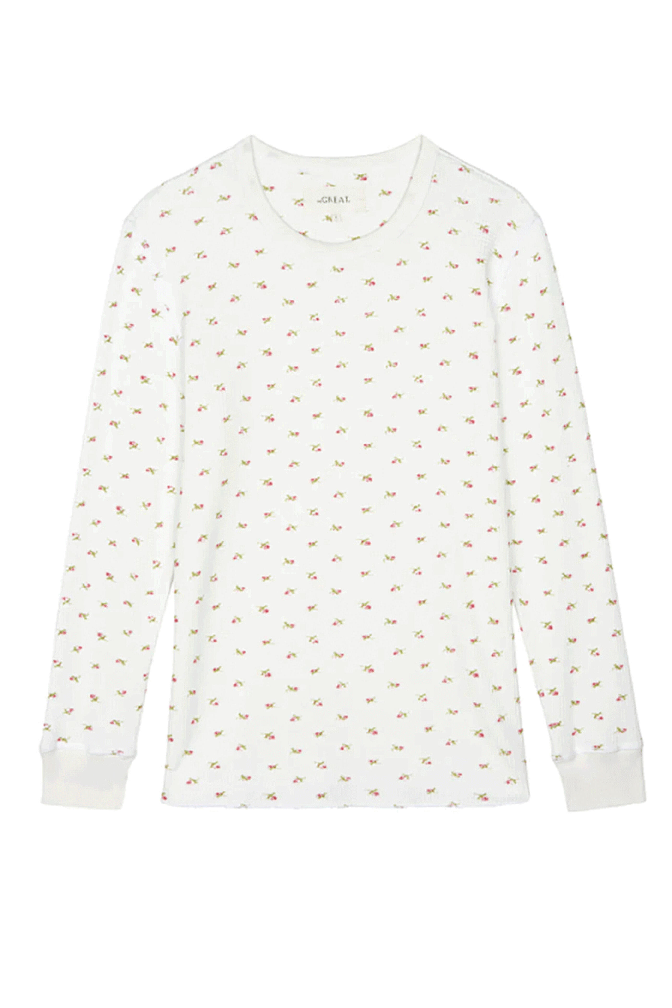 The Great White Mini Heirloom Rose Waffle Surplus Crew. Crew neck. Floral print. Long sleeves. Ribbed hem at neck and cuffs. Rib: 100% Cotton.