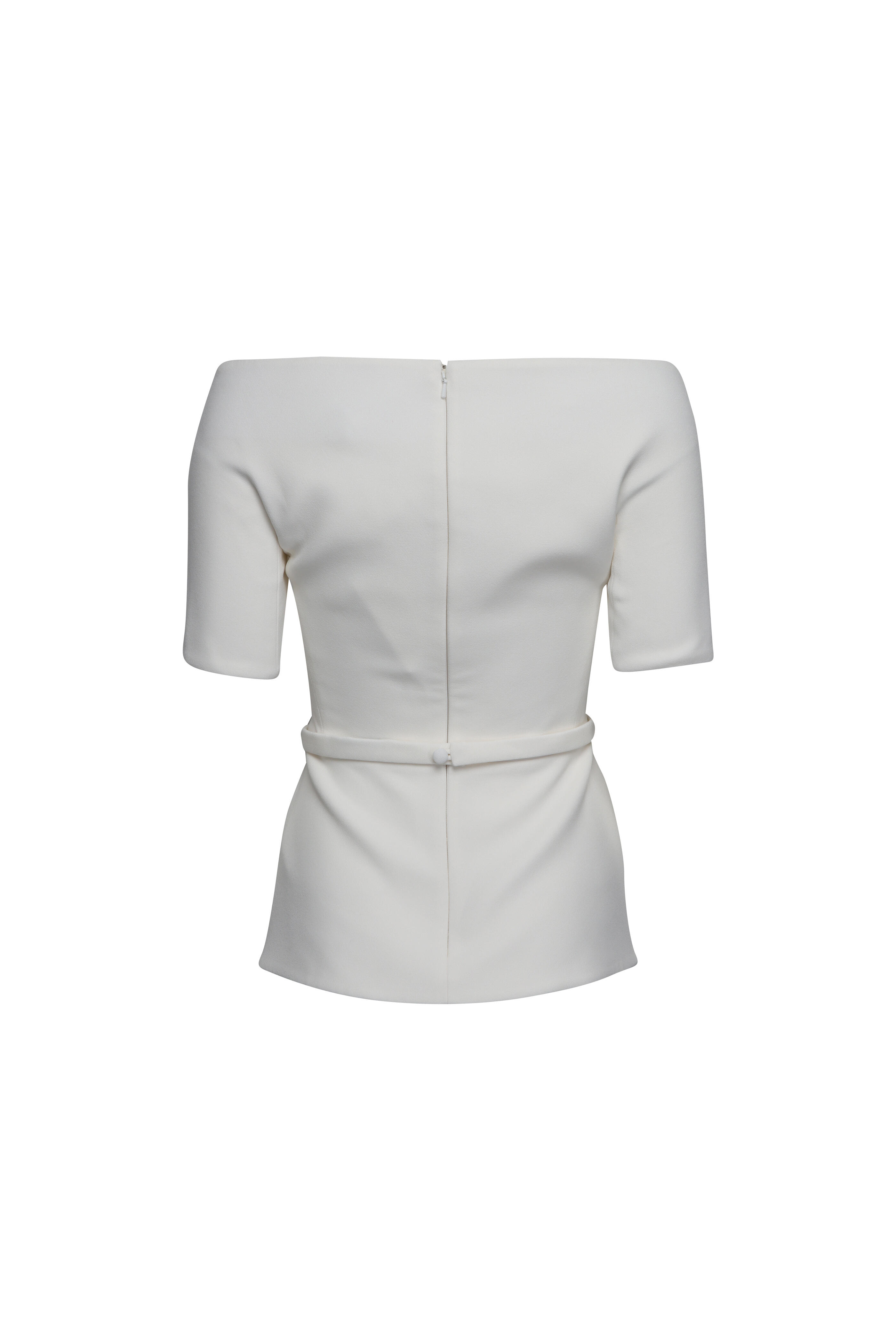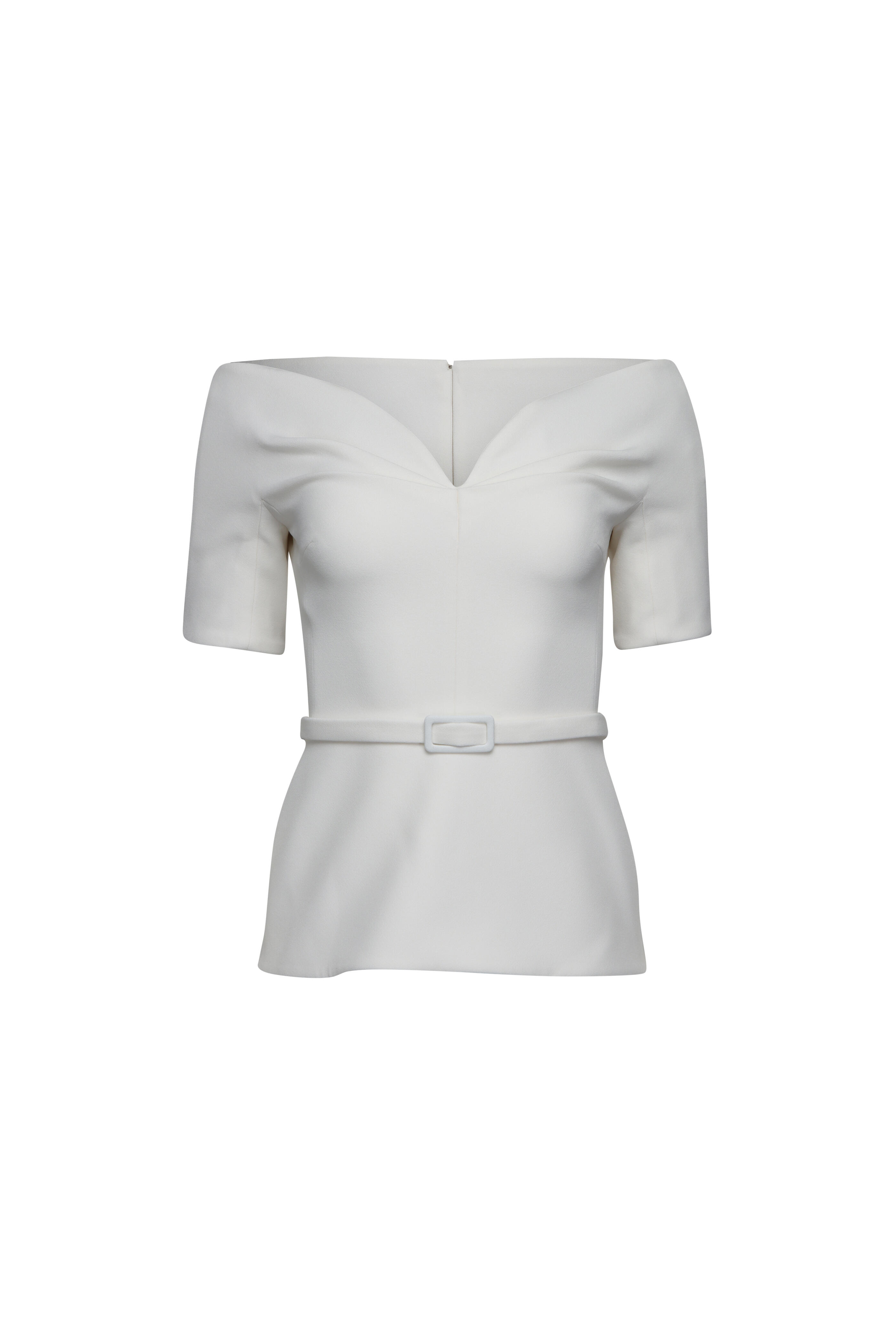 Off the shoulder. Short sleeves. Concealed back zip closure. Removable buckle belt; self-fabrication. Peplum silhouette. Imported. Bust 33.9” (US 4). Waist 26.8” (US 4). Hip 37” (US 4). Sleeve 23.6” (US 4). 92% polyester, 8% elastane. Dry clean.