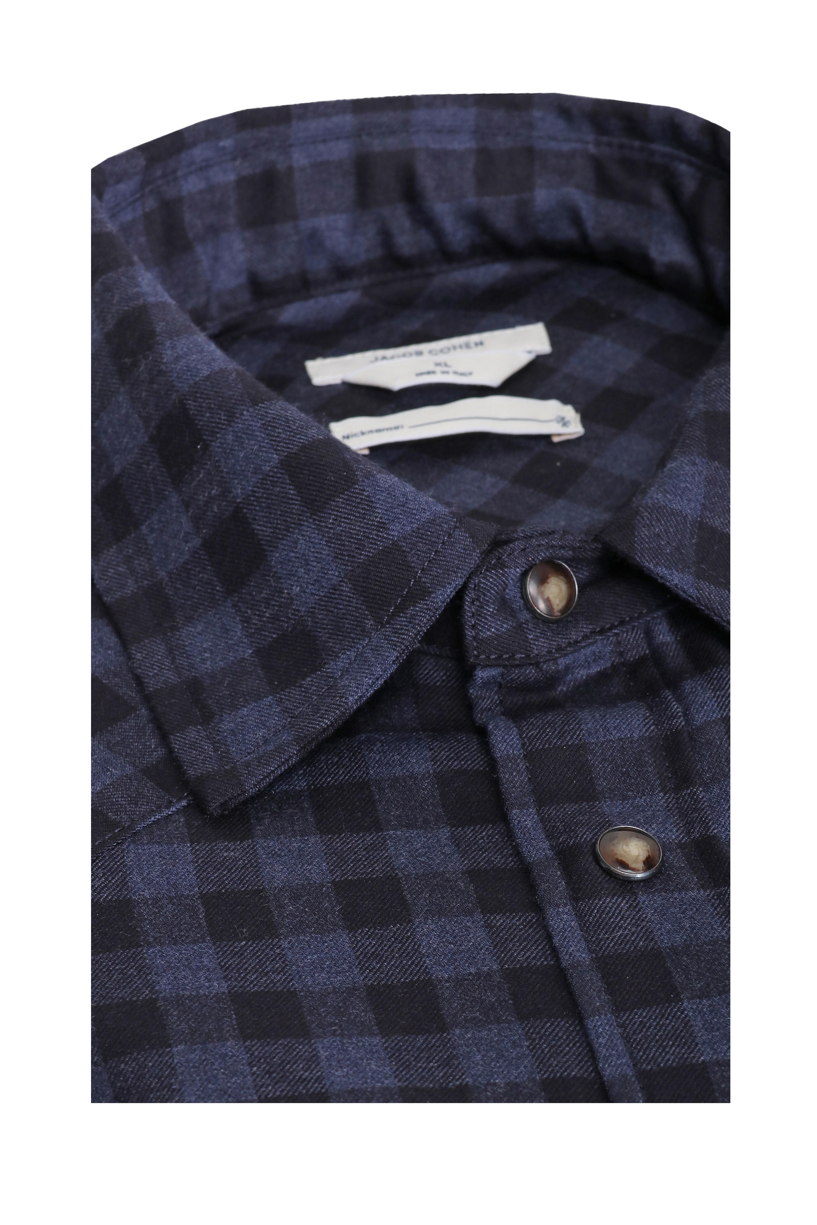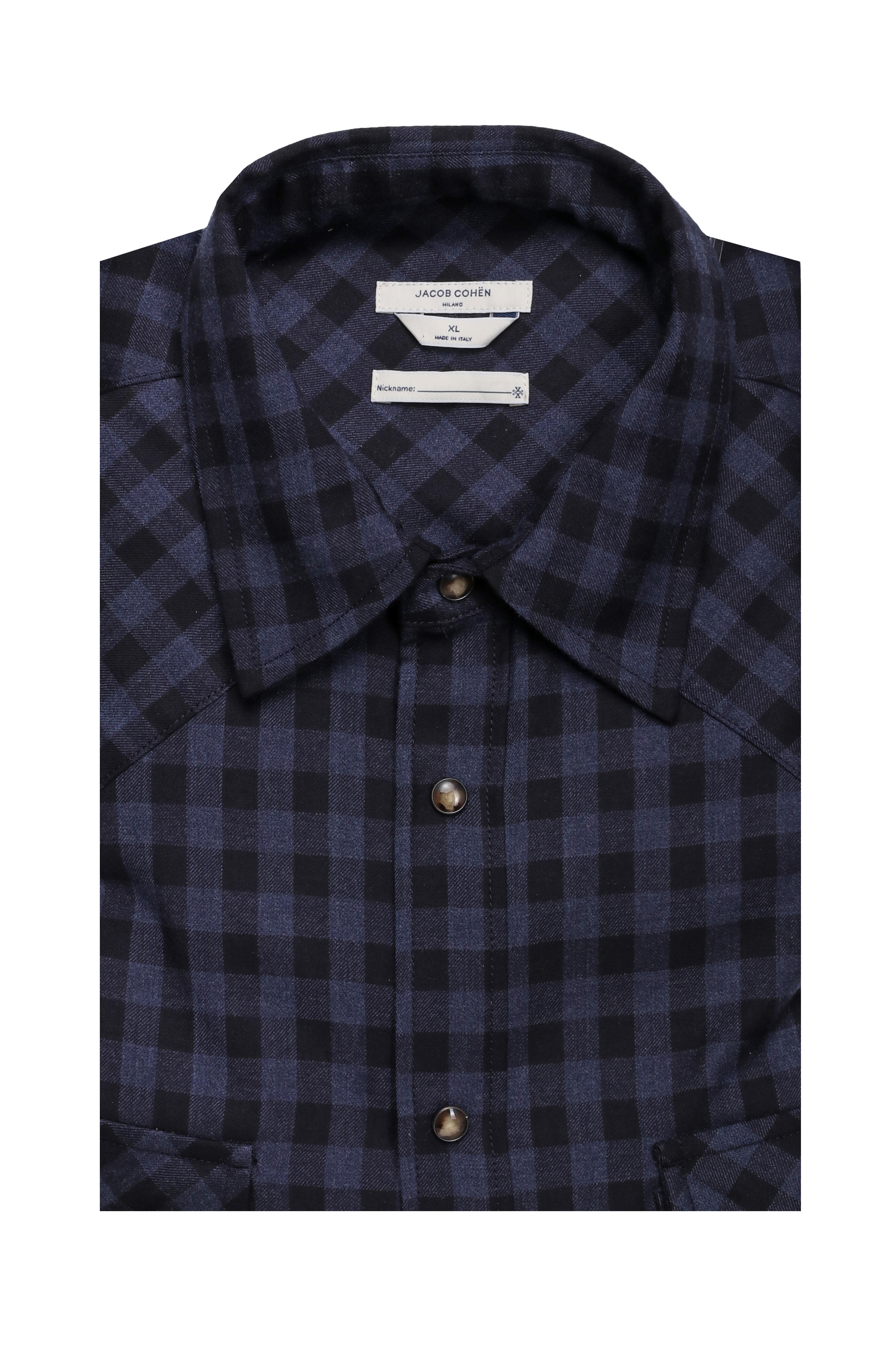 Spread collar. Chest flap pockets. Snap front button placket. Single snap cuffs. Made in Italy. 100% cotton. Dry clean.