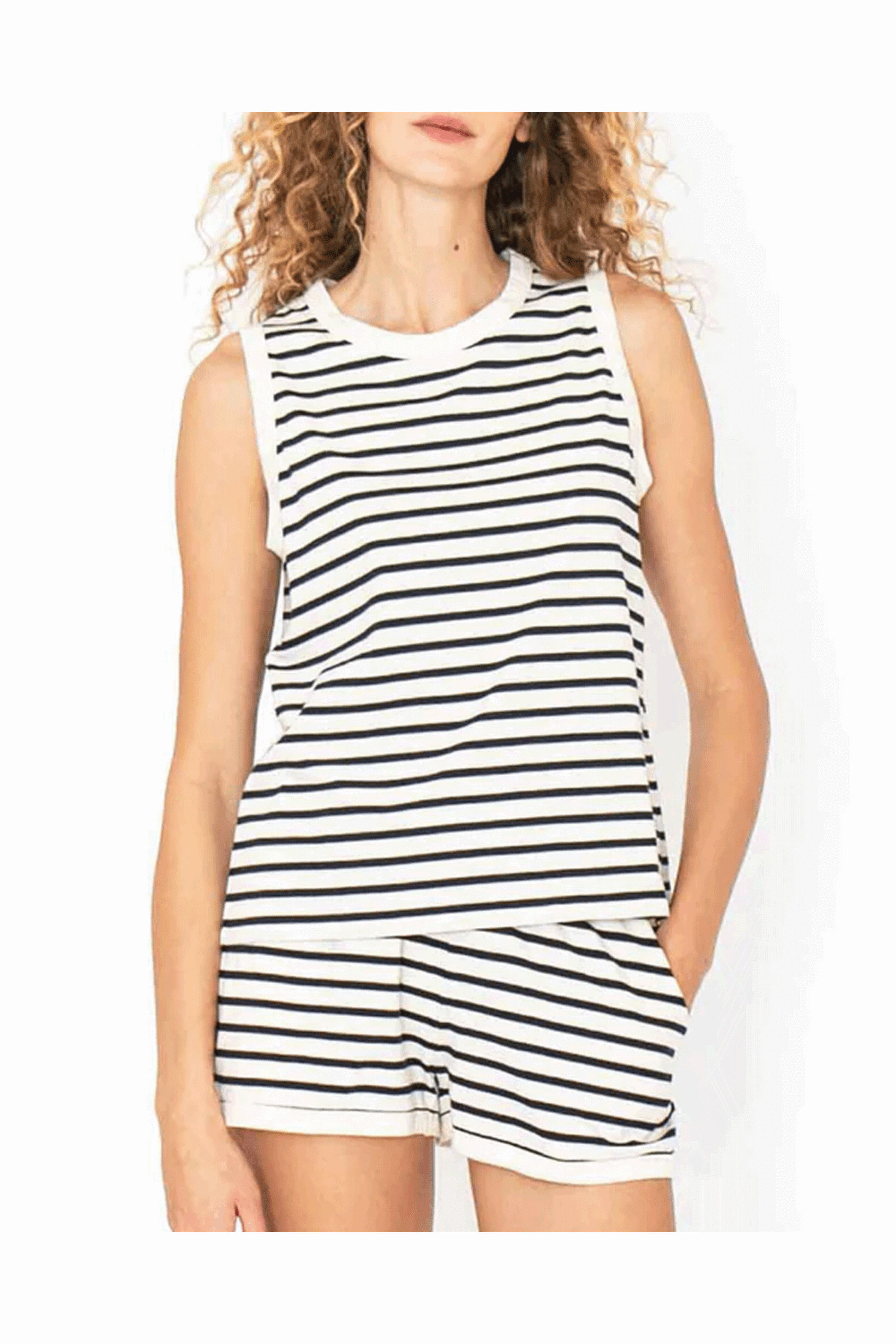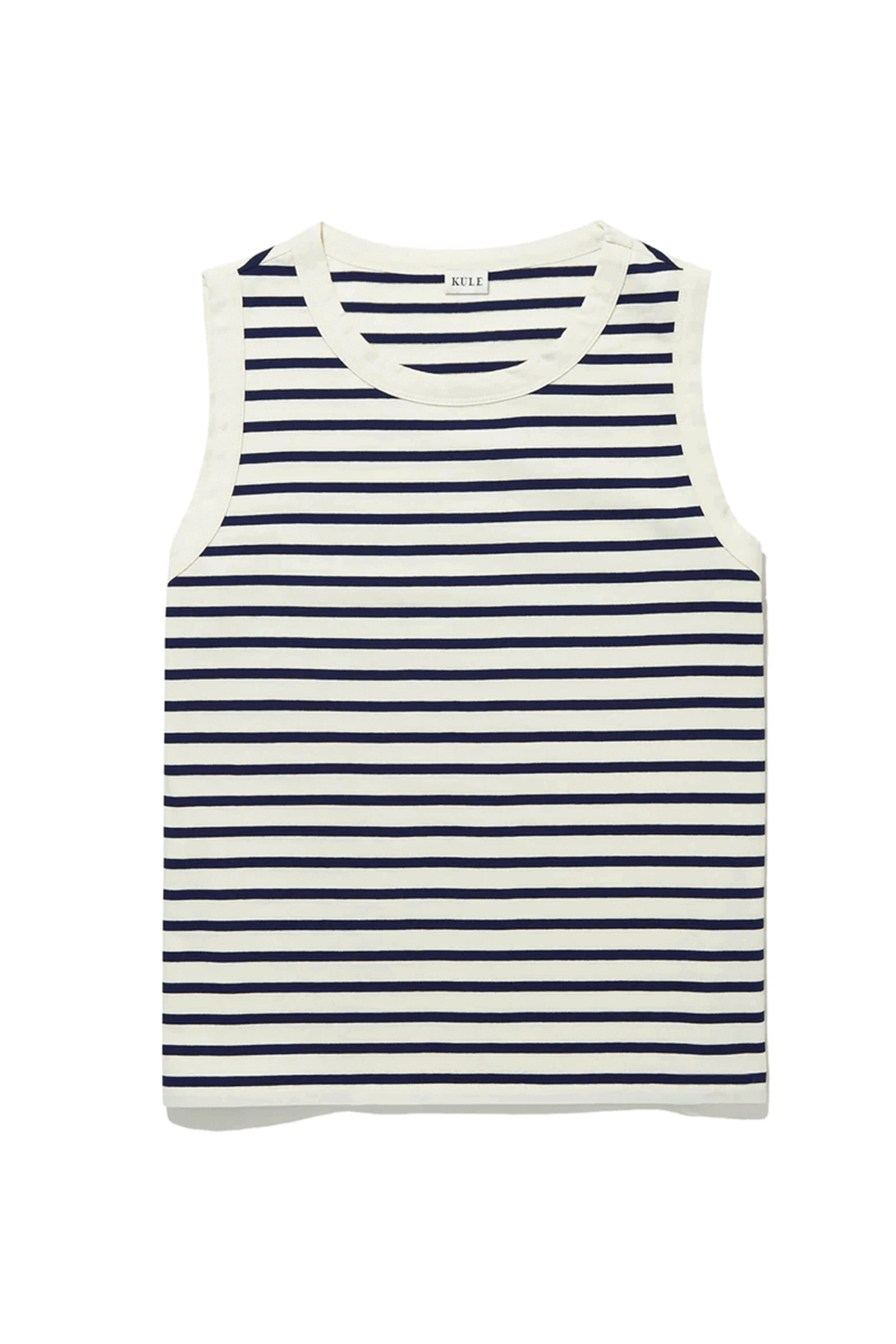Kule the Tank in Cream and Navy. Scoop neck . Straight hem. Sleeveless. Made in Portugal. Machine Washable. 100% cotton.