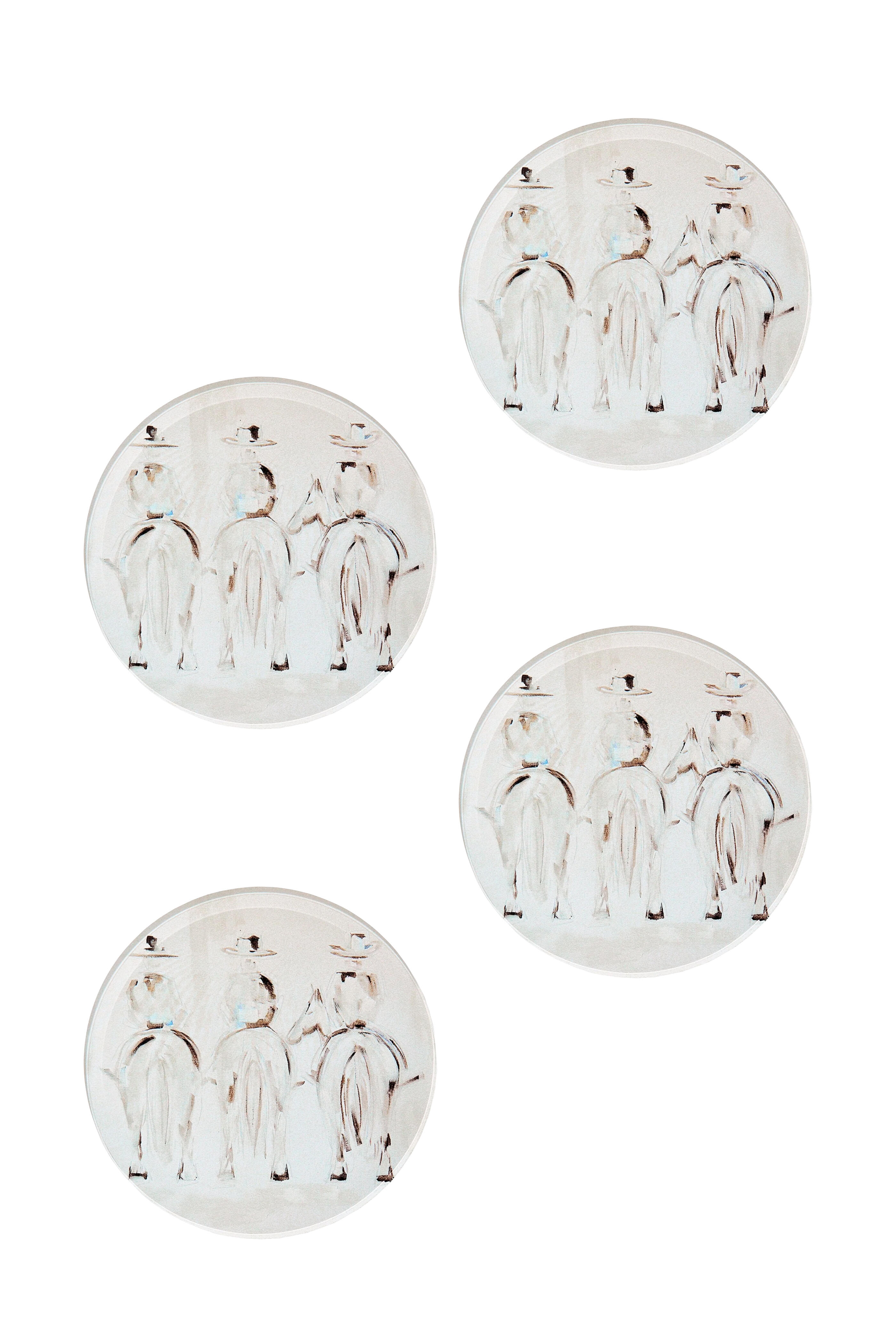Use a soft damp cloth to clean and keep inside. Features a playful design of three cowboys, tres amigos. Set of 4. Hand painted. Handmade in Dallas, Texas. Dimensions: 4” D x .50” H. 100% acrylic.