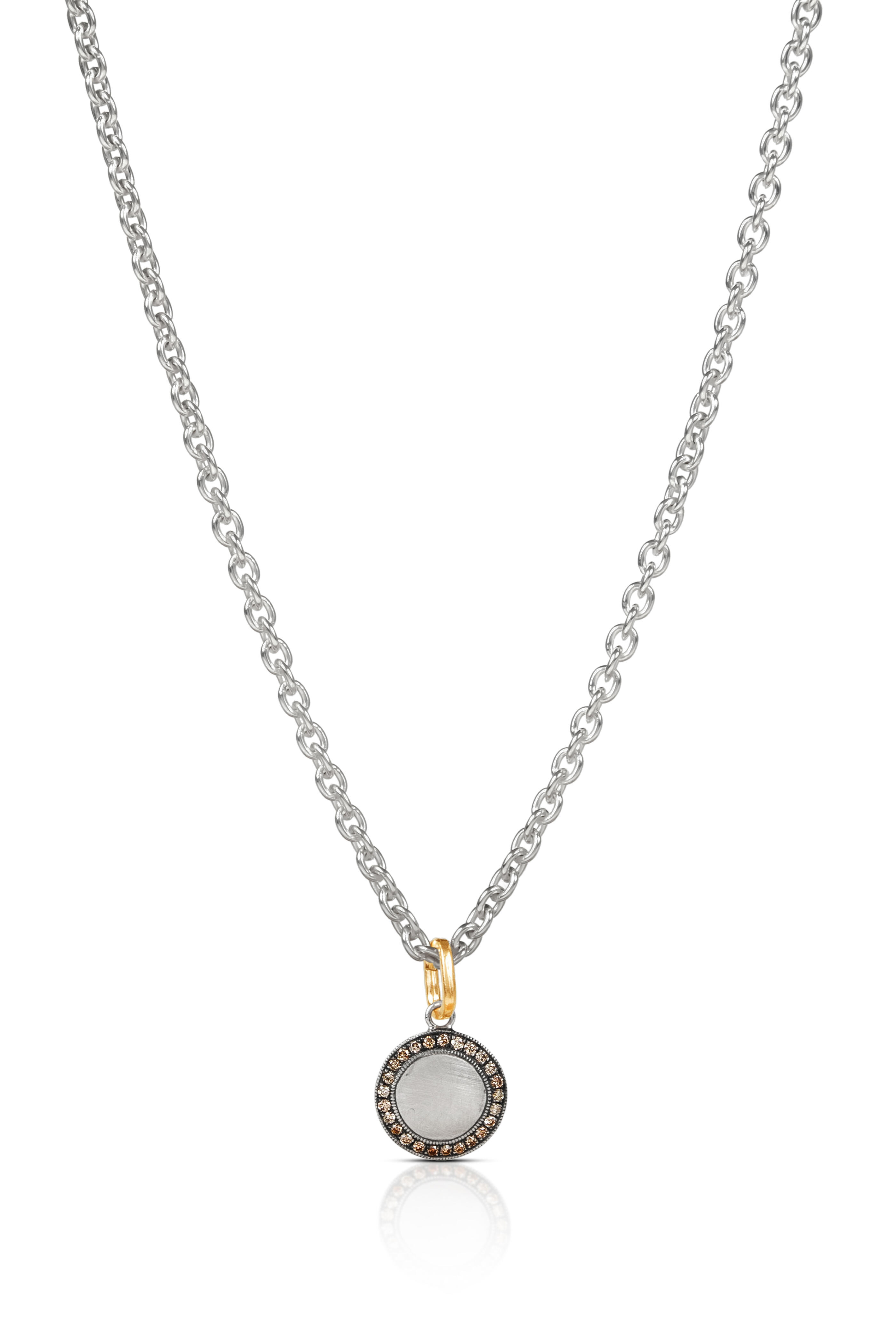 14k gold. Sterling silver. Champagne diamond 0.20 total carat weight. Round. Diamond halo. Prong setting. Bail. Handcrafted in L.A.. Diameter: 13mm.