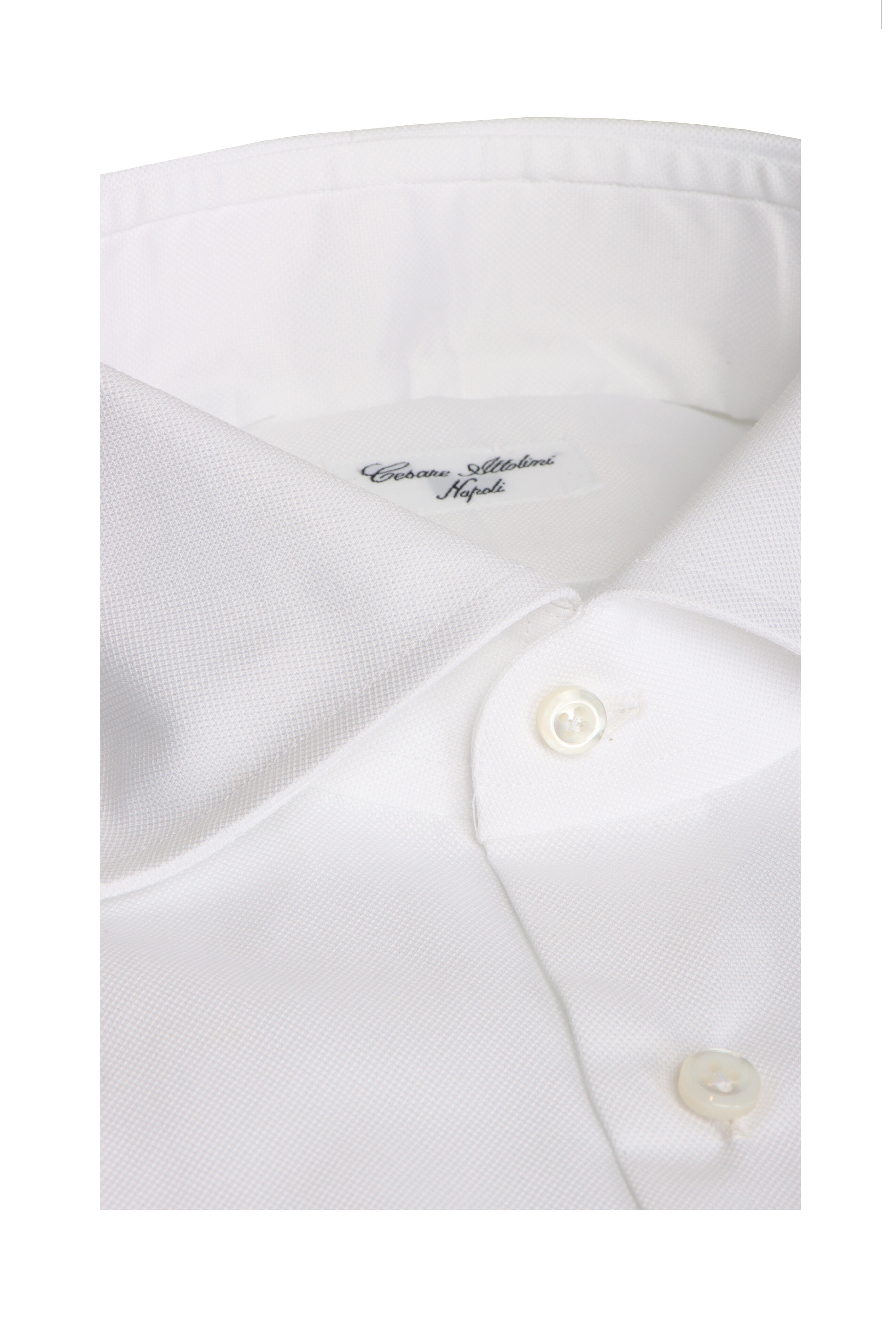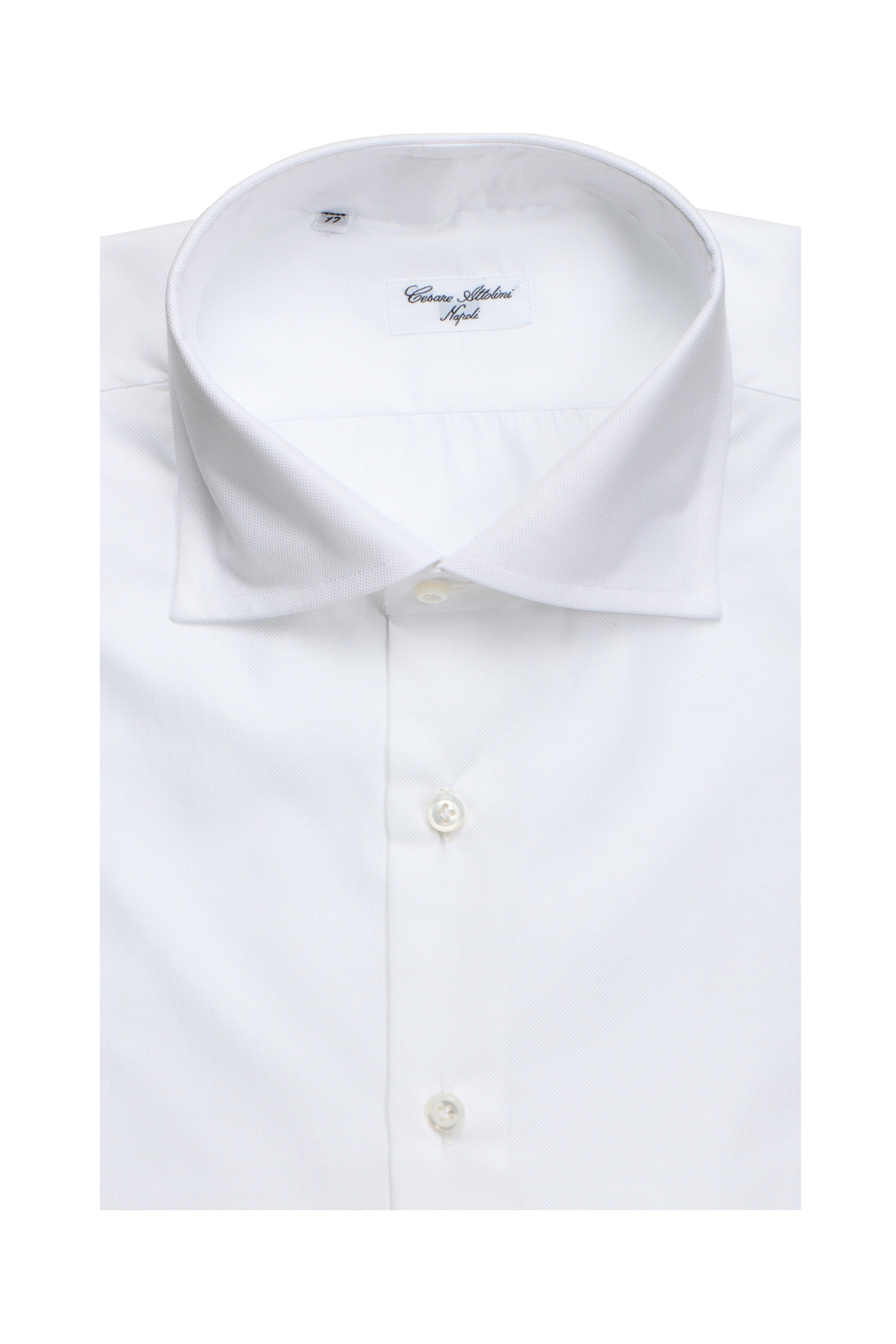 Spread collar. French front button placket. Single button barrel cuffs. Made in Italy. 100% cotton. Dry clean.