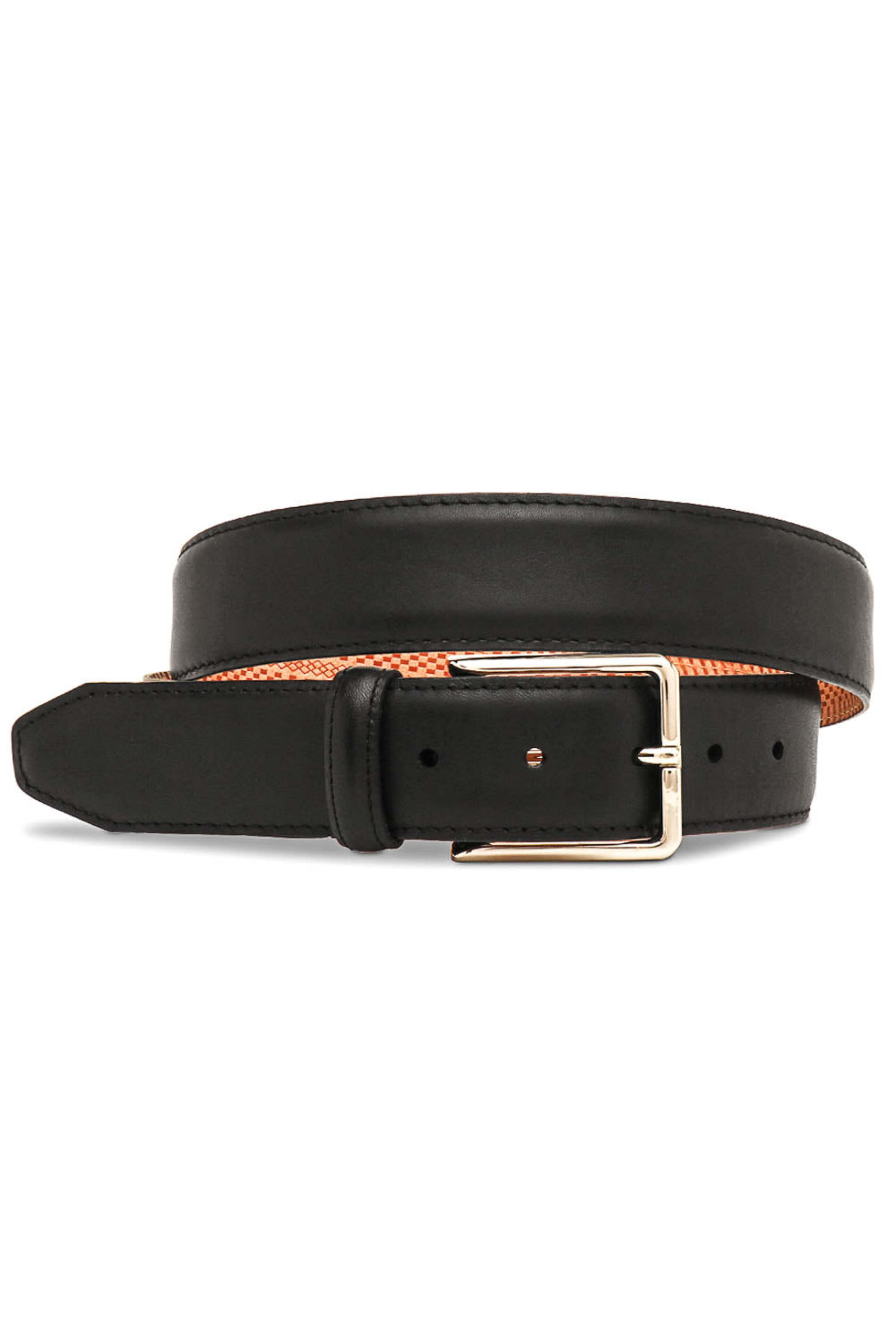 - Martin Dingman Black Leather Thornton Belt Italian calfskin belt Nickel polish fastening Single loop keeper Saddle leather lining Tonal stitching Tapered tip Handcrafted in the USA
