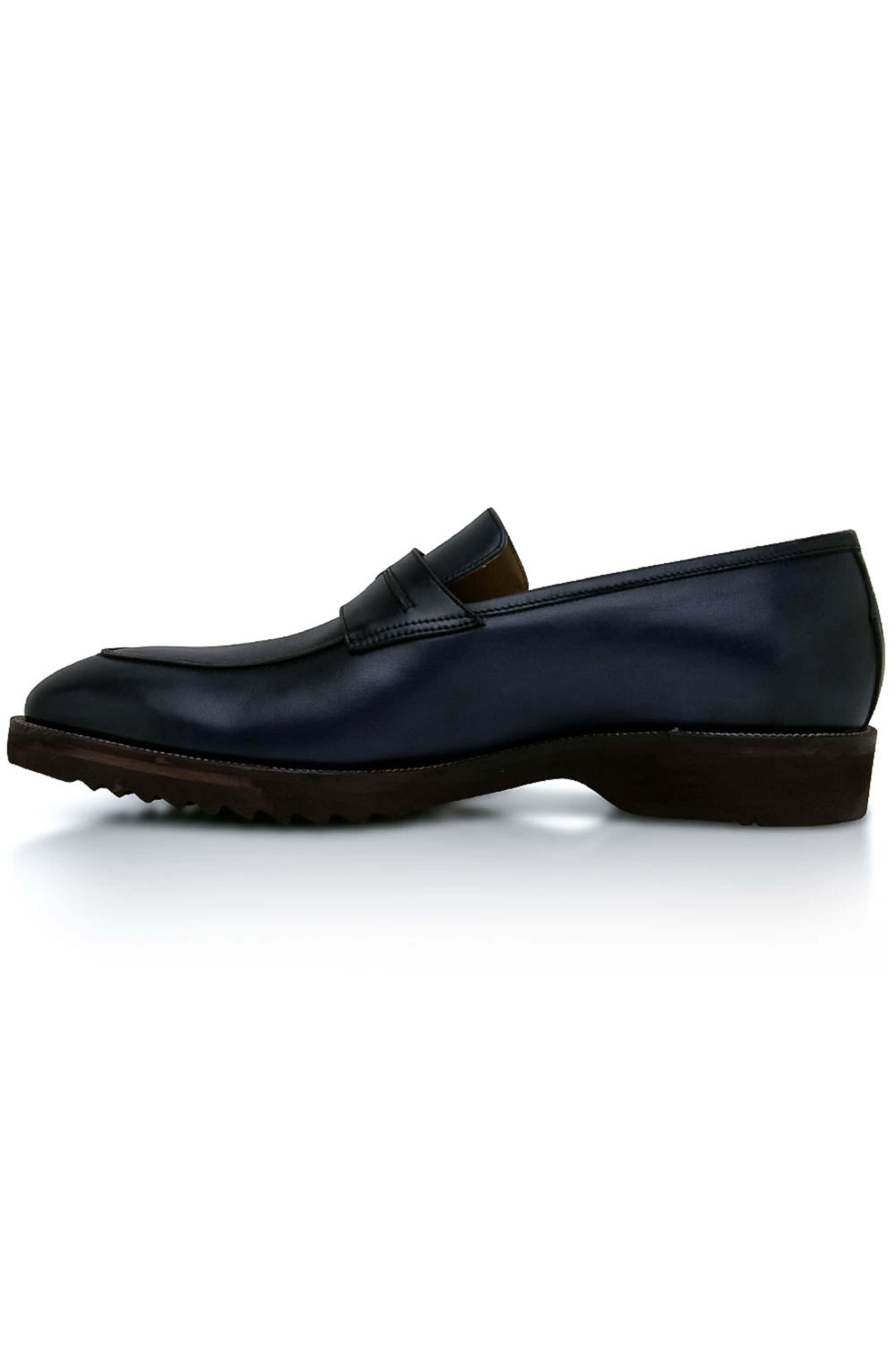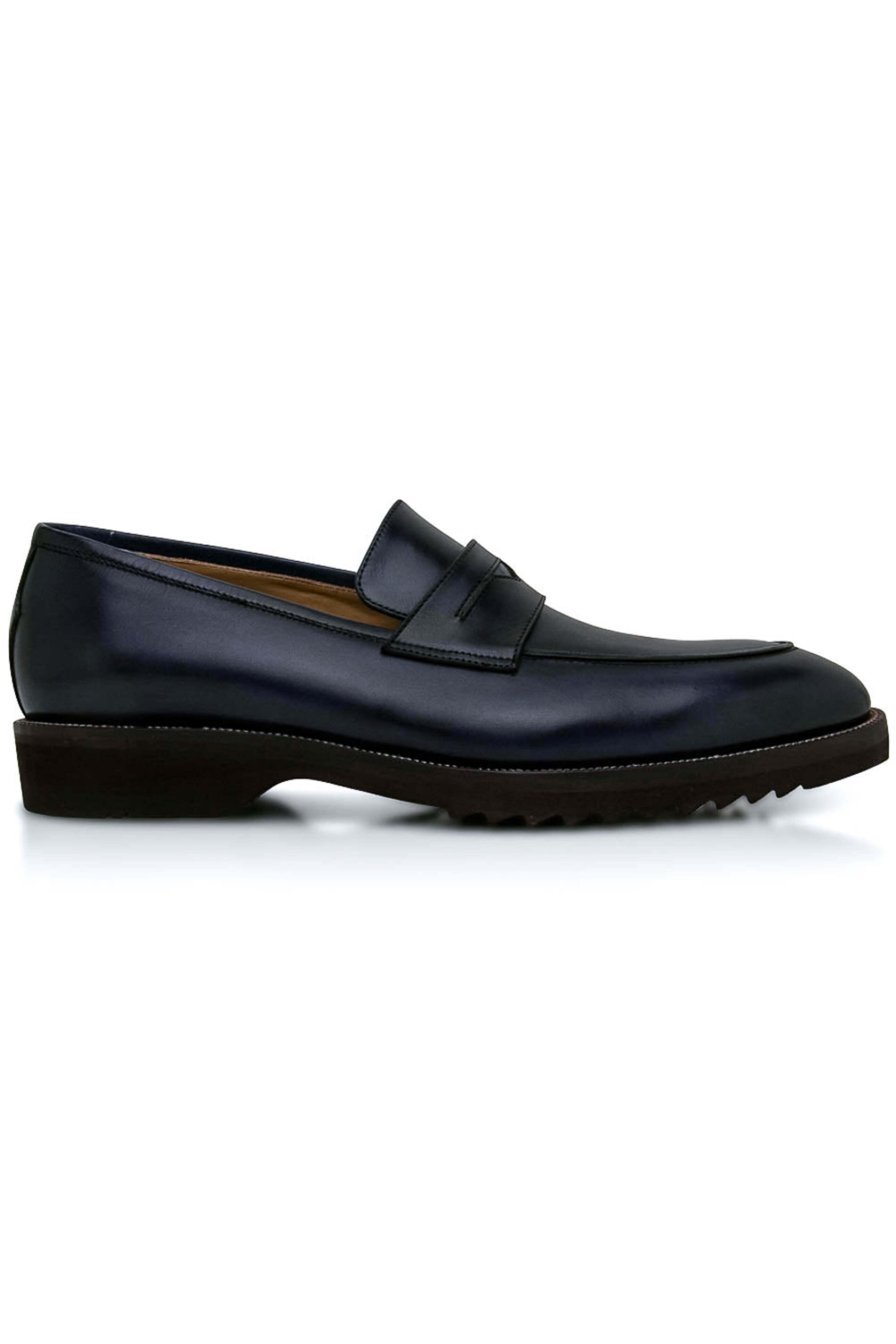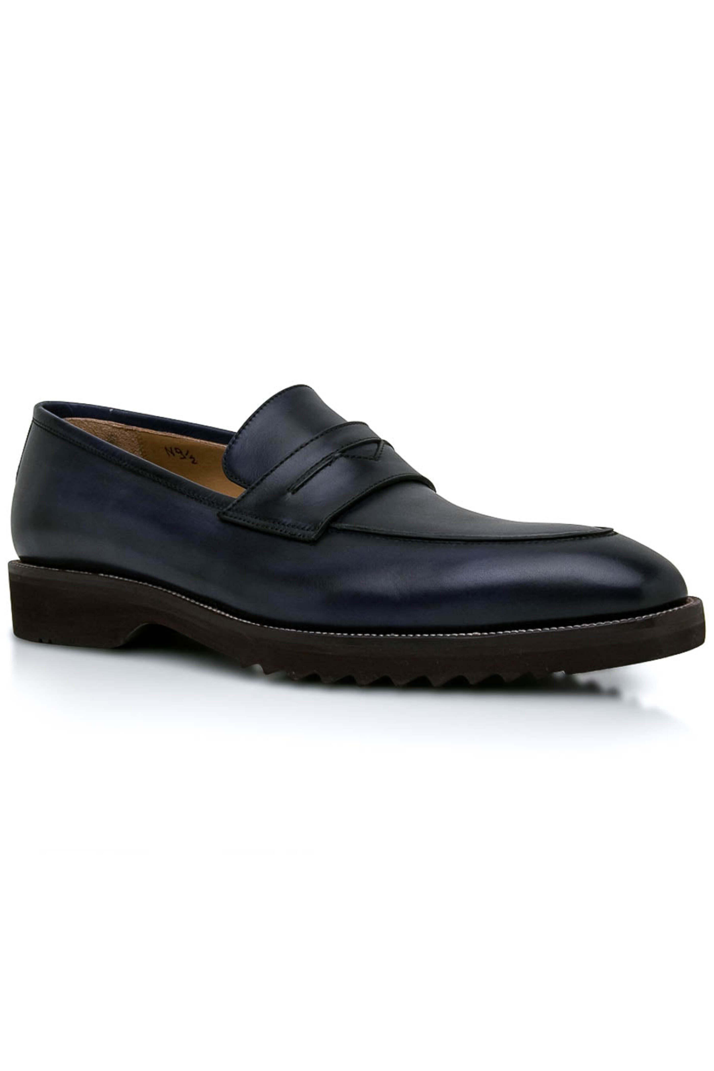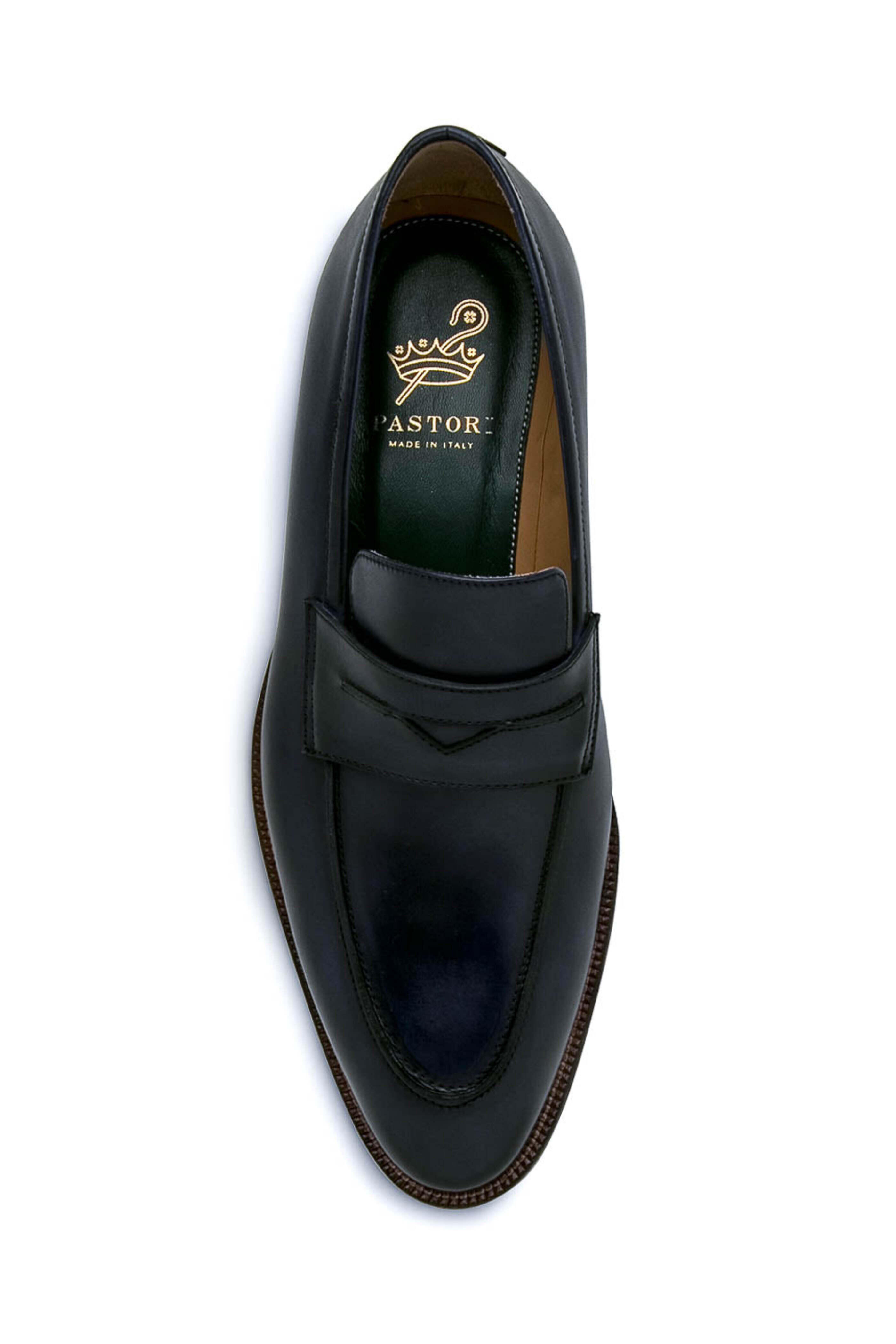 - Pastori Navy Blue Titus Loafer Calfskin leather upper Slip on style Almond toe Penney keeper at vamp Tonal stitching Leather lining and insole Cushioned footbed Rubber sole Made in Italy