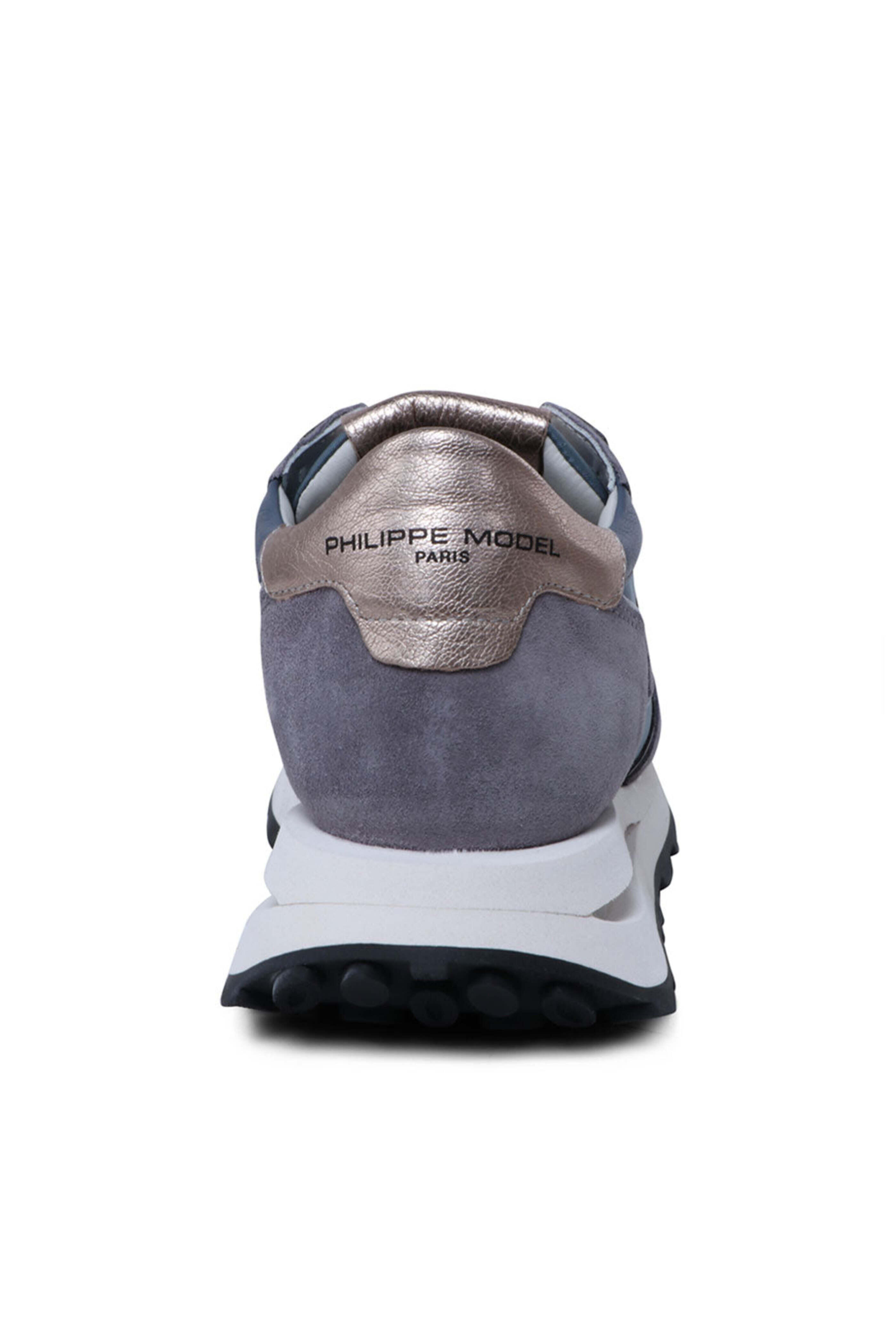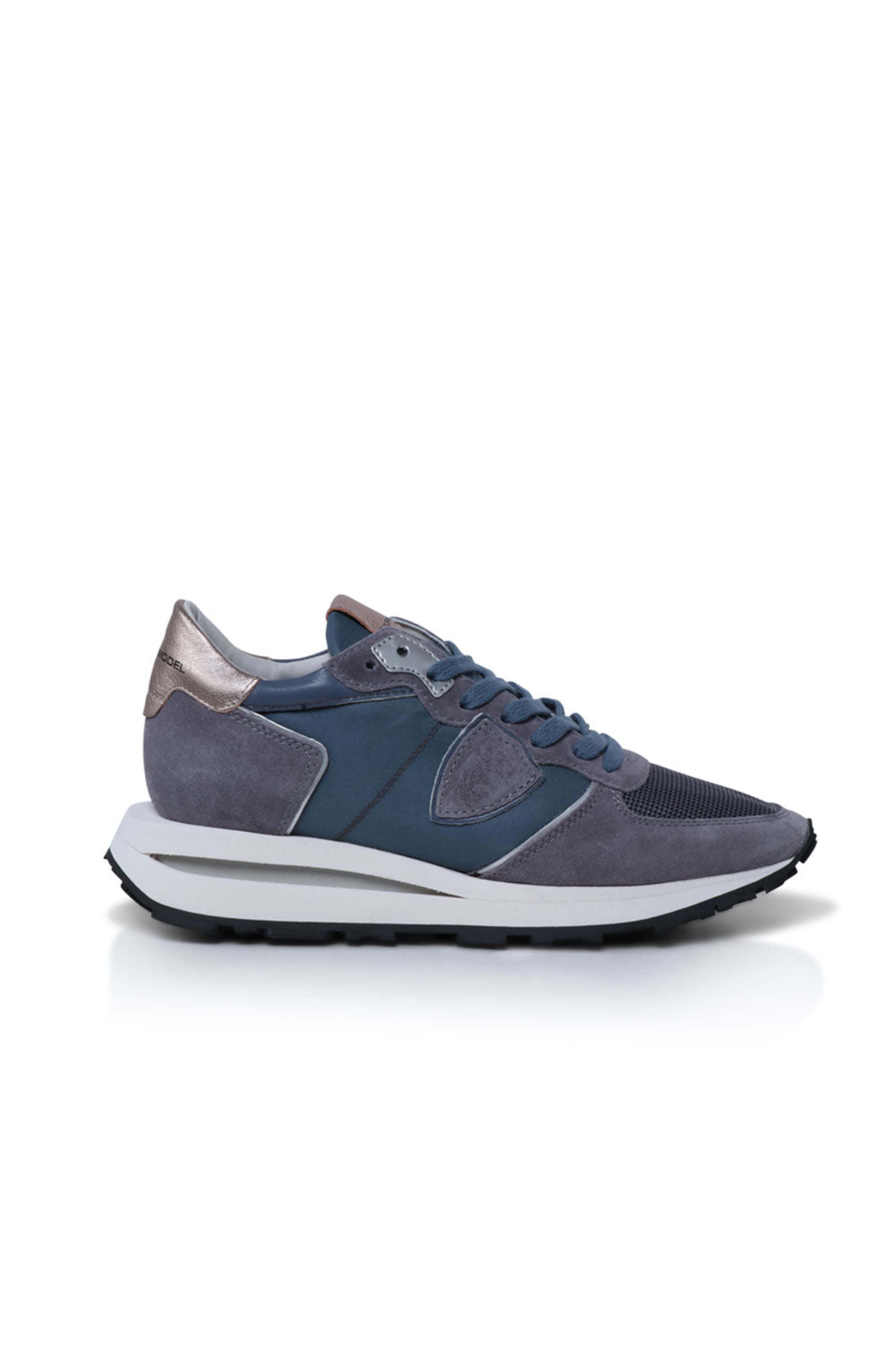 Philippe Model TRPX Haute Running Sneakers in Mondial Denim. Almond toe. Front lace-up fastening. Heel height 2.16. Sole height 1.77. Logo patch at the tongue. Appliqué logo. Contrasting branded heel counter. Branded footbed. Fabric and suede outer. Terry cloth fabric lining. Memory foam insole. Contrasting 3-D insert under heel. Rubber sole. Made in Italy.
