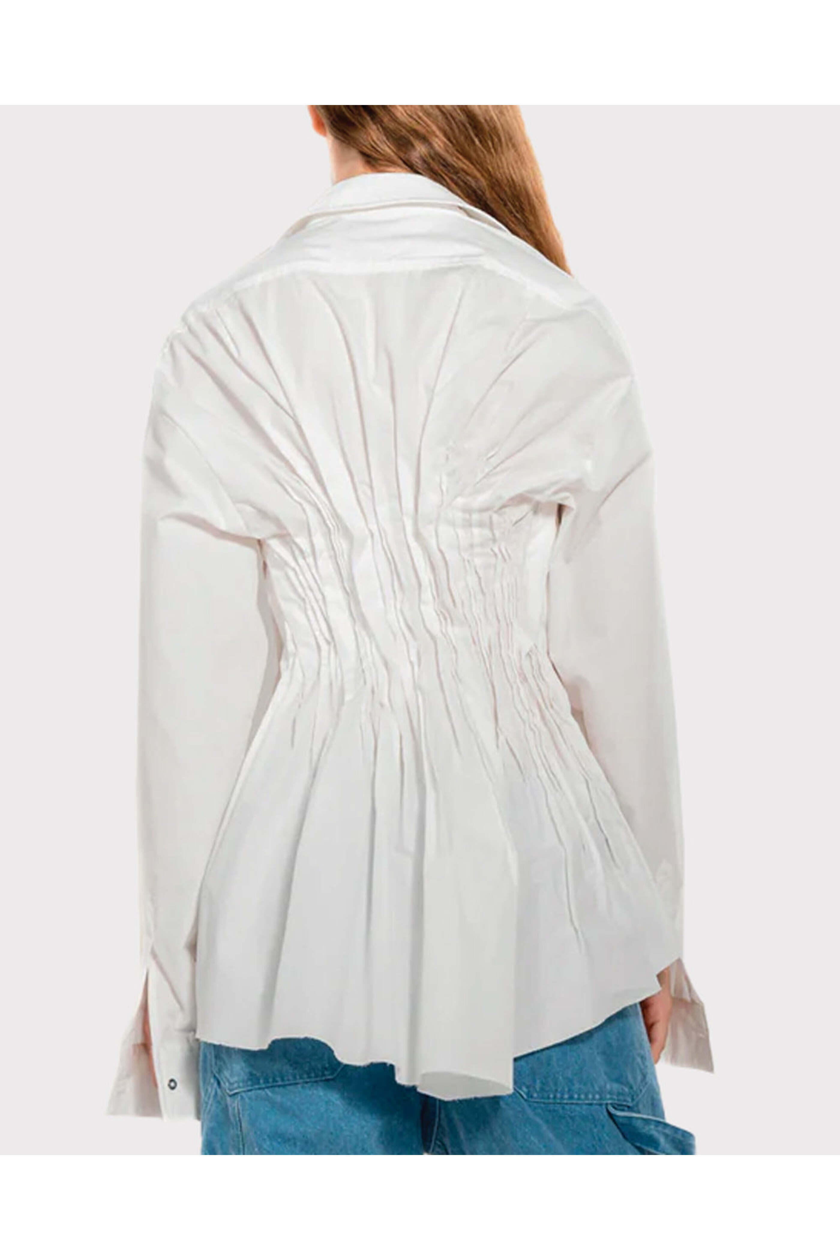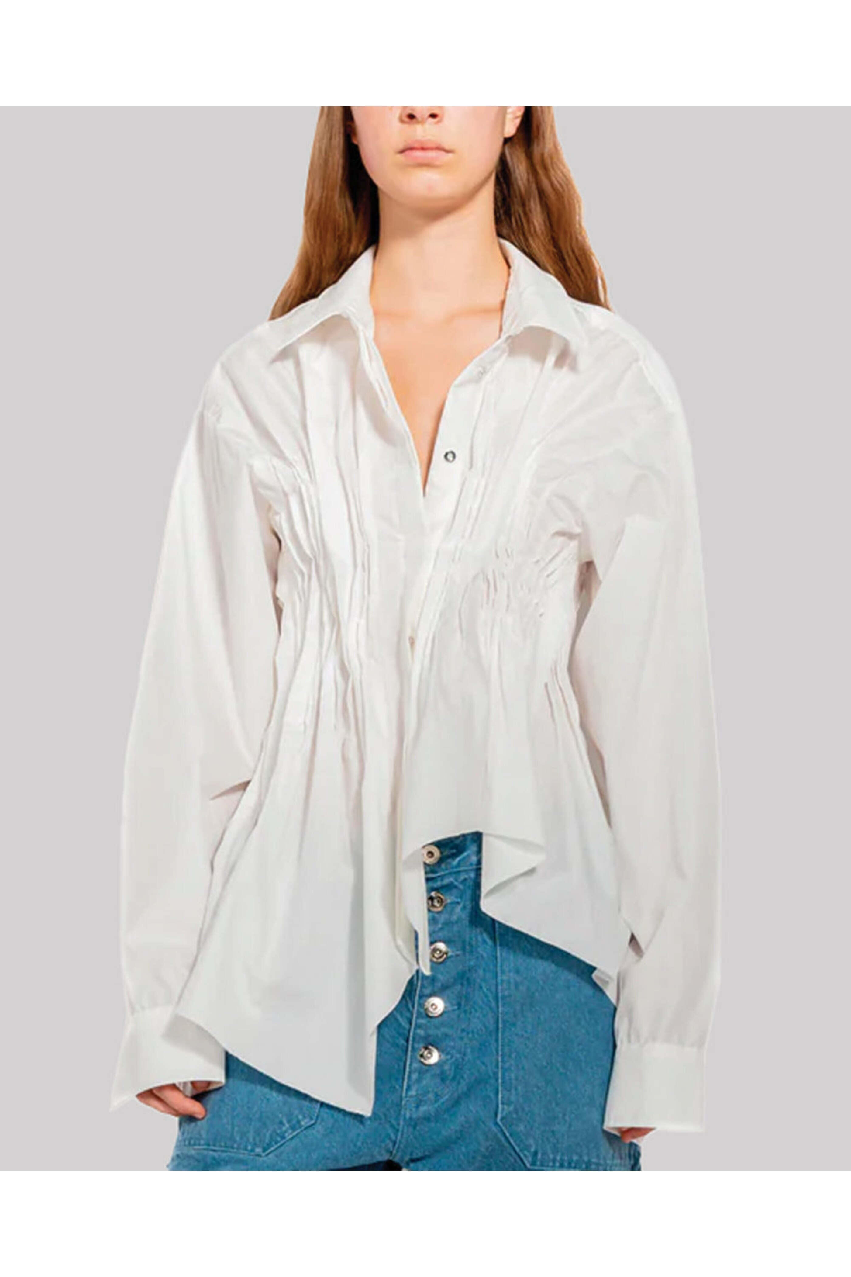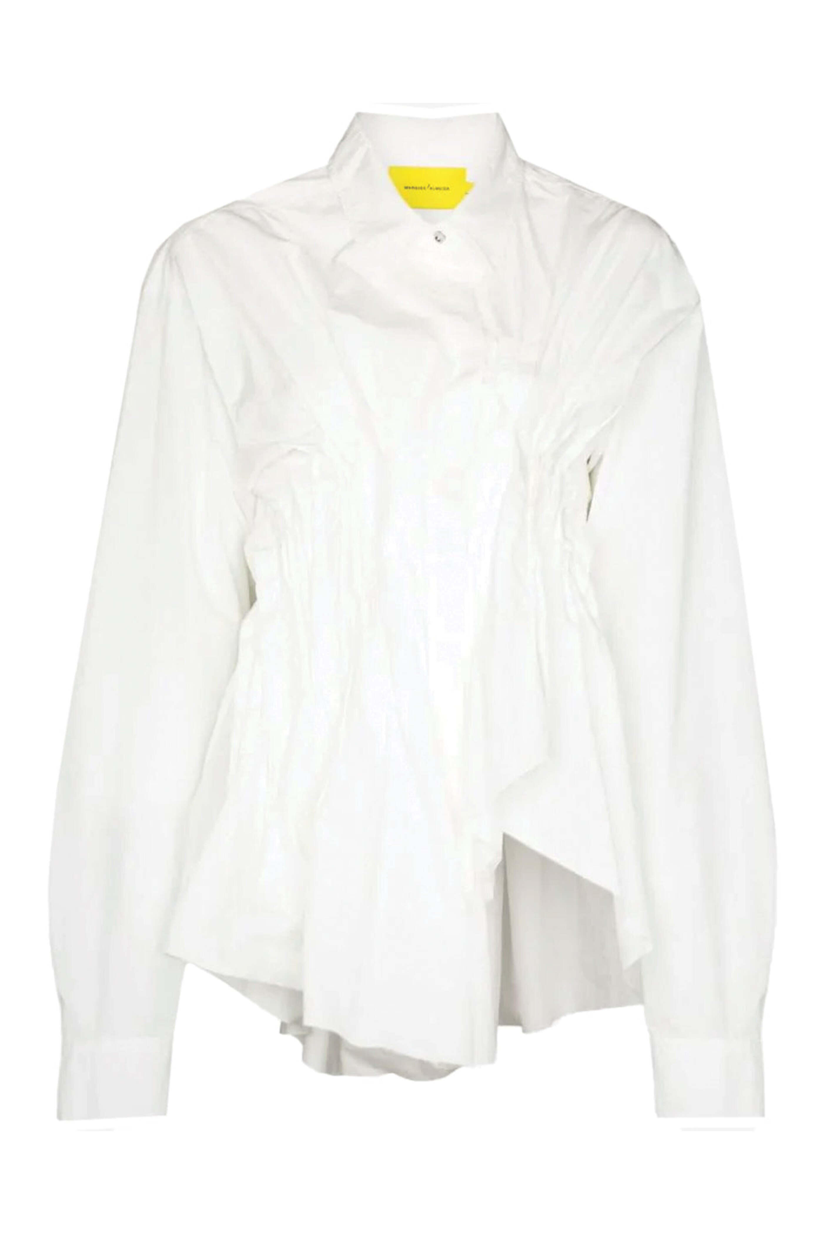 Marques ' Almeida White Cinch Pleated Shirt. Collar. Long sleeves; button cuffs. Concealed button front closure. Pleated waist detail. Slim through waist; flare handkerchief hem. Raw trim. Lightweight denim fabrication. 100% organic cotton.