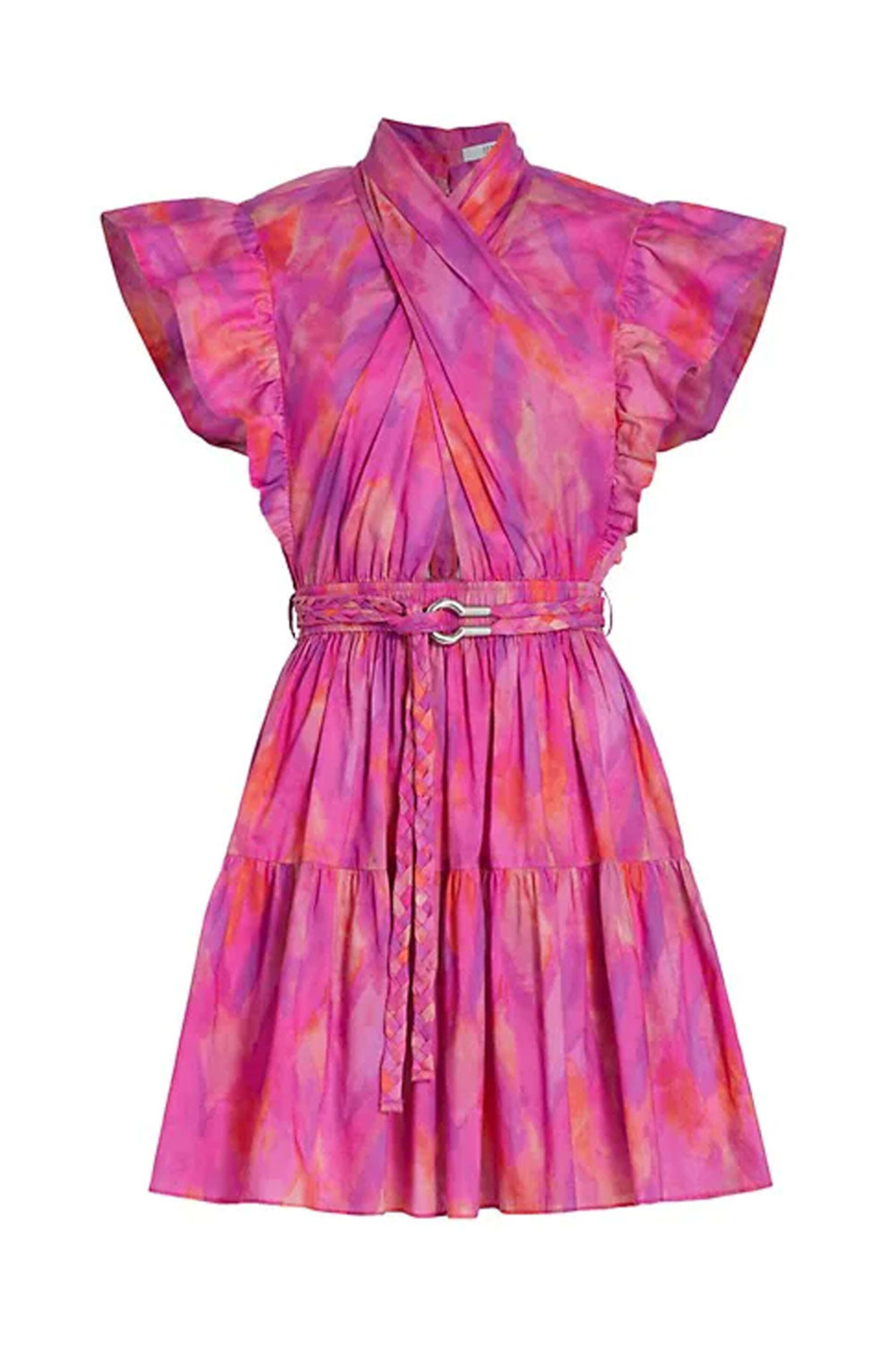 Derek Lam 10 Crosby Fuchsia Multi Finn Ruffle Wrap Dress. High neck. Wrap front. Neck button closure. Short flutter sleeves. Cut out at waist. Belted waist. Tiered silhouette. Mini length. 100% cotton.