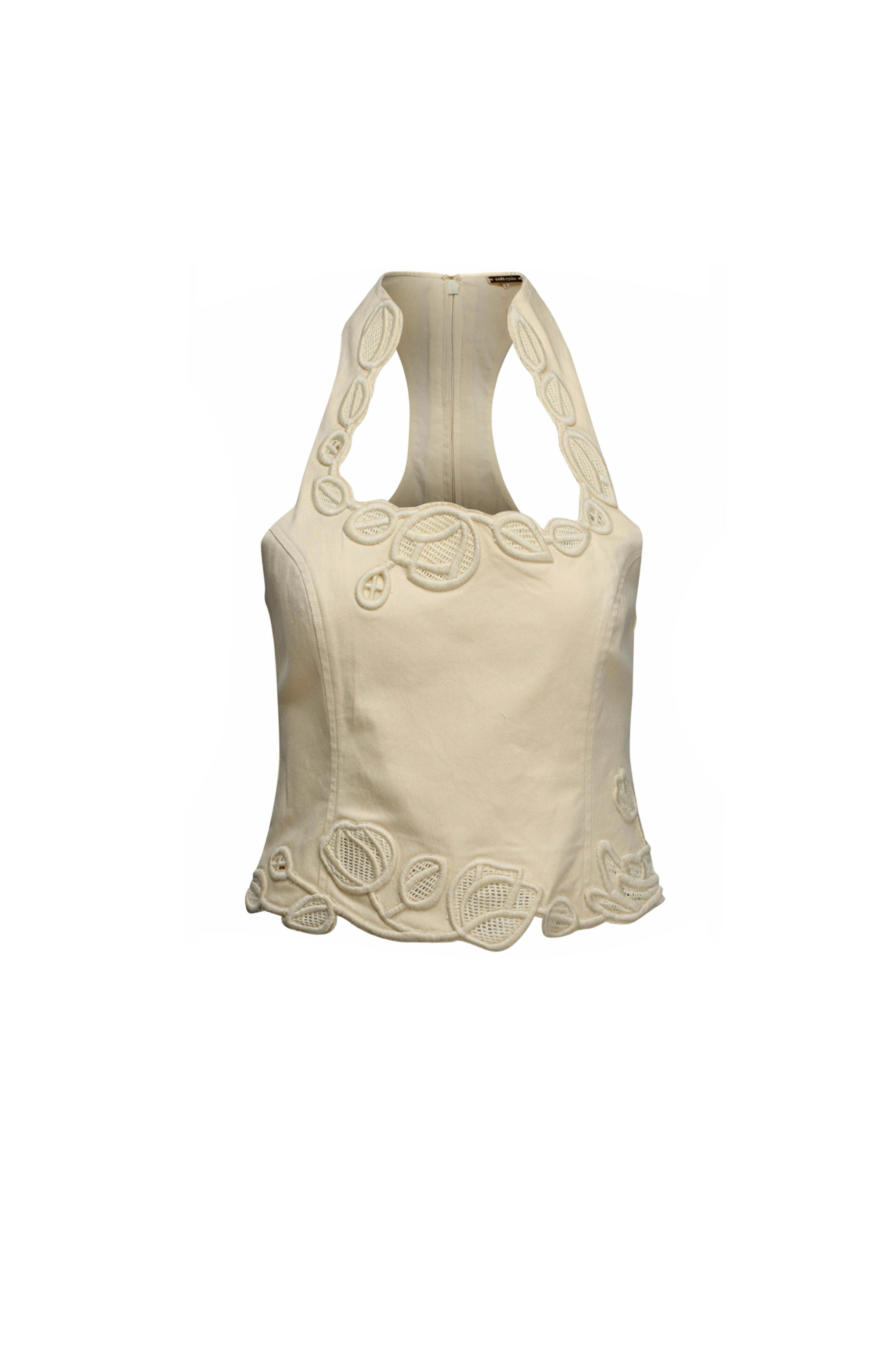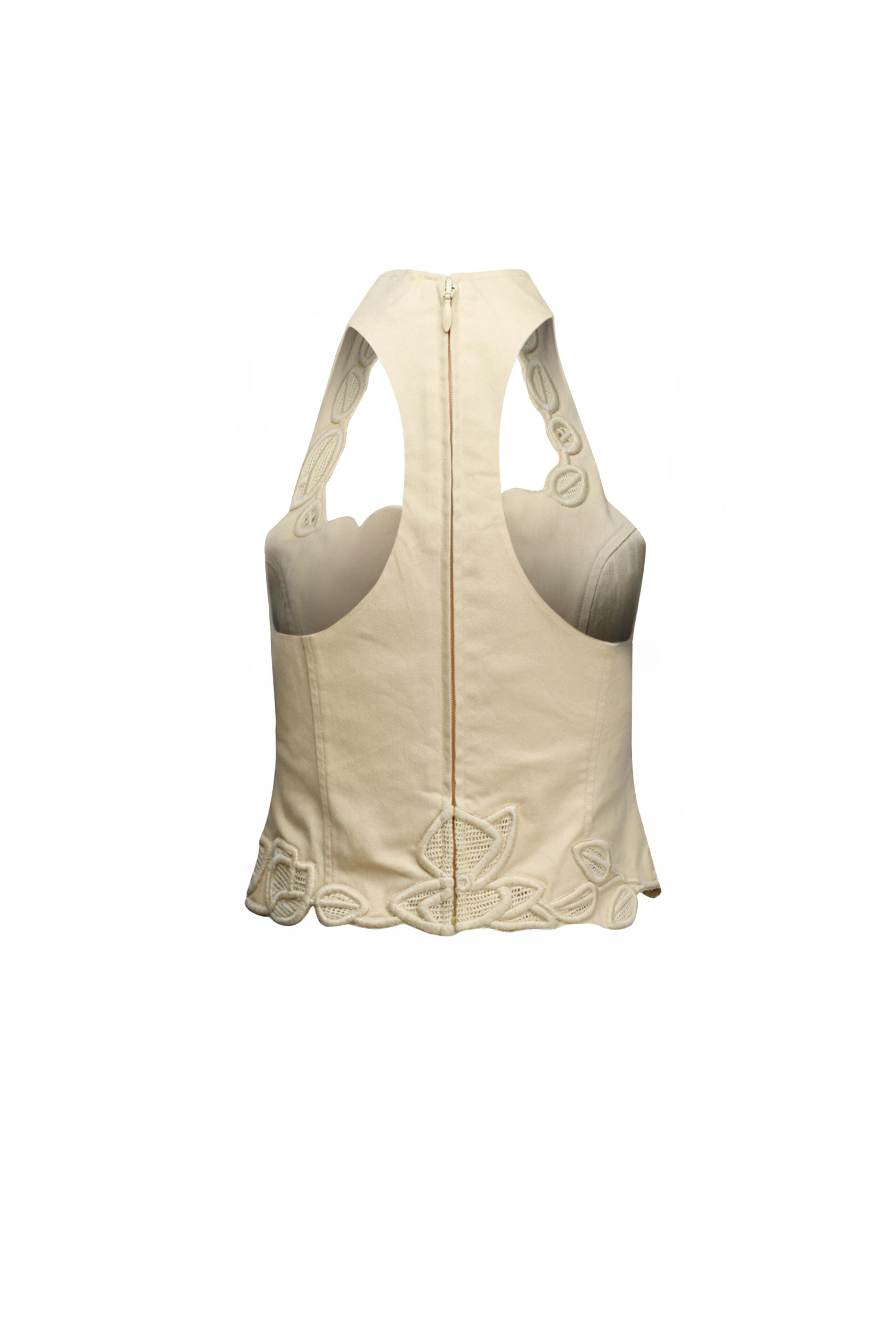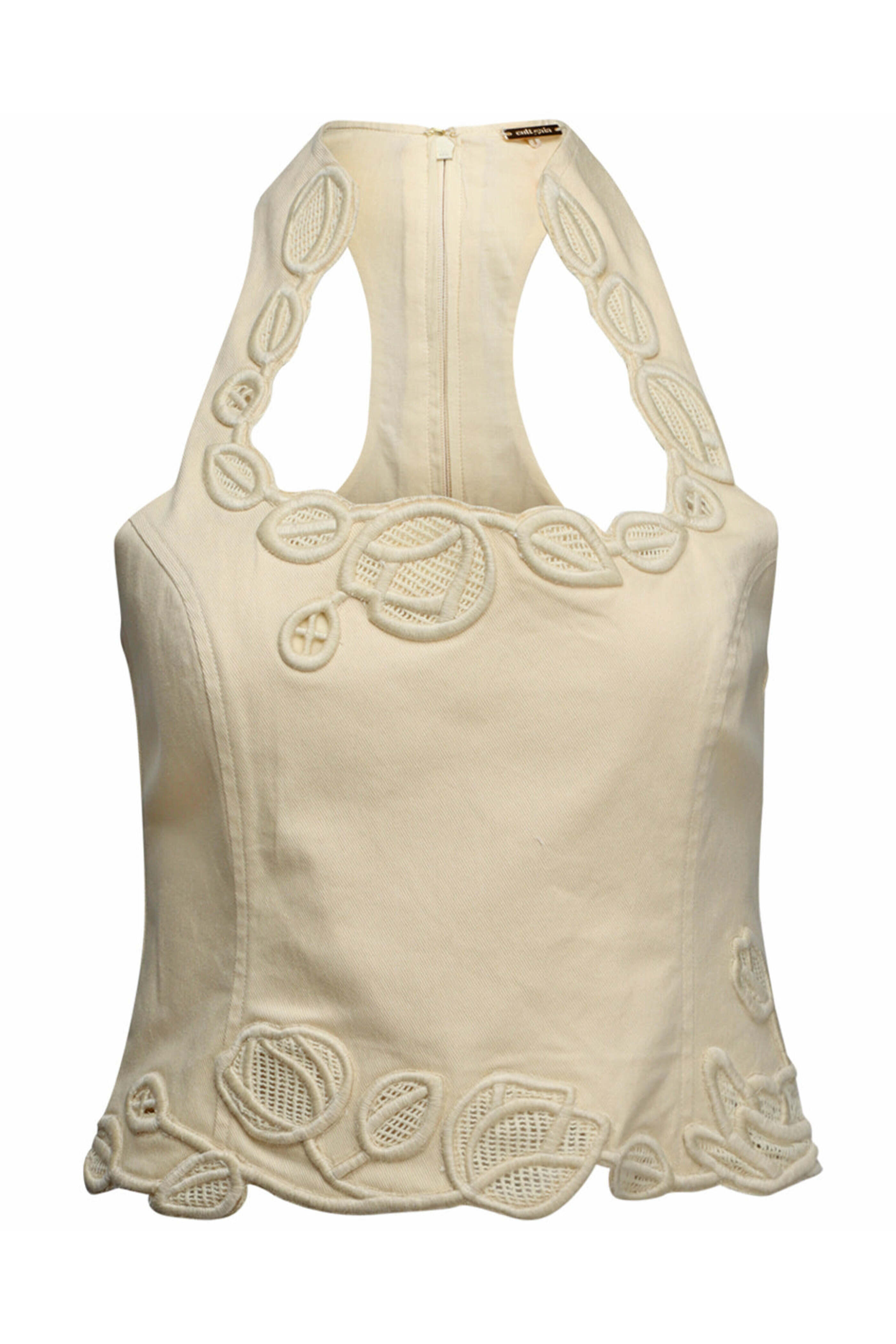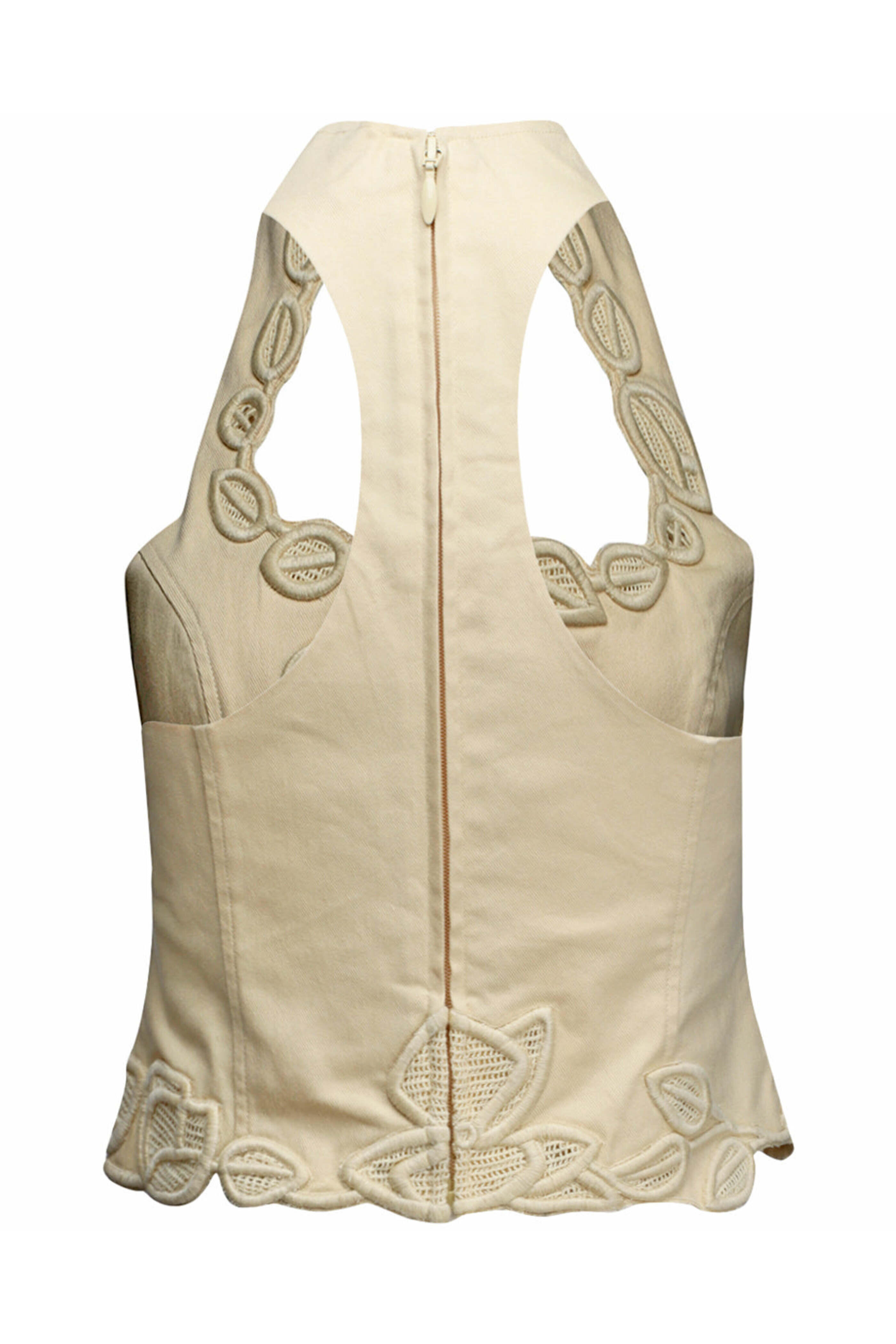 Cult Gaia Tapestry Ruthie Top. Square neck. Racerback. Sleeveless. Back zip closure. Cropped length. Lace embroidery. Lined. 97% cotton, 3% spandex outer, 100% cotton lining.