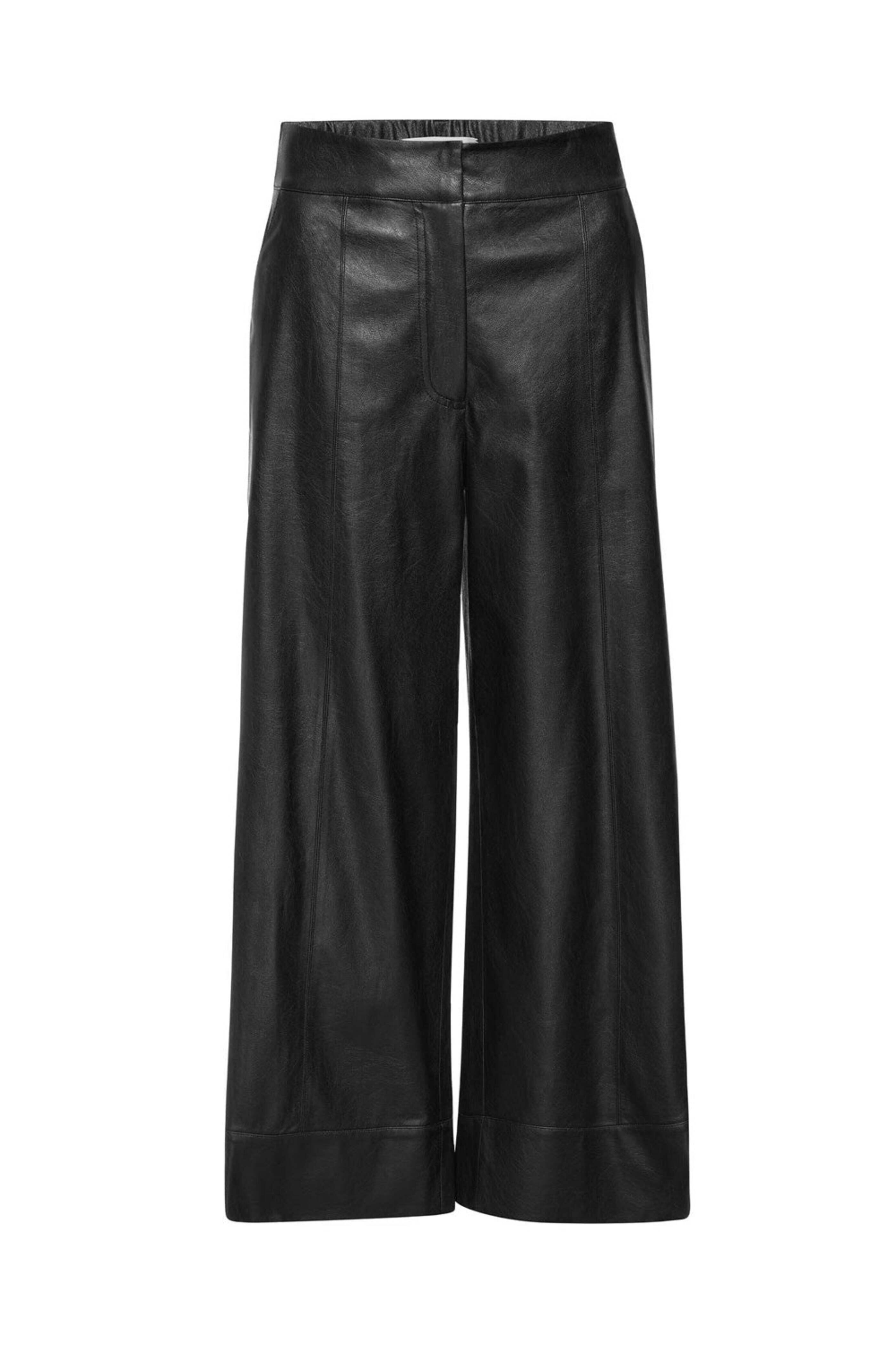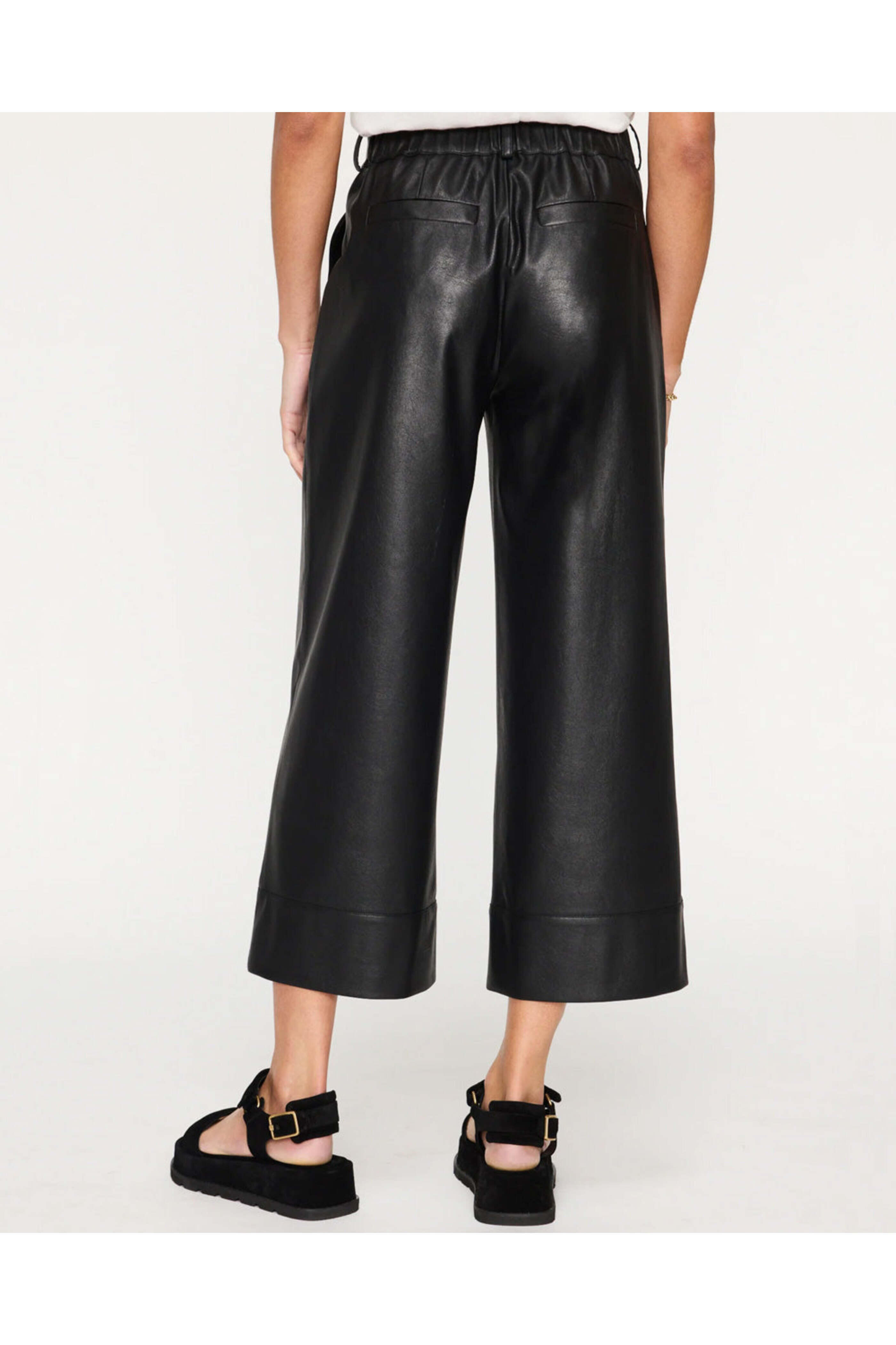 Brochu Walker Black Onyx Vegan Leather Odele Cropped Pant. High rise. Hook and eye closure. Elastic back waist. Zip fly. Belt loops. Side slip pockets. Back welt pockets. Wide through leg. Cropped length. Vegan leather. 87% polyester, 13% polyurethane.