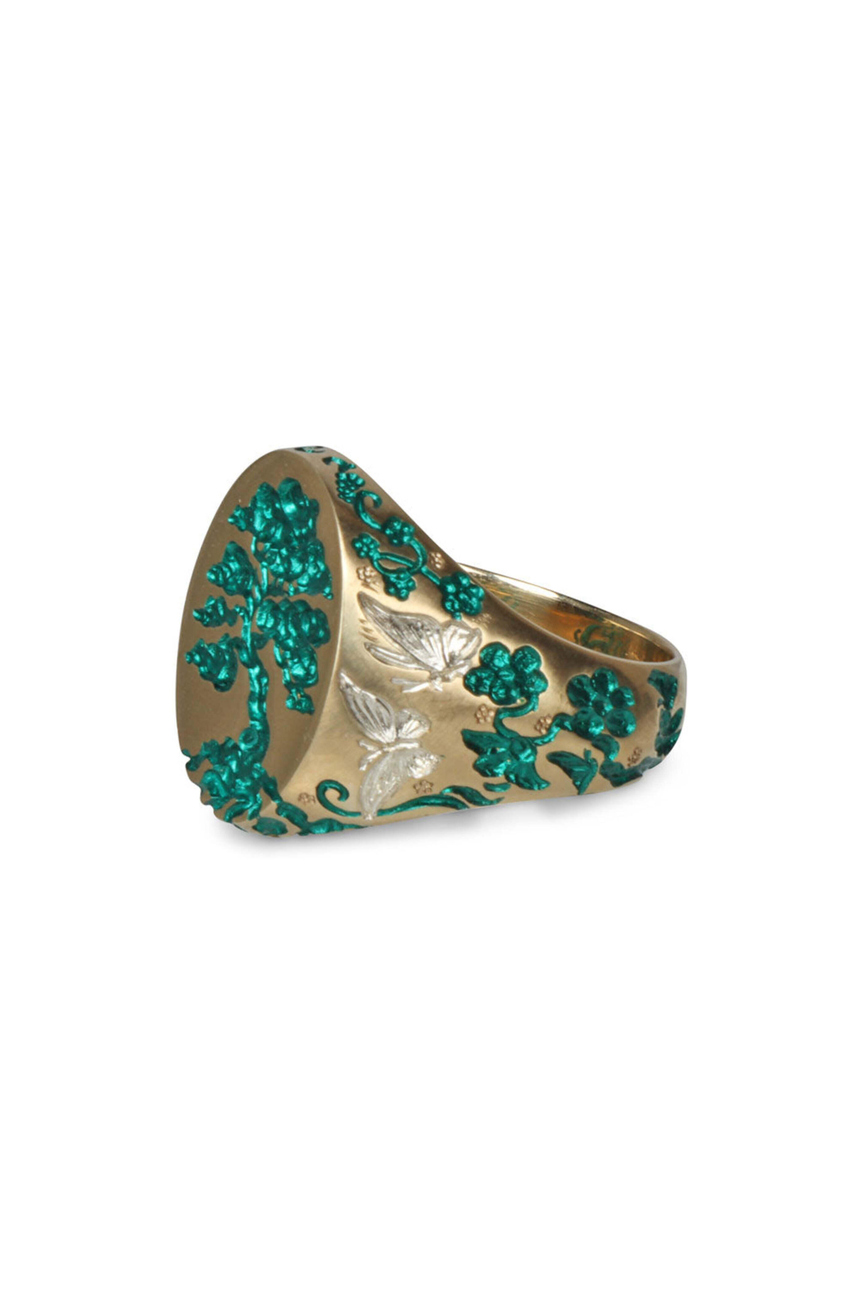 9k yellow gold. White gold. Emerald engraving. Hand engraved tree. Carved branch and butterfly elements gracefully climbing on each side. Handmade in London. Ring size: 7.25. 0.67" x 0.59".