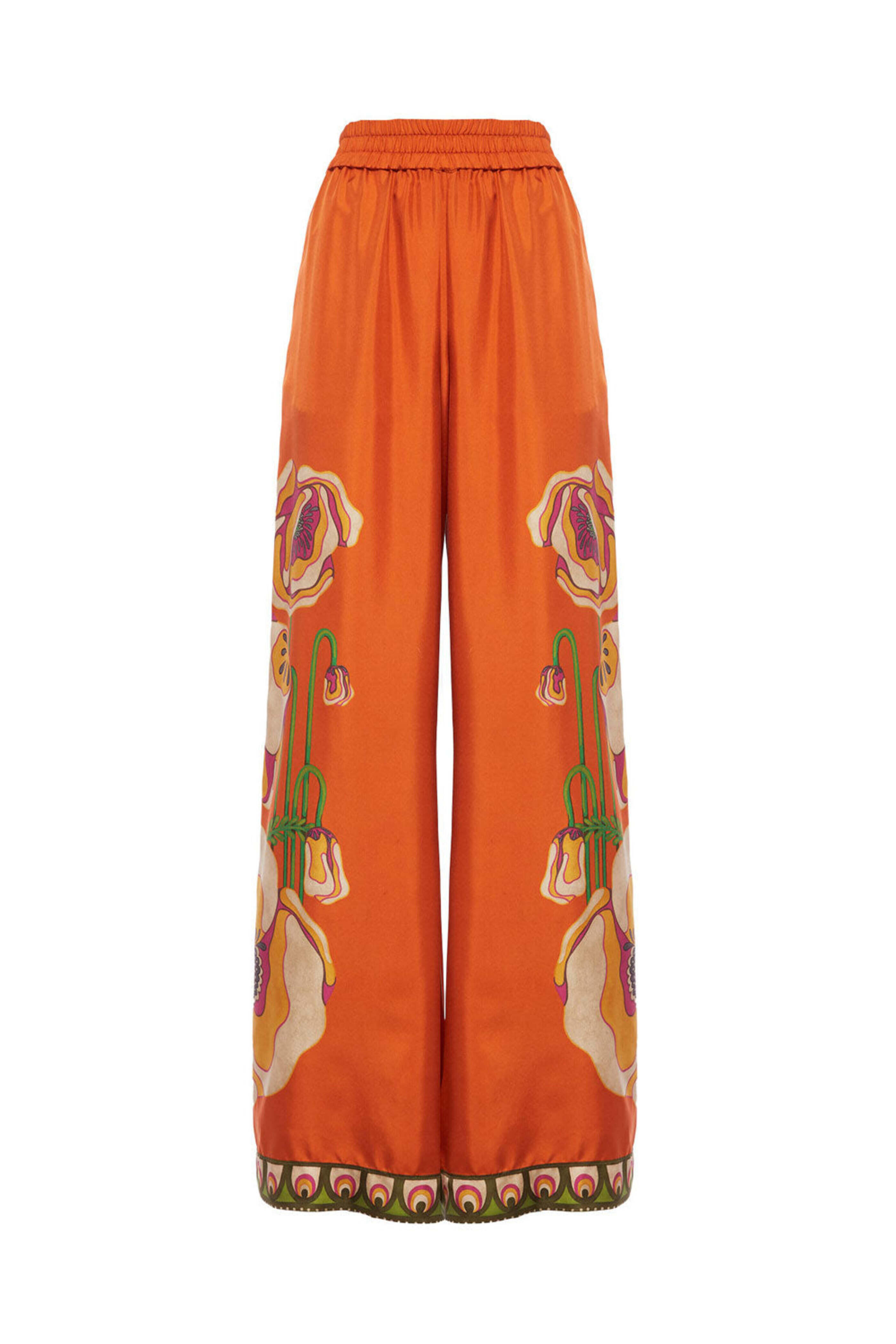 La DoubleJ Poppies Orange Placee Palazzo Pant. High rise. Elastic waist. Side slip pockets. Wide through leg. Full length. Made in Italy. 100% silk.