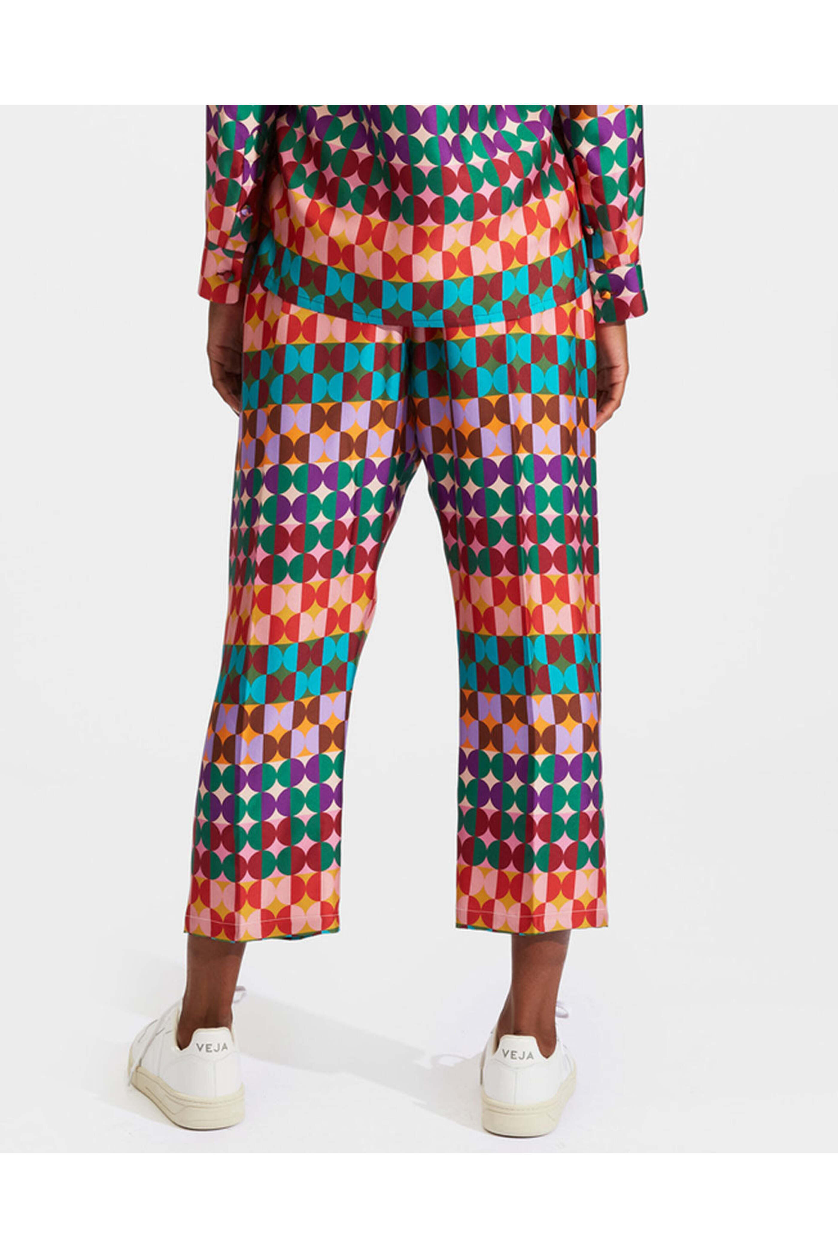 La DoubleJ Rainbow Mezzaluna Drawstring Pant. Mid rise. Drawstring waist. Side slip pockets. Straight through leg. Cropped length. Silk fabrication. Made in Italy. 100% silk.