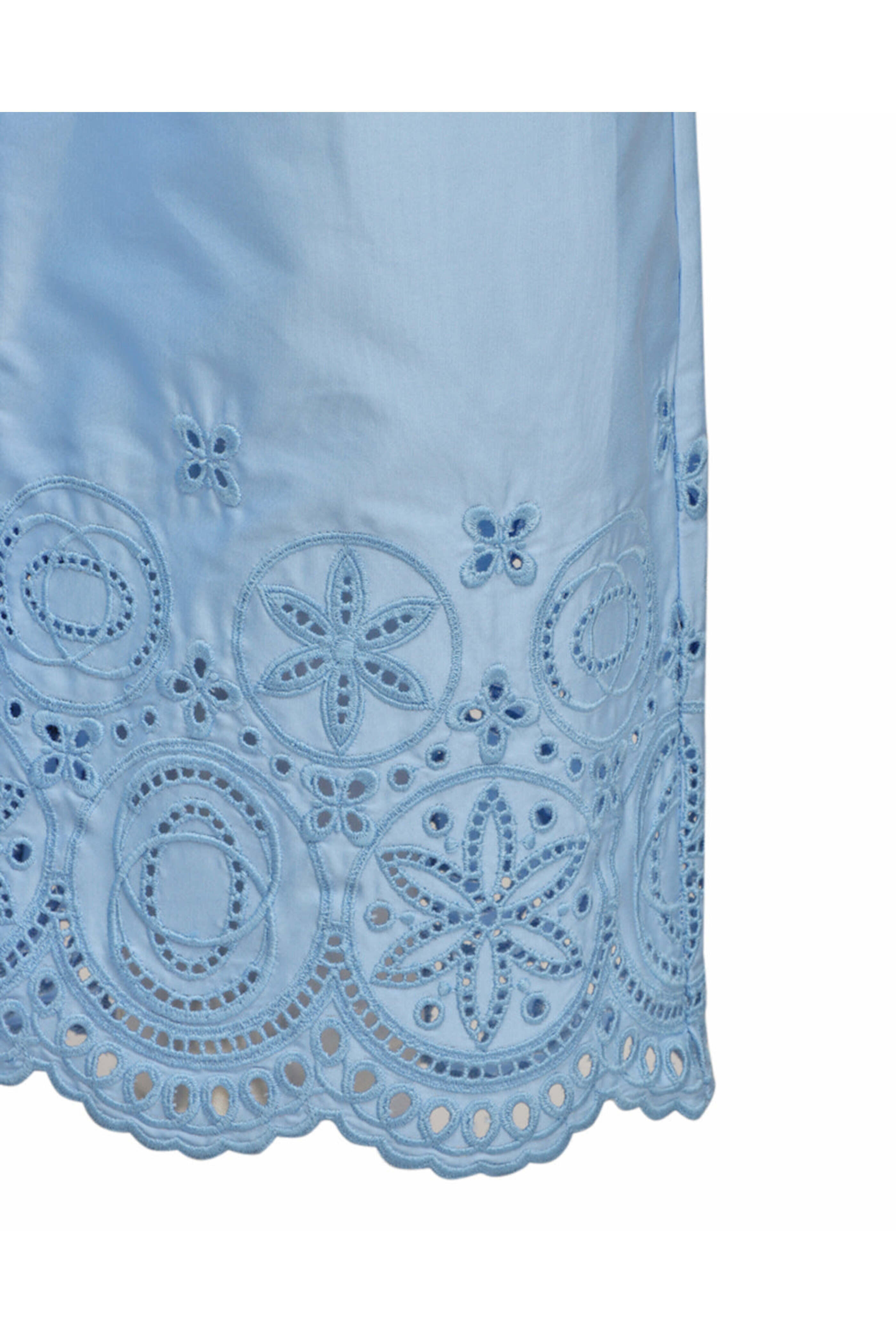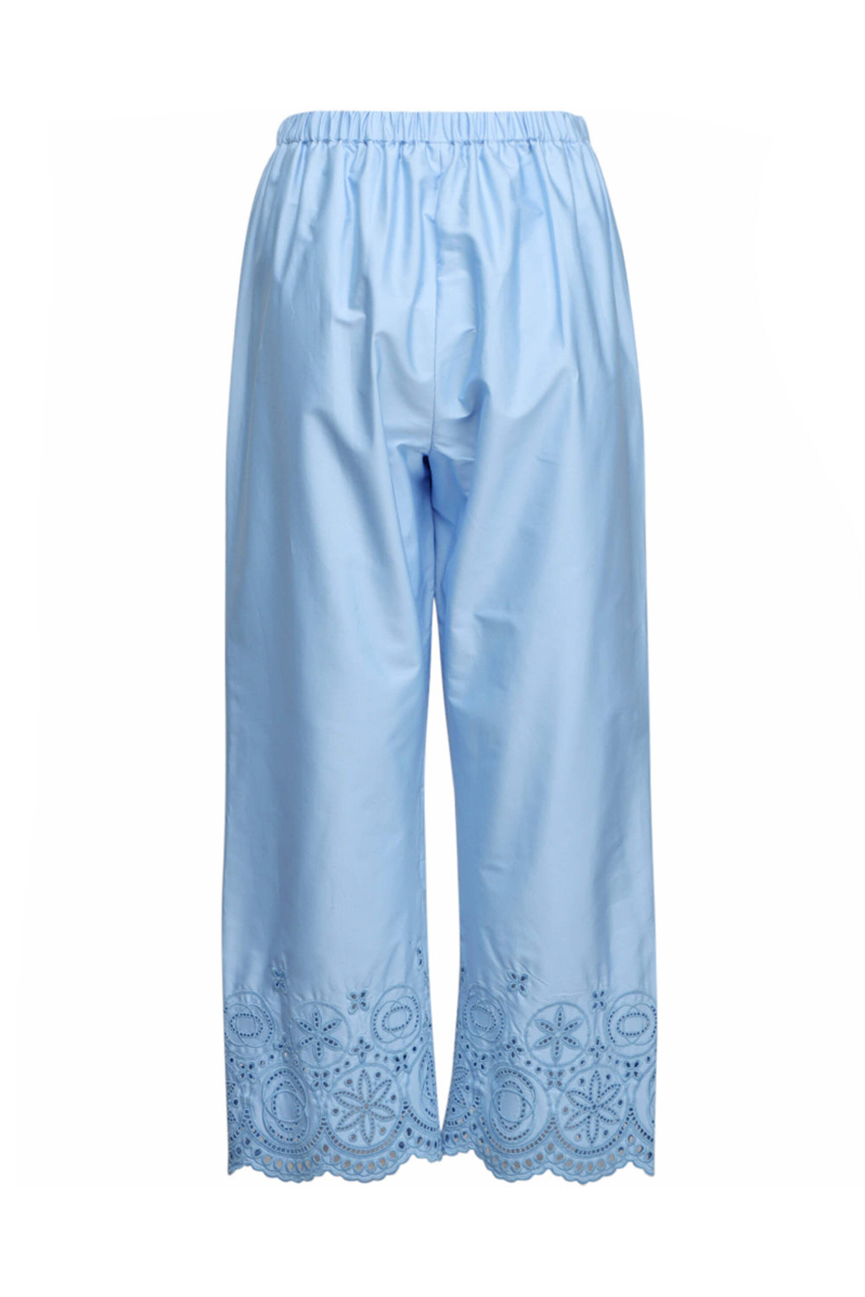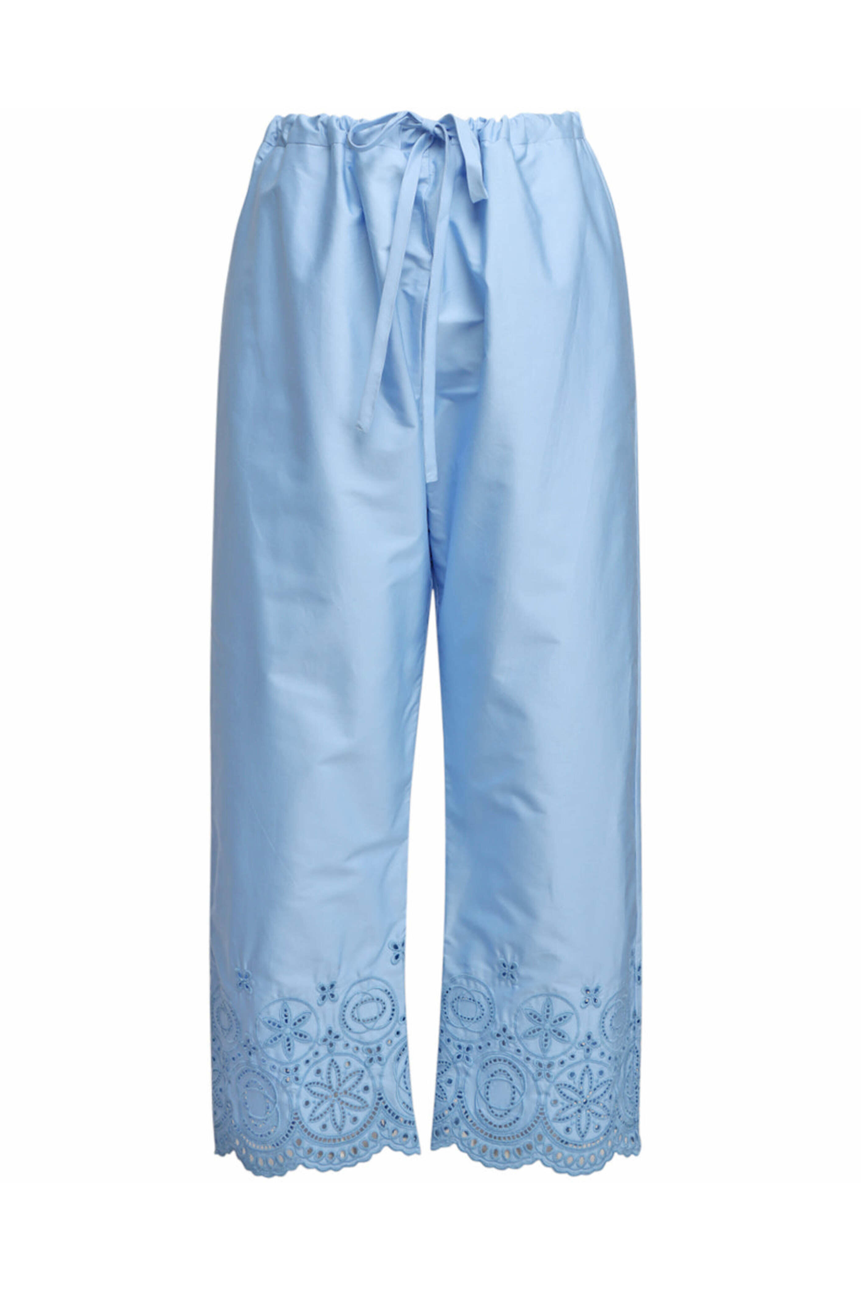 La DoubleJ Eclipse Eyelet Drawstring Pant. Mid rise. Self-tie drawstring waist. Side slip pockets. Straight silhouette. Cropped length. Eyelet embroidered hem detail. Made in Italy. 100% cotton.