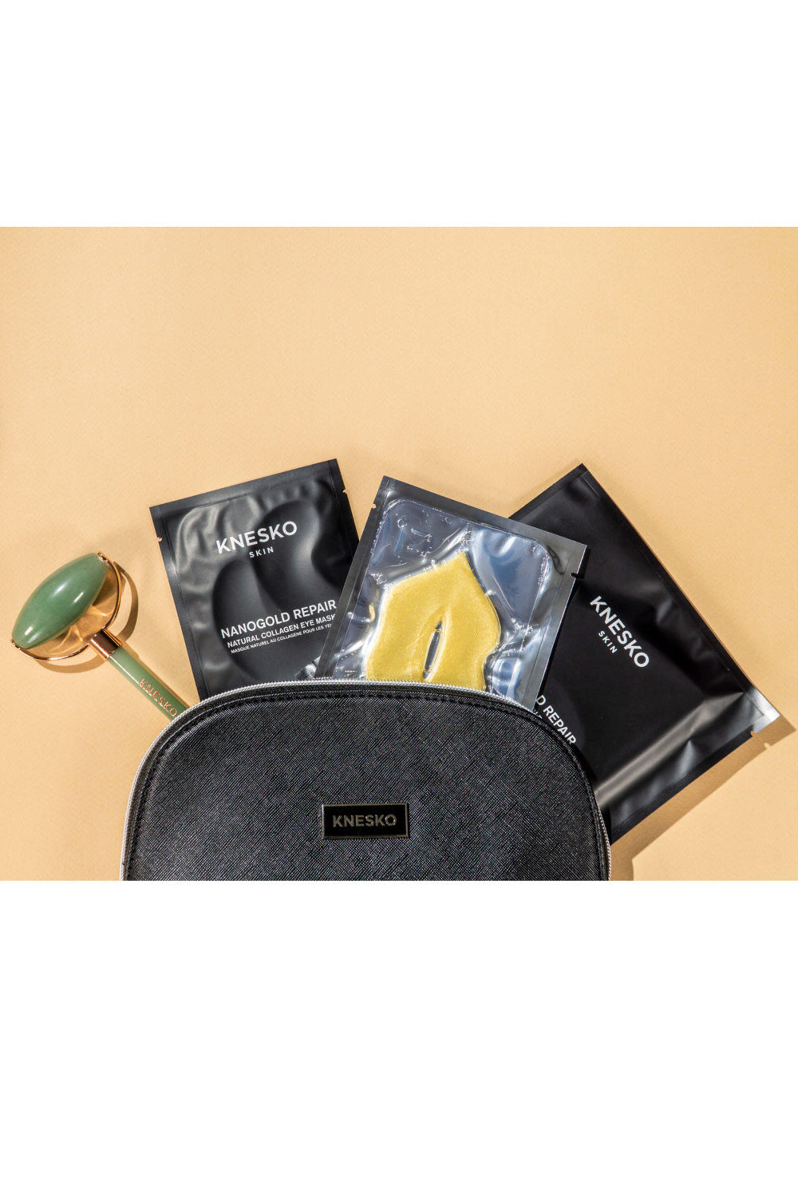 - Includes: 1 Gold face mask, 1 Gold eye mask, 1 Gold collagen lip mask, 1 Green Jade Gemstone Roller, and a Limited Edition KNESKO Cosmetic bag