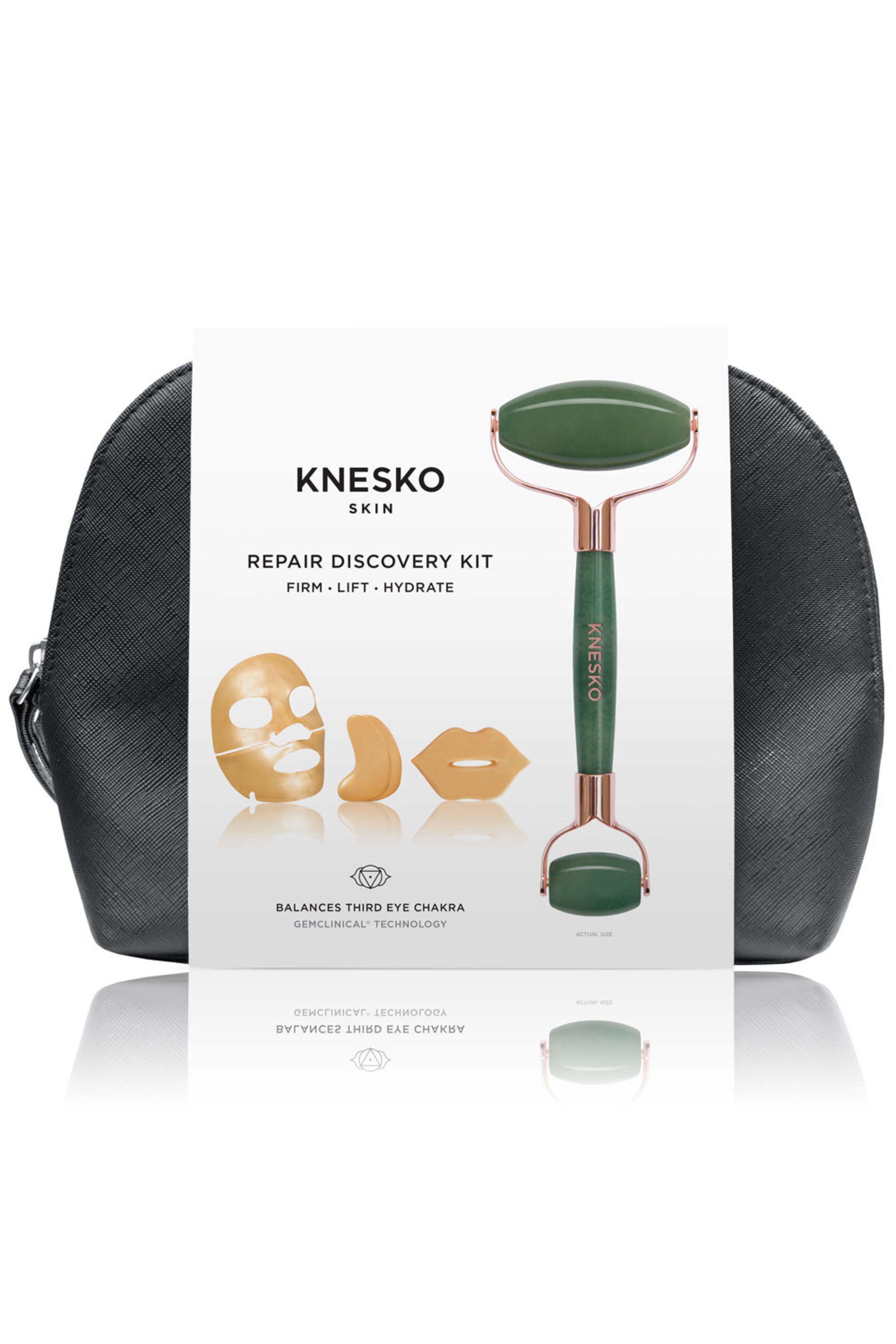 Knesko Skin Repair Discovery Kit. Includes: 1 Gold face mask, 1 Gold eye mask, 1 Gold collagen lip mask, 1 Green Jade Gemstone Roller, and a Limited Edition KNESKO Cosmetic bag. Every mask in this gorgeous set is Reiki-charged and made with our very own doctor-formulated GEMCLINICAL® serum infused with colloidal gold to encourage fast absorption deep within the skin.. This best-selling Nano Gold collection helps address common areas of concern such as fine lines, loss of elasticity, and dryness. Gold nanoparticles combined with natures finest skincare gift of aloe vera is the perfect antidote to inflamed and redness-prone skin.