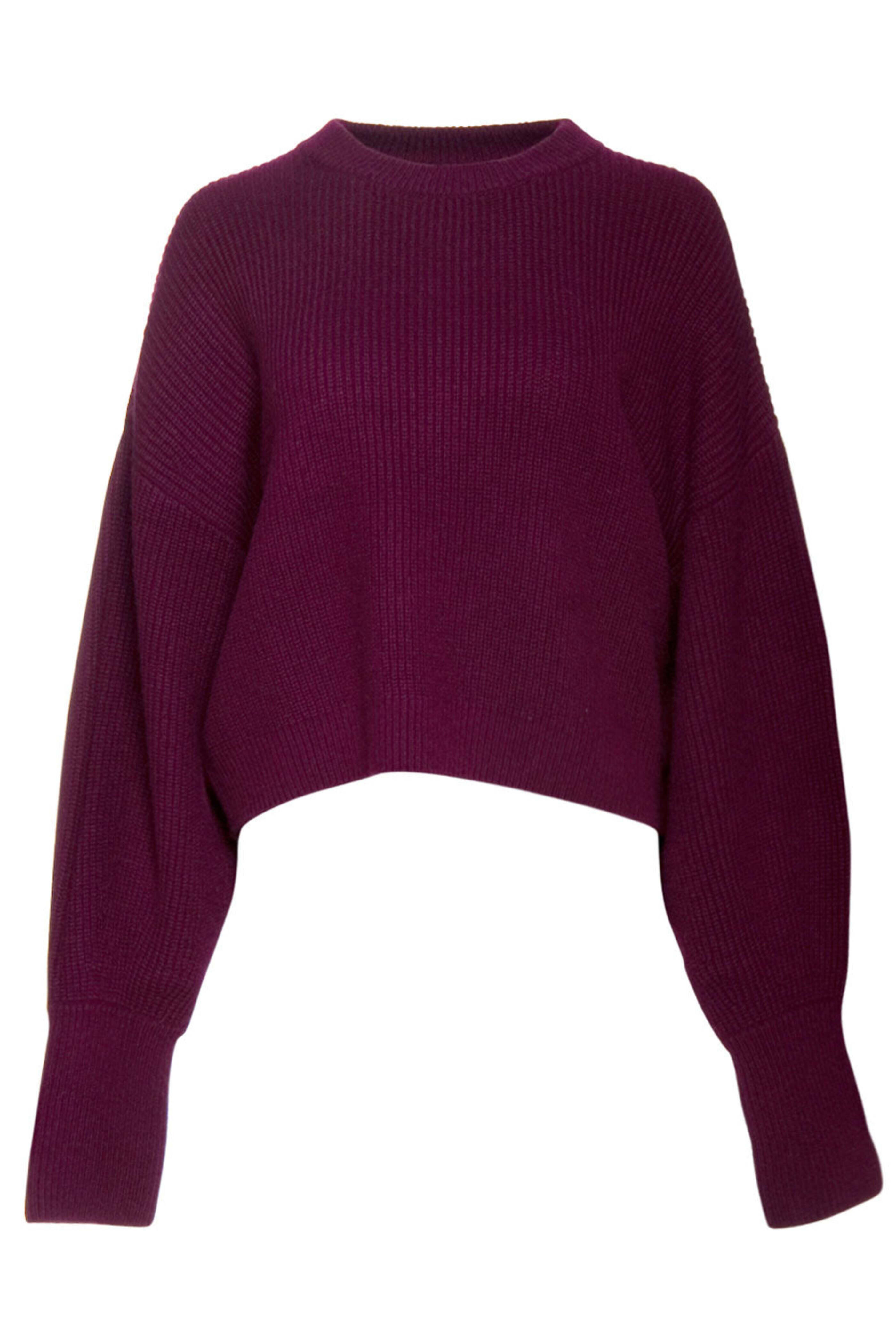 The Sei Plum Long Sleeve Sweater. Crew neck. Drop shoulder. Long sleeves. Boxy fit. Cropped length. Ribbed knit fabrication. Unlined. 47% merino wool, 38% viscose, 10% nylon, 5% cashmere.