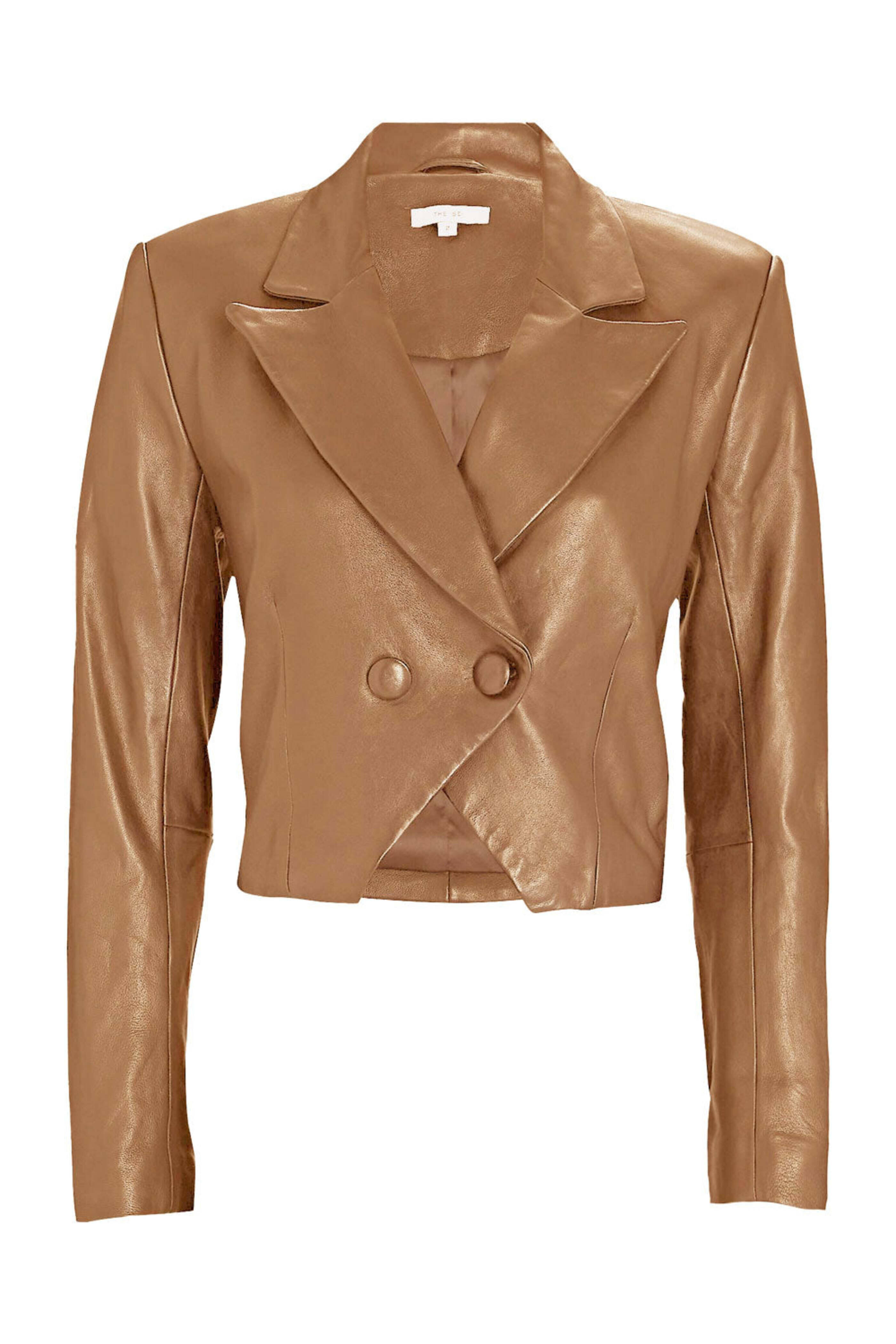 The Sei Chestnut Leather Cropped Blazer. Notched lapels. Long sleeves. Double breasted closure. Tonal buttons. Asymmetrical front. Cropped length. Lined. 100% lambskin leather outer, 96% polyester, 4% elastane lining.