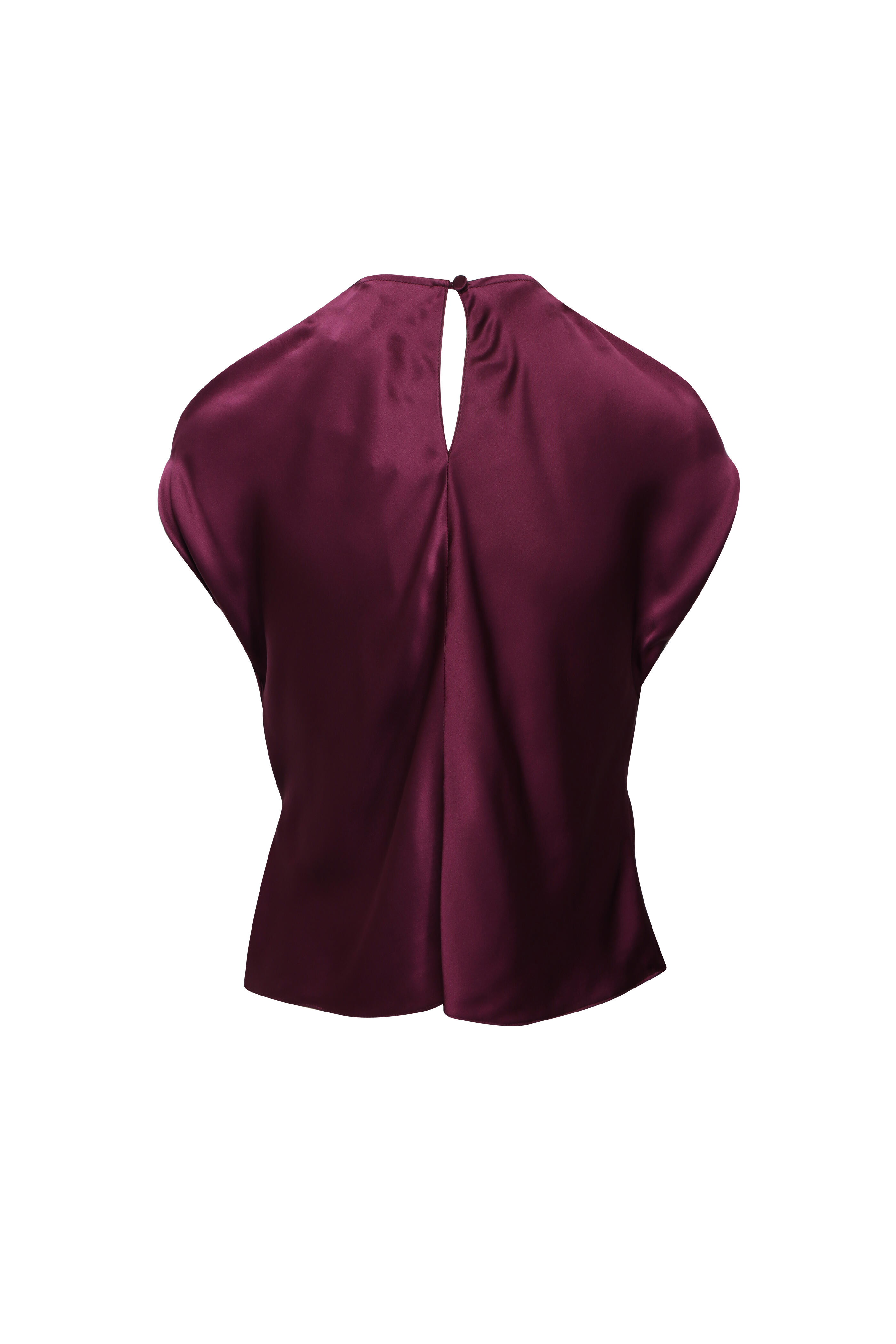 High rise. Back button closure; keyhole detail. Short dolman sleeves. Drape detail. Satin fabrication. Imported. 100% silk. Dry clean.