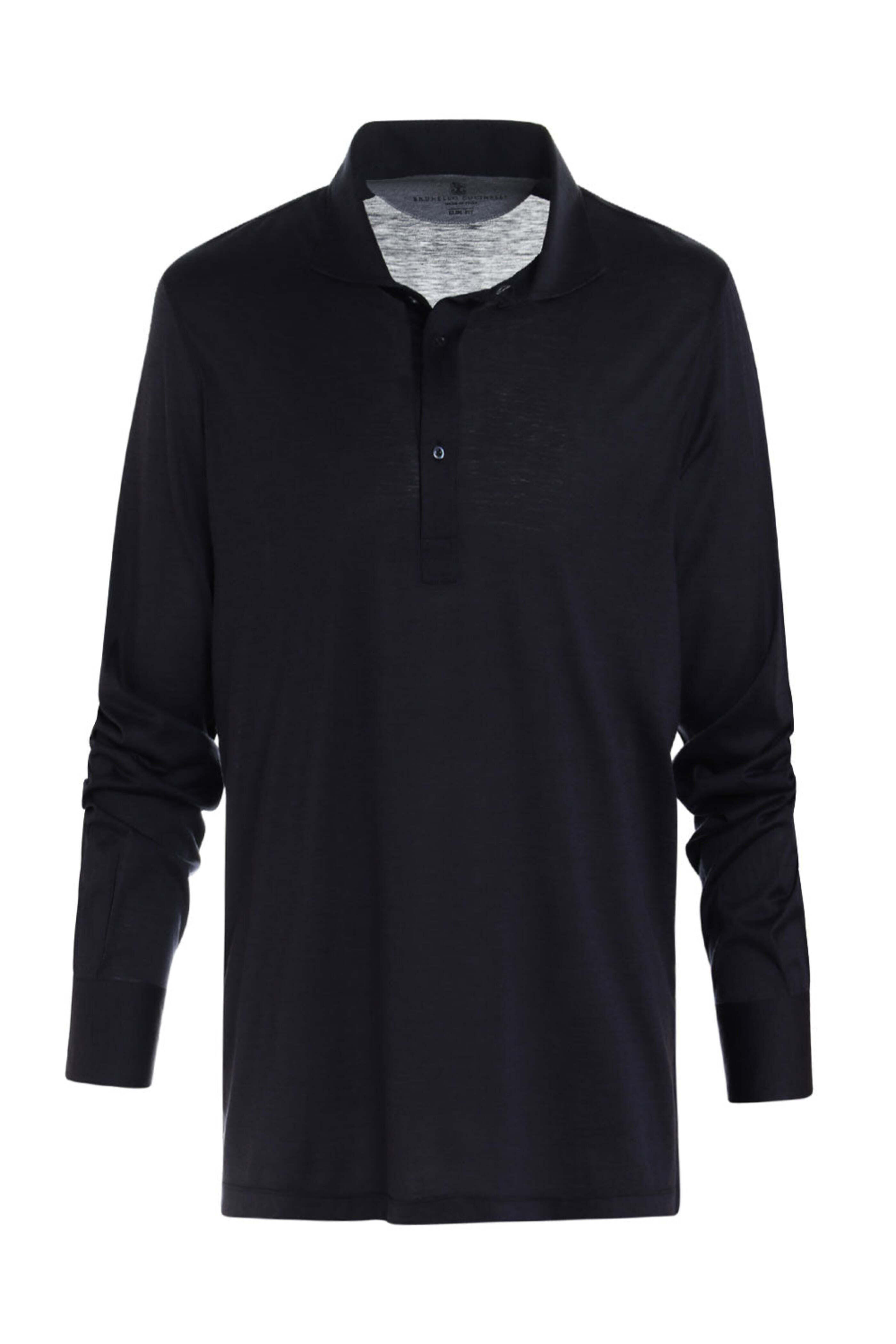 Brunello Cucinelli Navy Silk Blend Long Sleeve Polo. Spread collar. Three button placket. Long sleeves. Side vents. Tonal stitching. Straight hem. Slim fit. Made in Italy. 62% silk 38% cotton.