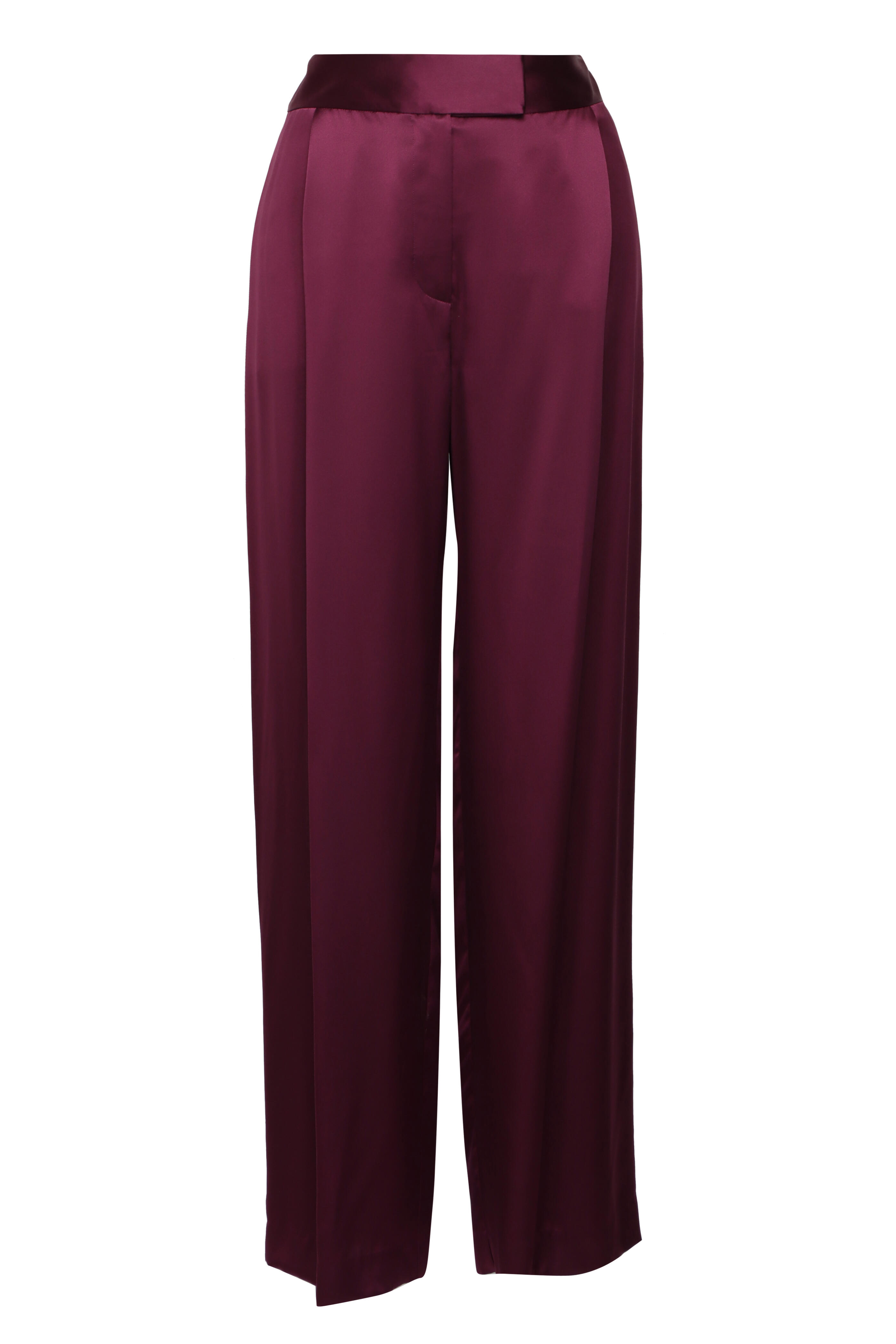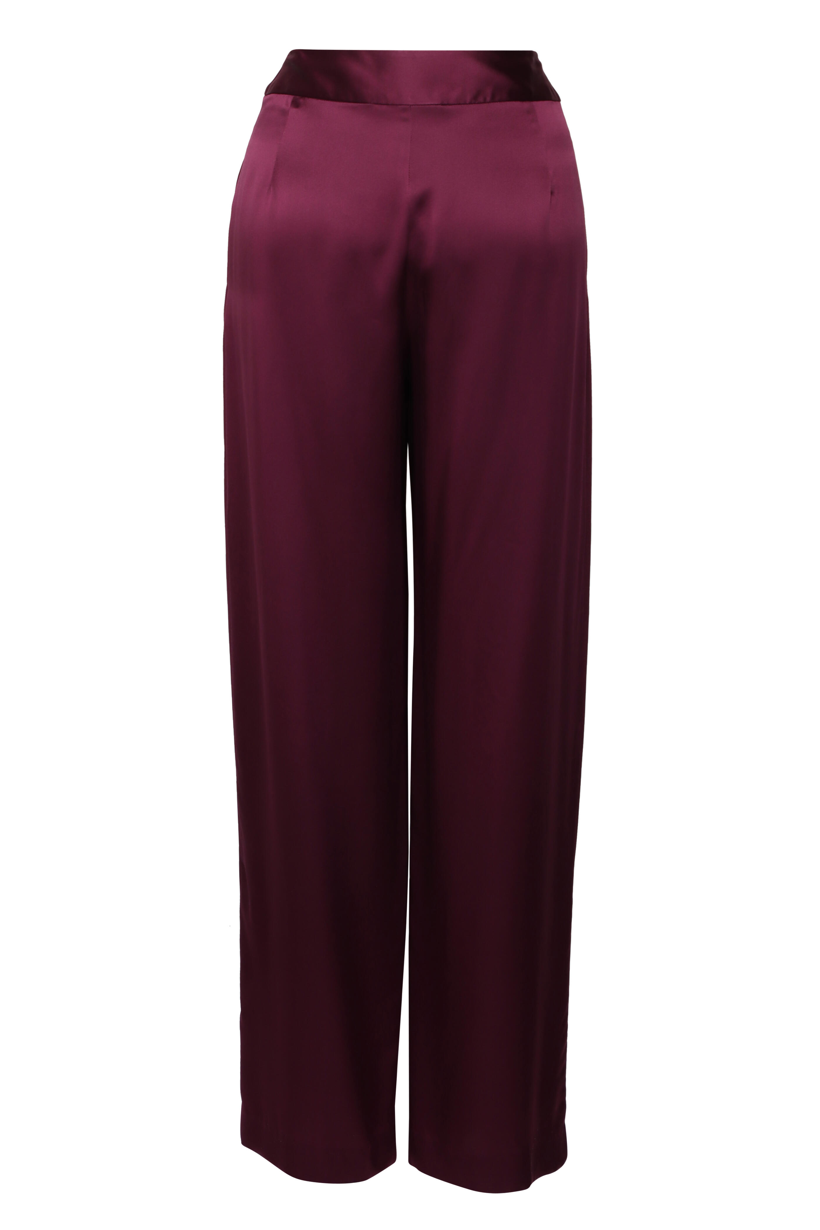 High rise. Flat waistband. Hook and eye closure. Zip fly. Side slip pockets. Front pleat detail. Straight silhouette. Wide though leg. Imported. Full length. 100% silk. Dry clean.