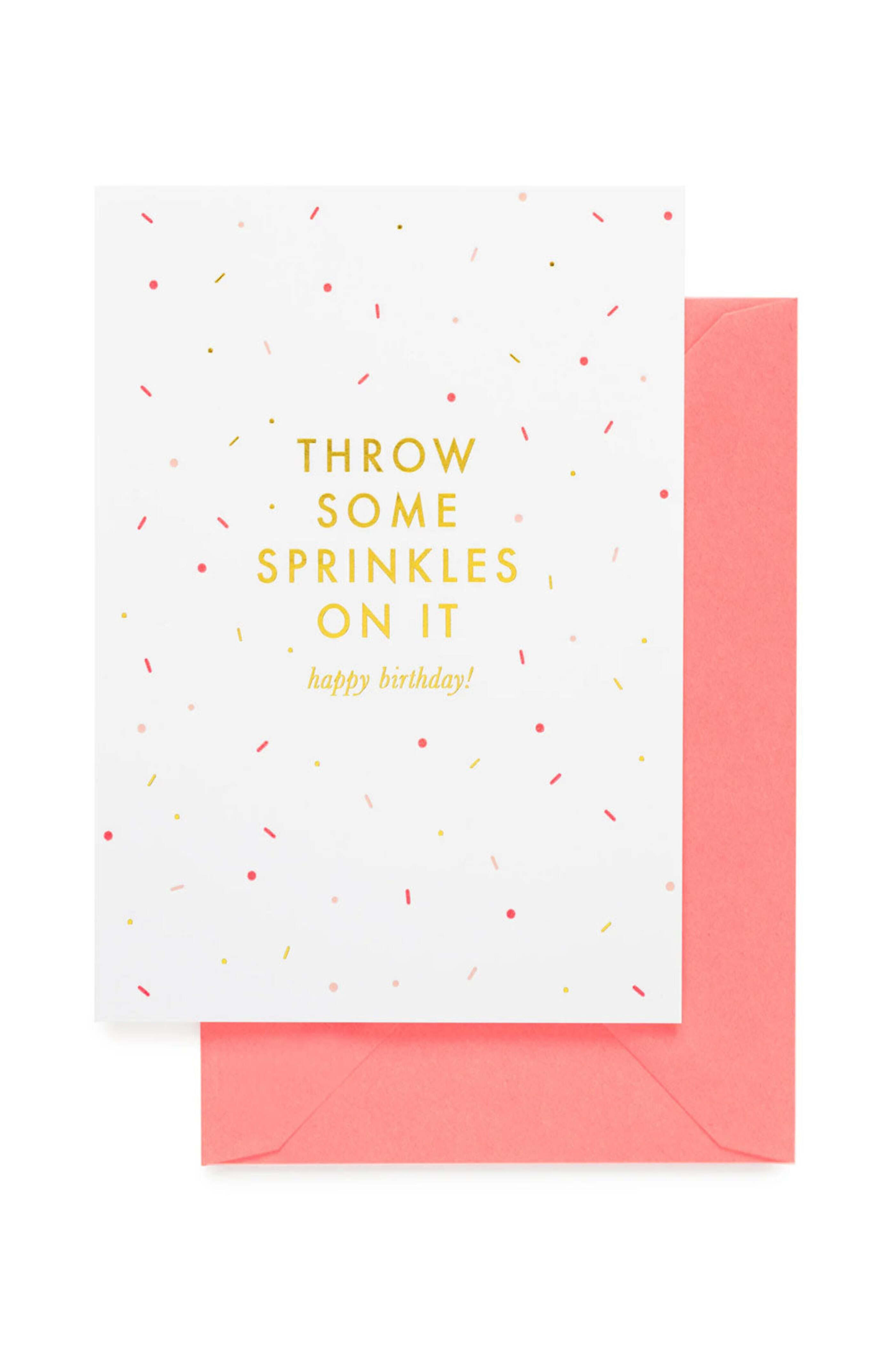 Sugar Paper Throw Some Sprinkles On It Card. White card. Letter press. Gold foil accent. Blank. Vertical orientation. Pink envelope. 4.25 x 5.5.
