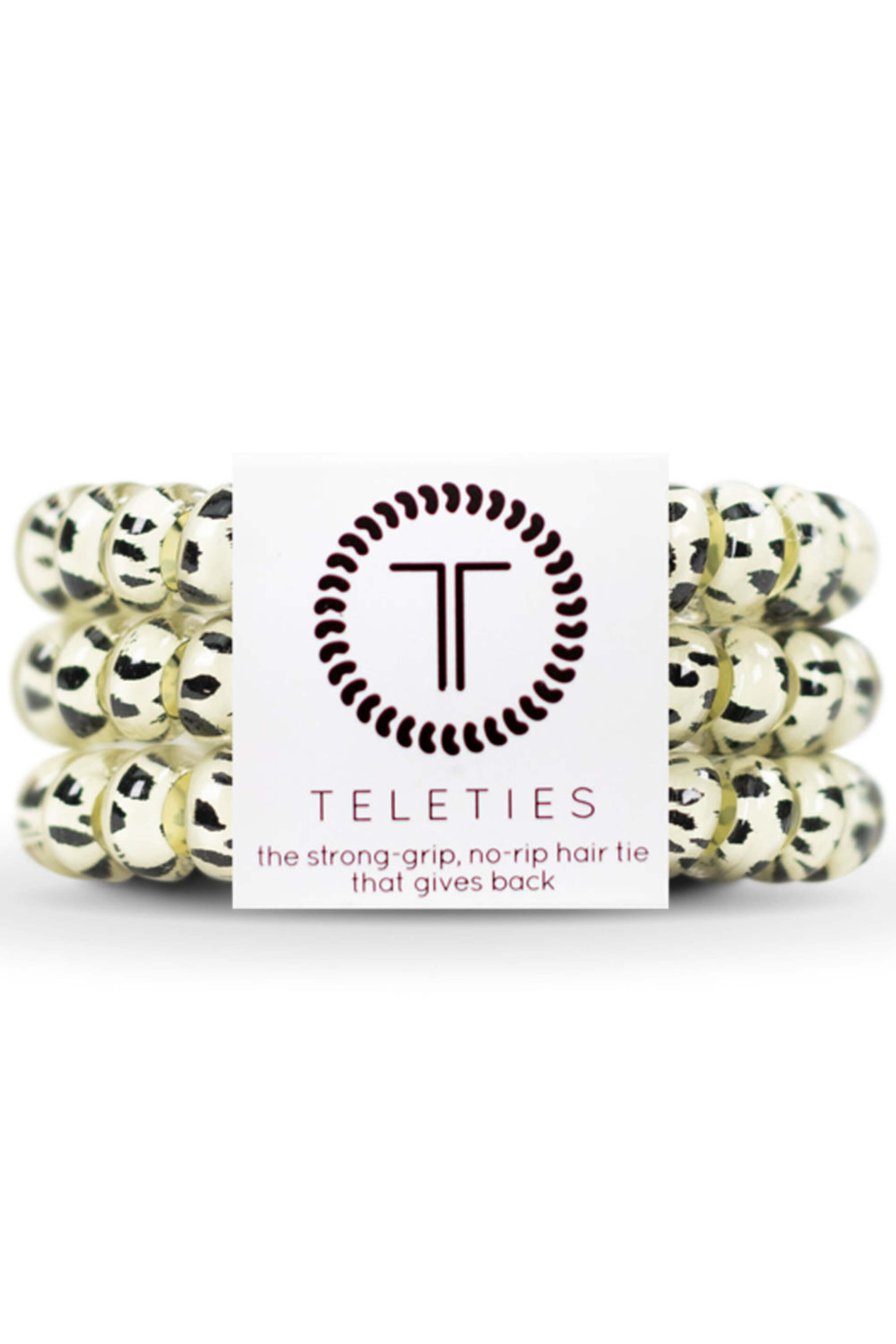 - Teleties Snow Leopard Large Spiral Hair Ties 3 Pack Spiral hair tie 6.5cm W x 1cm Thick Water resistant Pack of three