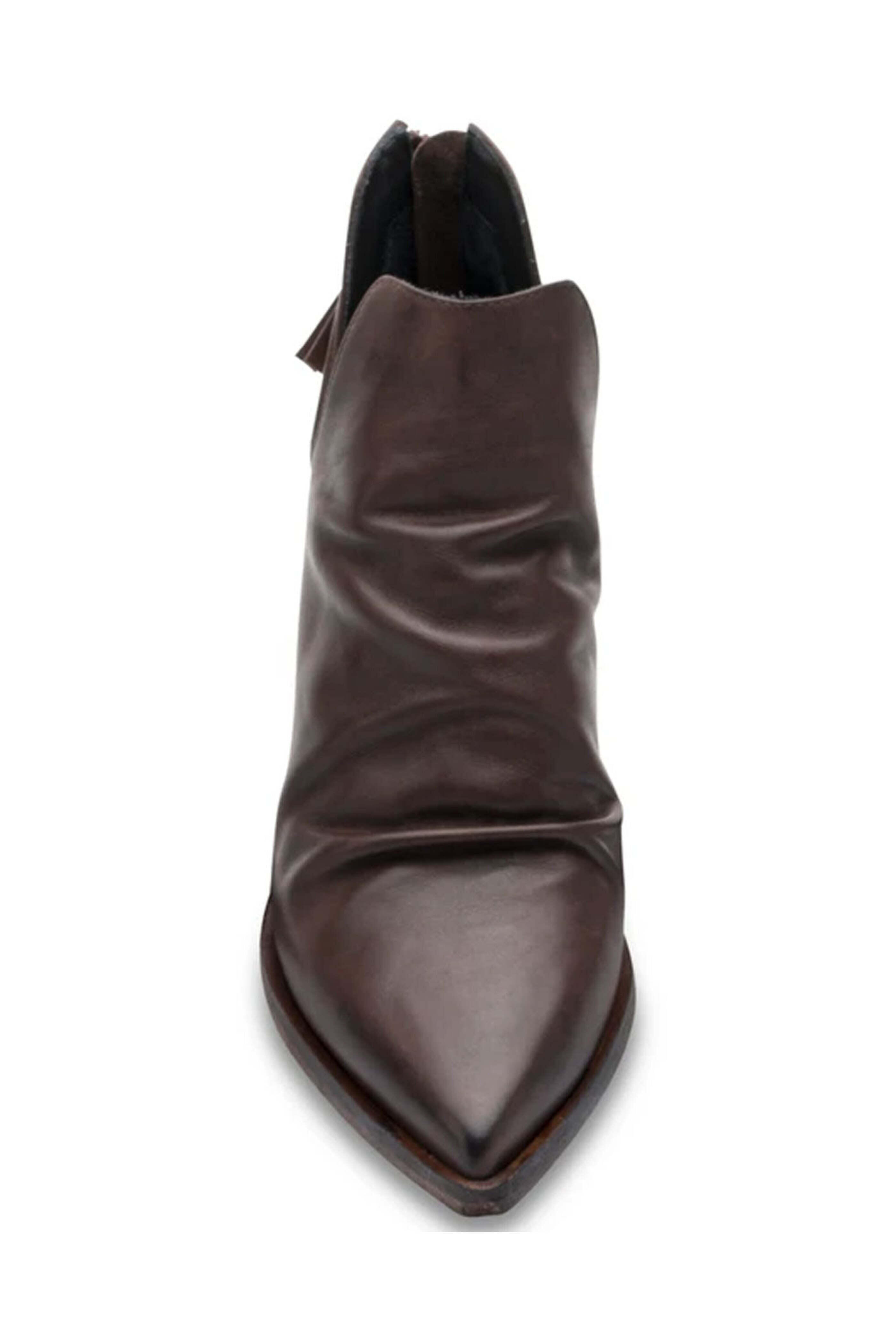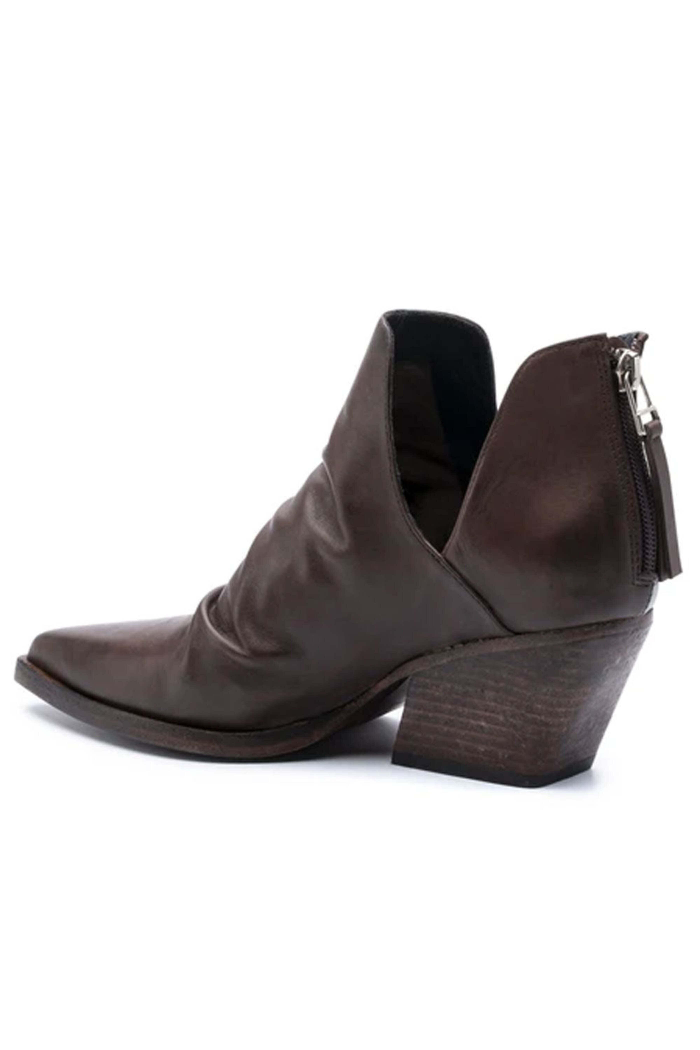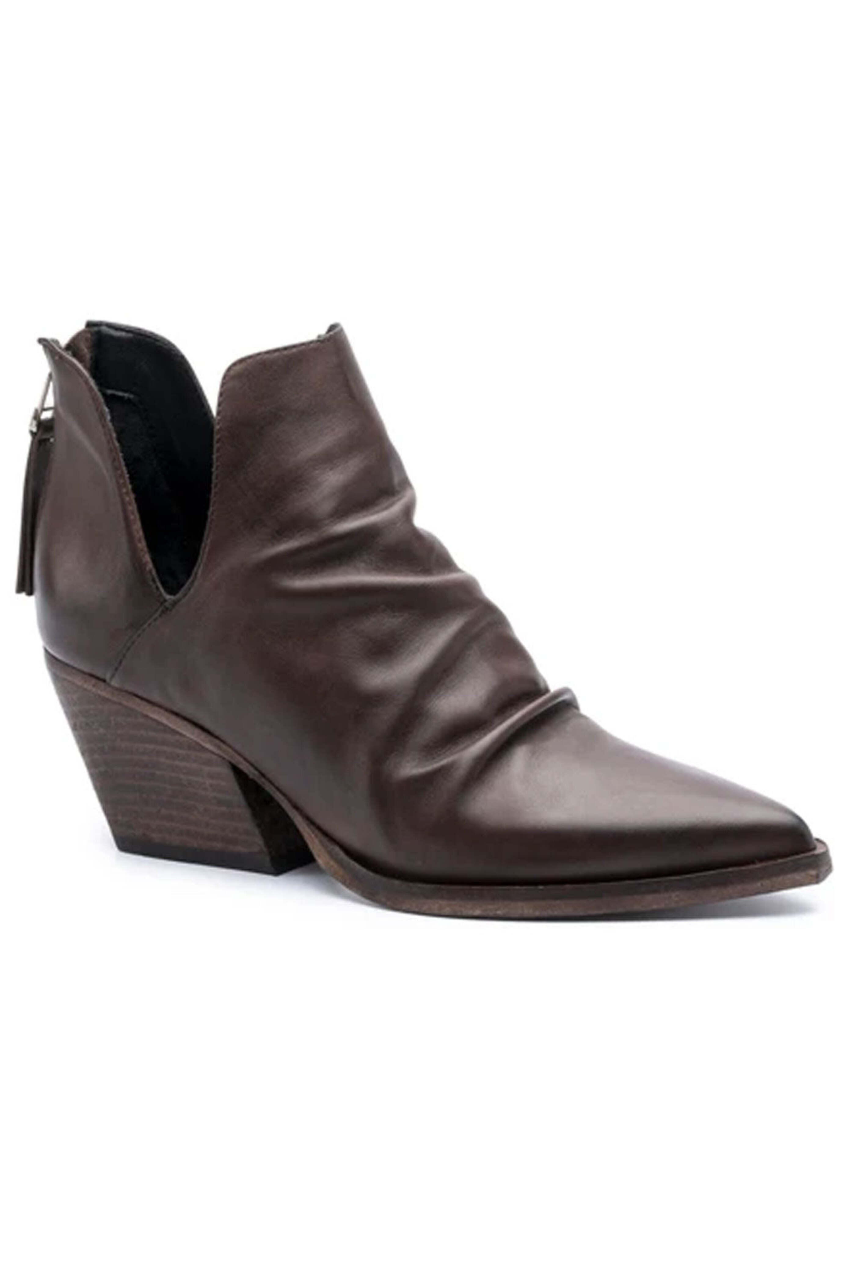 Golo Tucson Bootie in Porcini. Pointed toe. Tassel zip on heel. Open sided. Ruching across vamp. Underslung heel. Plush calf leather upper. Breathable lining material.