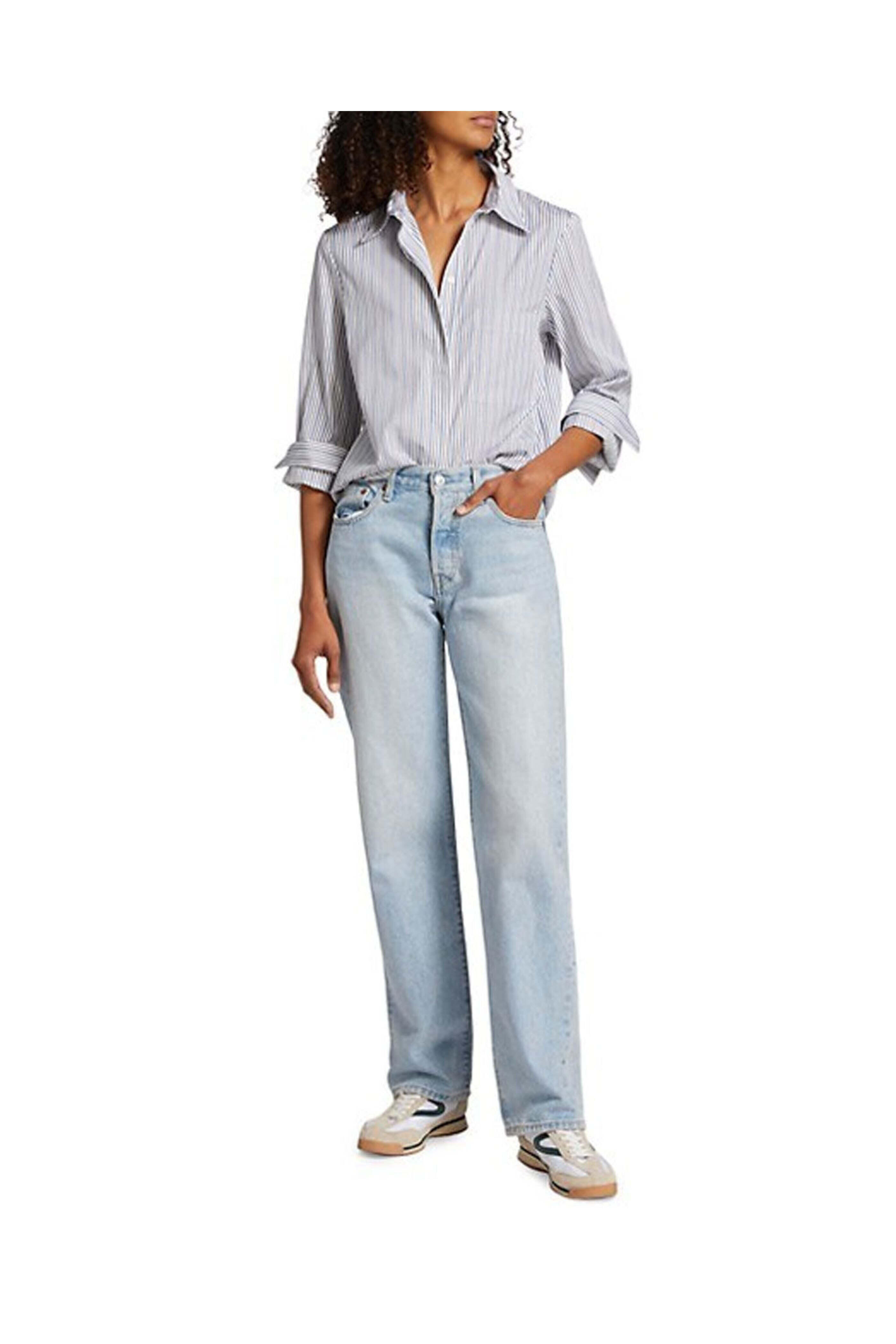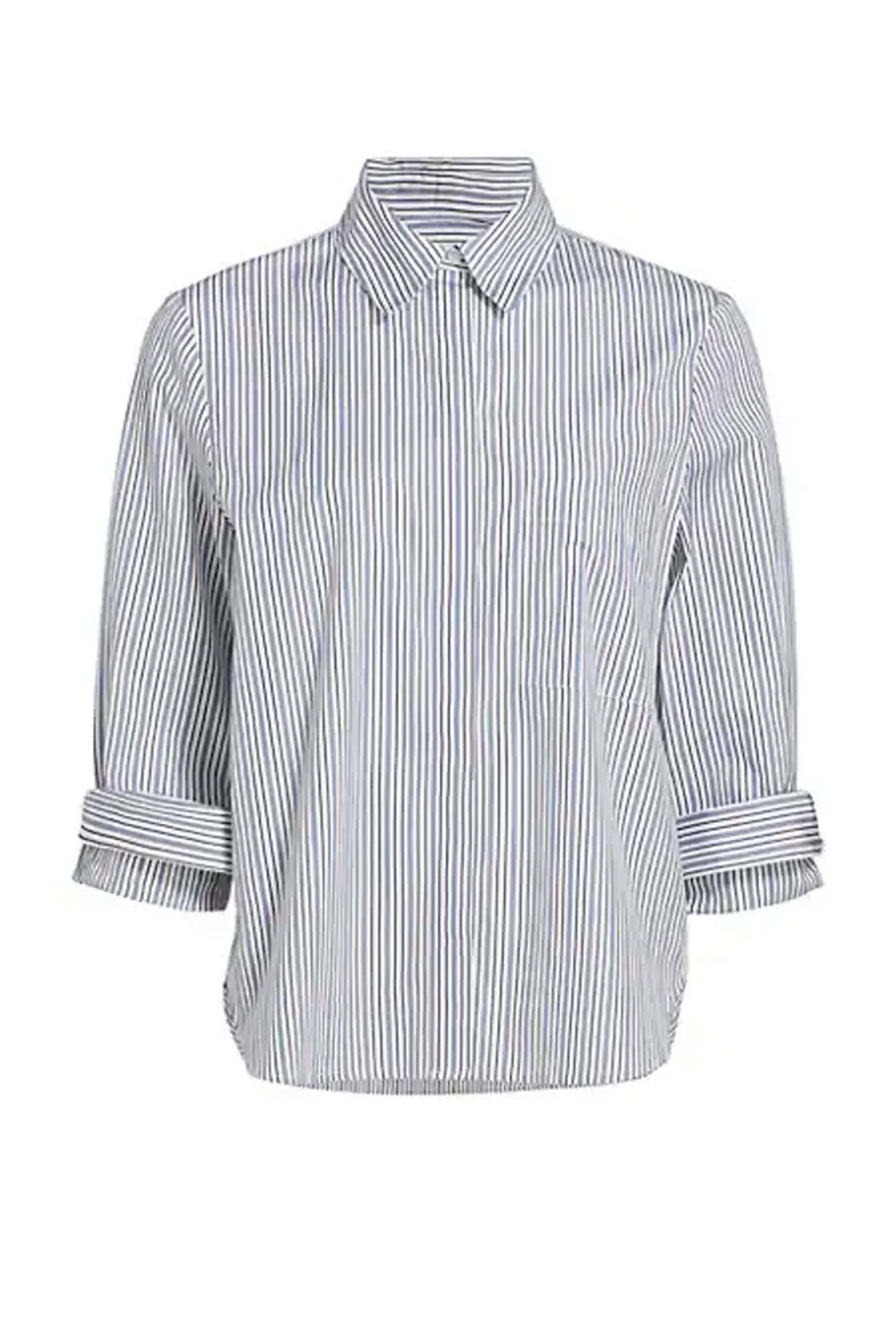 TWP Black White and Blue Striped Ex Boyfriend Shirt . Shirt collar. Back yoke. Pleated back vent. Drop shoulders. Long sleeves, barrel button cuffs. Chest patch pockets. Split sides. Round high-low hem. Concealed button-front closures. 100% cotton.