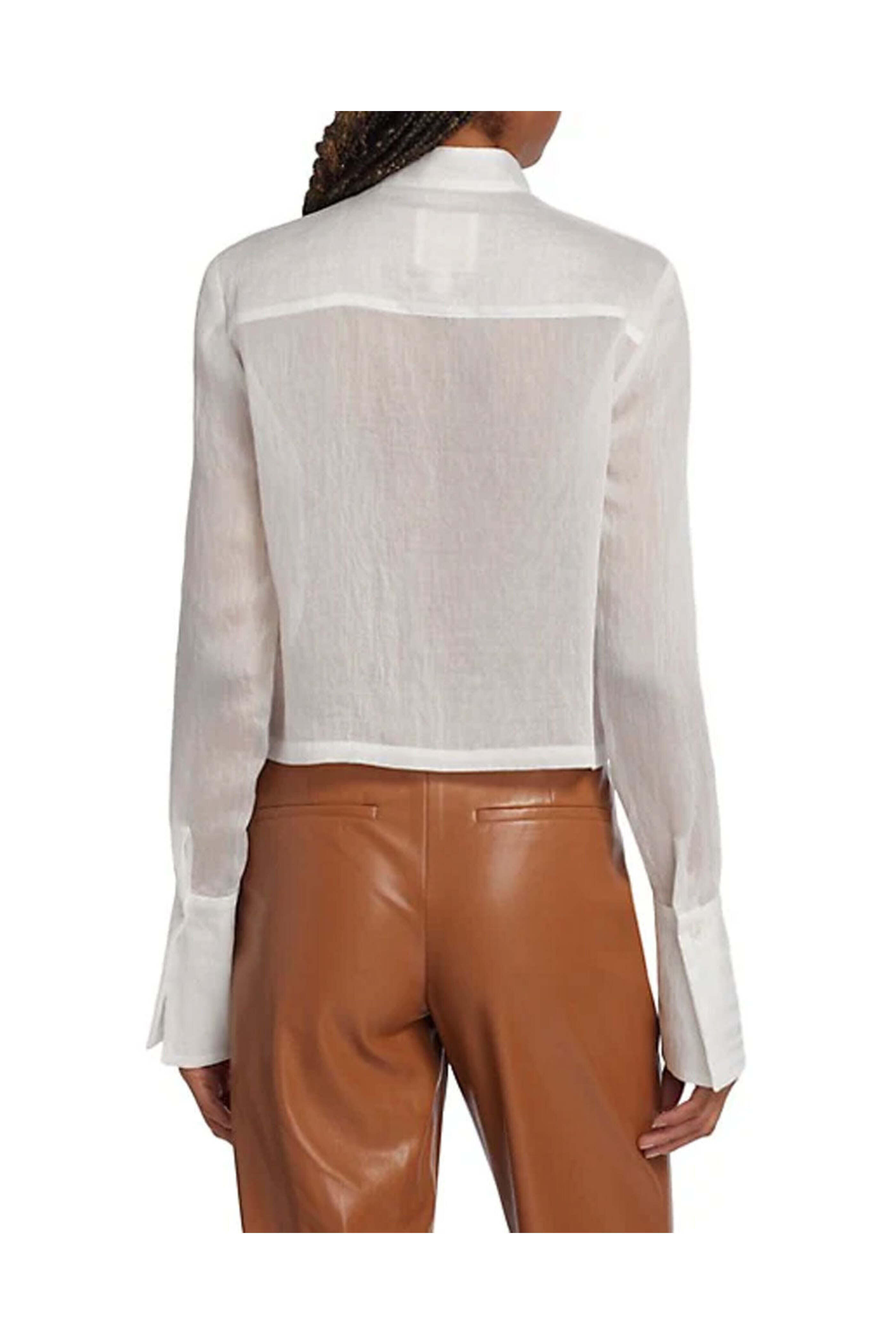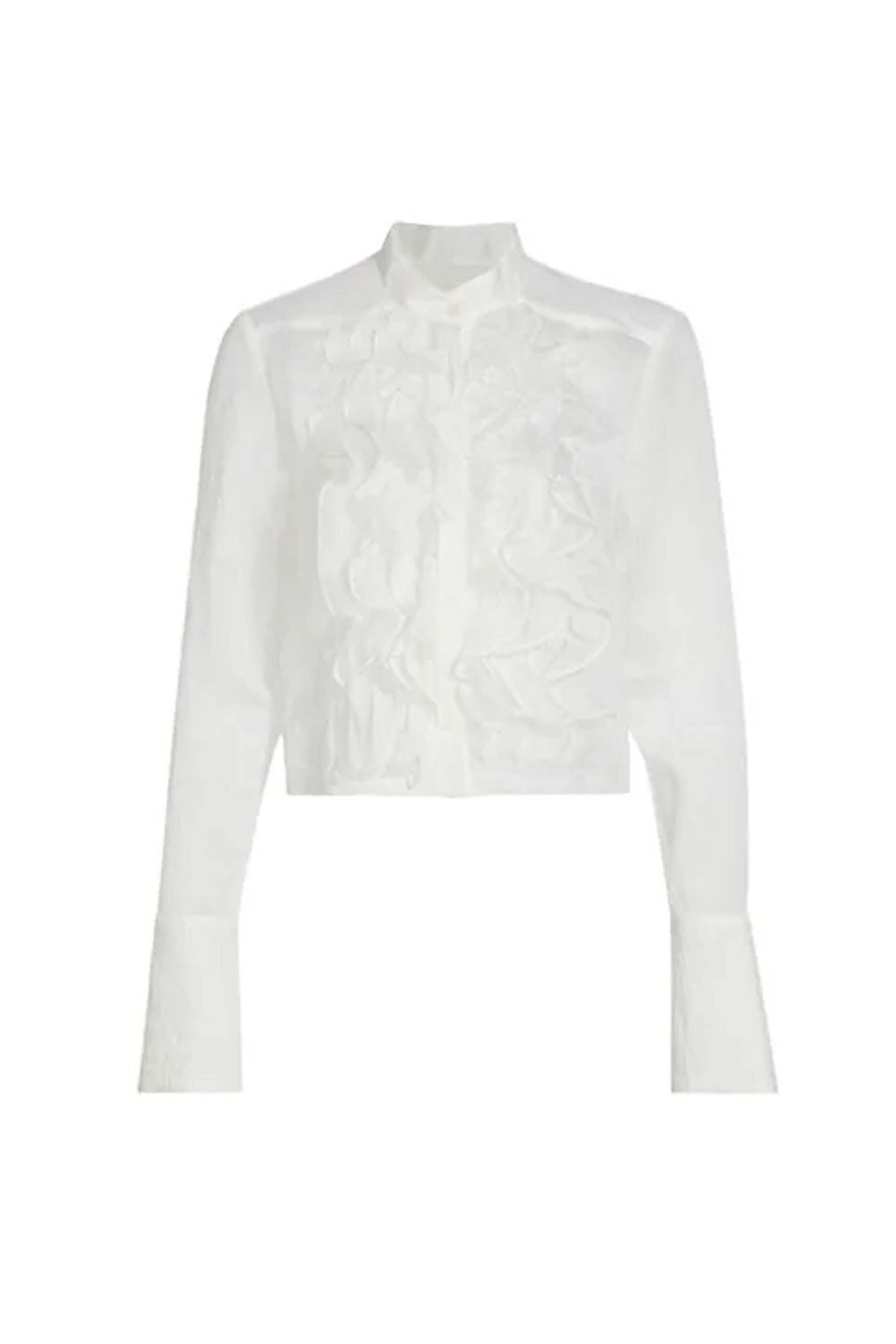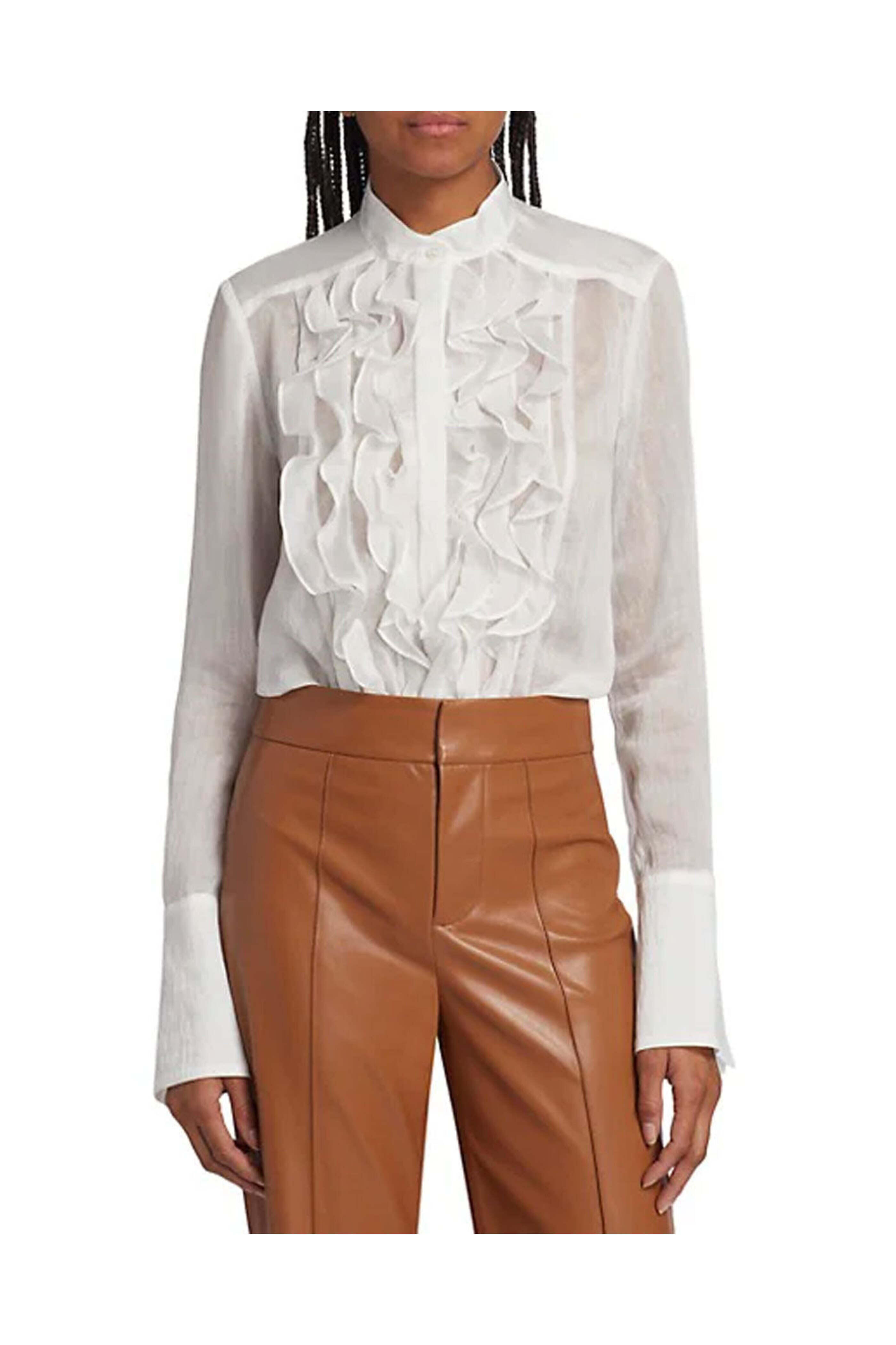 TWP White Patti Shirt in Hammered Organza. Band collar. Back yoke. Long sleeves, barrel button cuffs. Concealed button-front closures. Slim fit . 100% silk.
