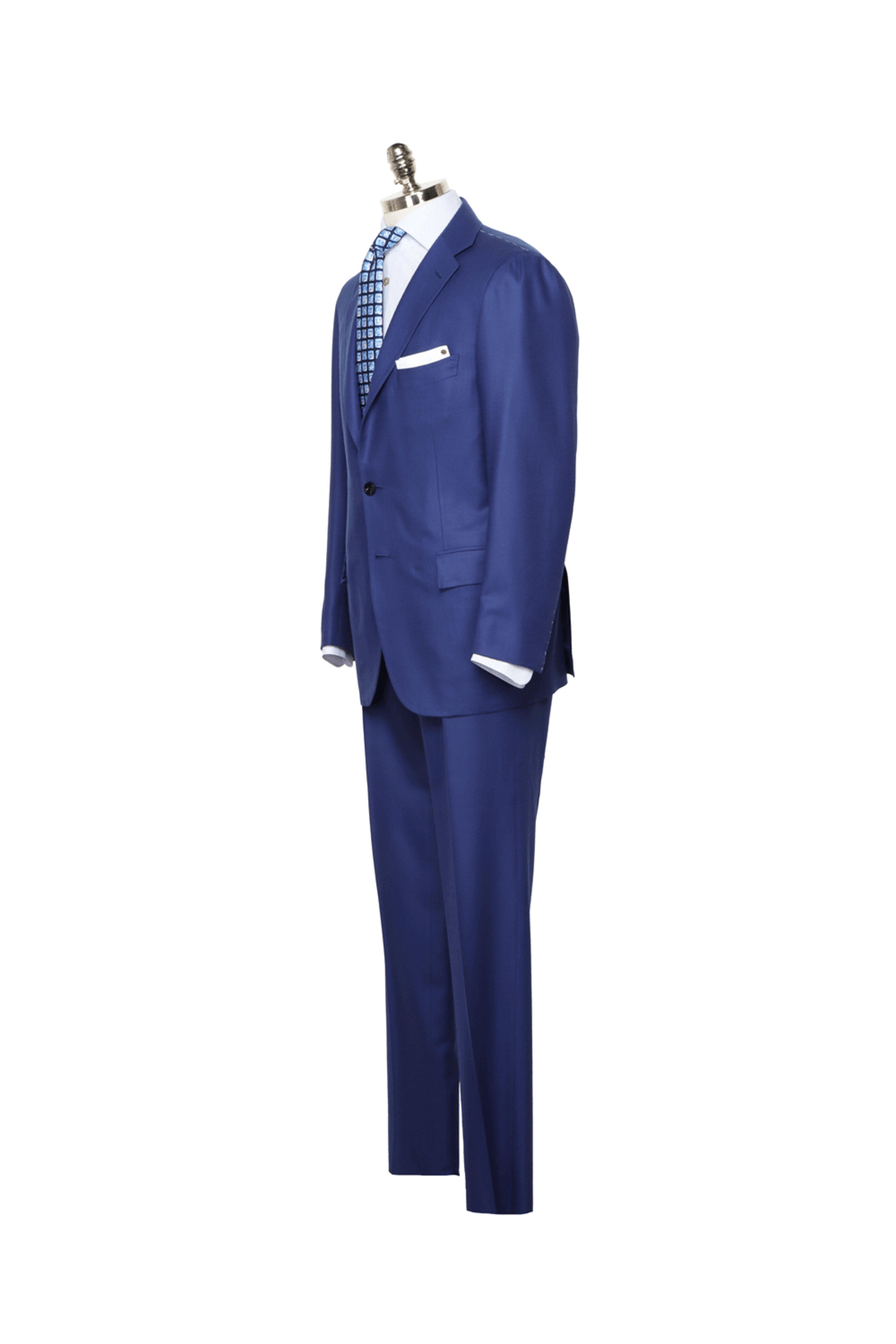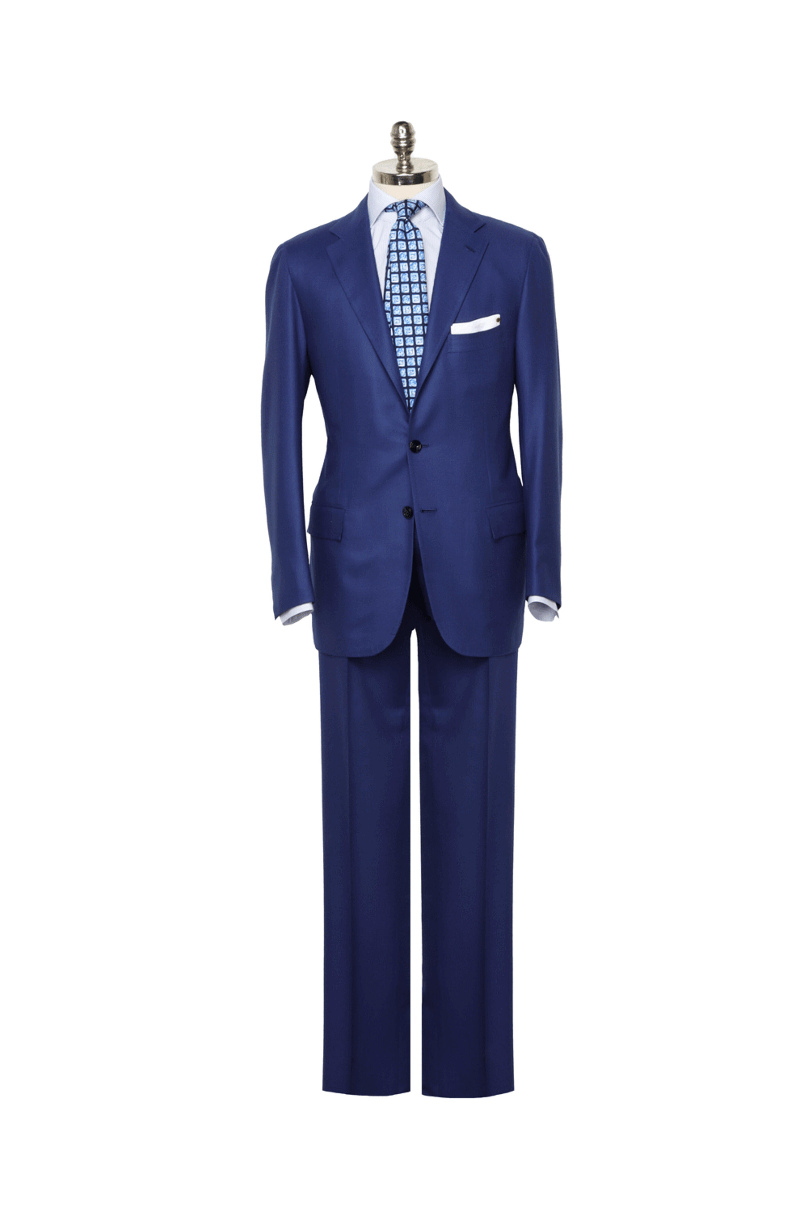 Kiton Solid High Blue Suit. Notch lapels. Front button closure. Front left chest welt pocket. Waist flap pockets. Double back vents. Unfinished buttonholes. Fully-lined. Cupro lining. Flat front pant: Zip fly. Single button closure. Belt loops. Side pockets. Single button back welt pockets. Unfinished hem. Made in Italy. 95% virgin wool, 5% cashmere.