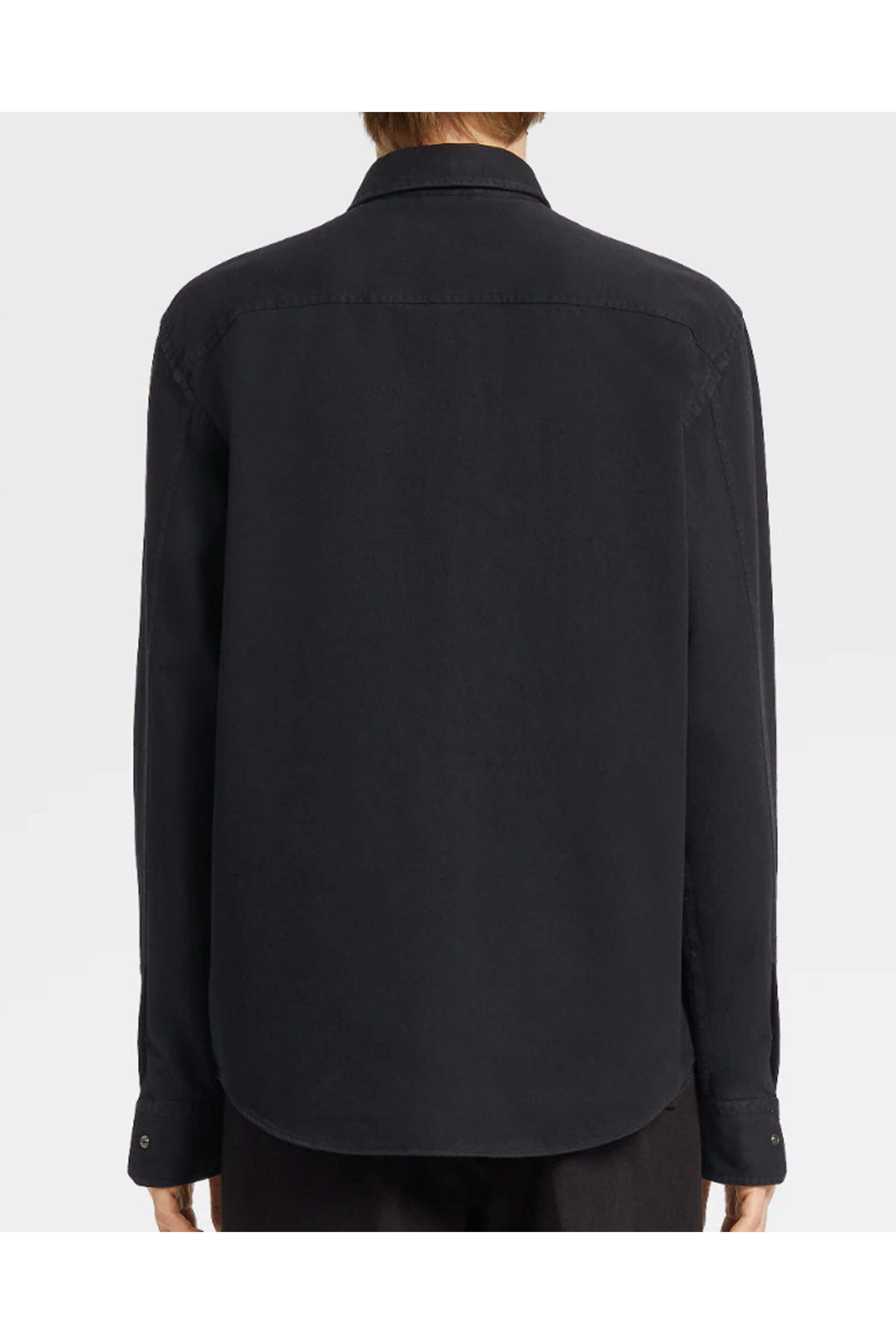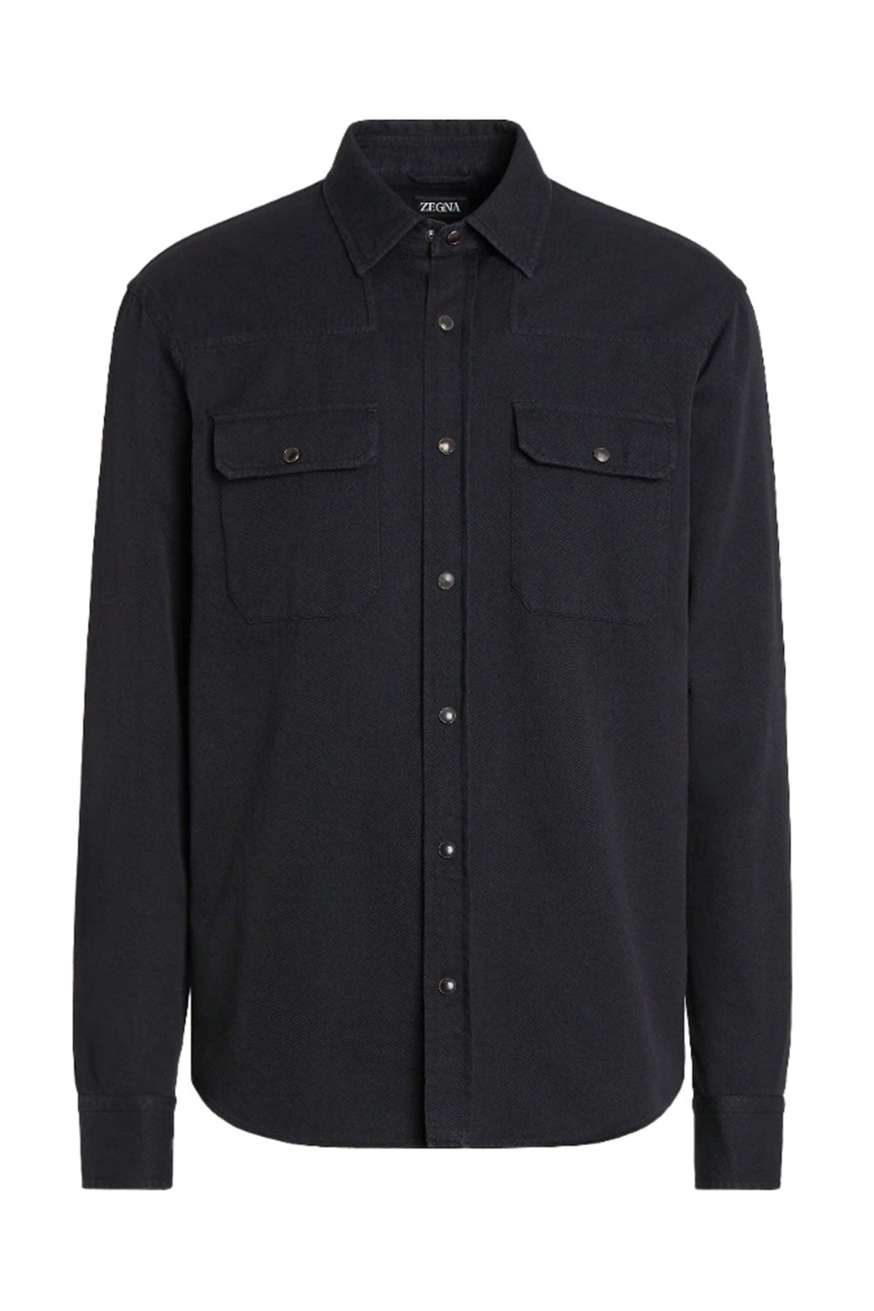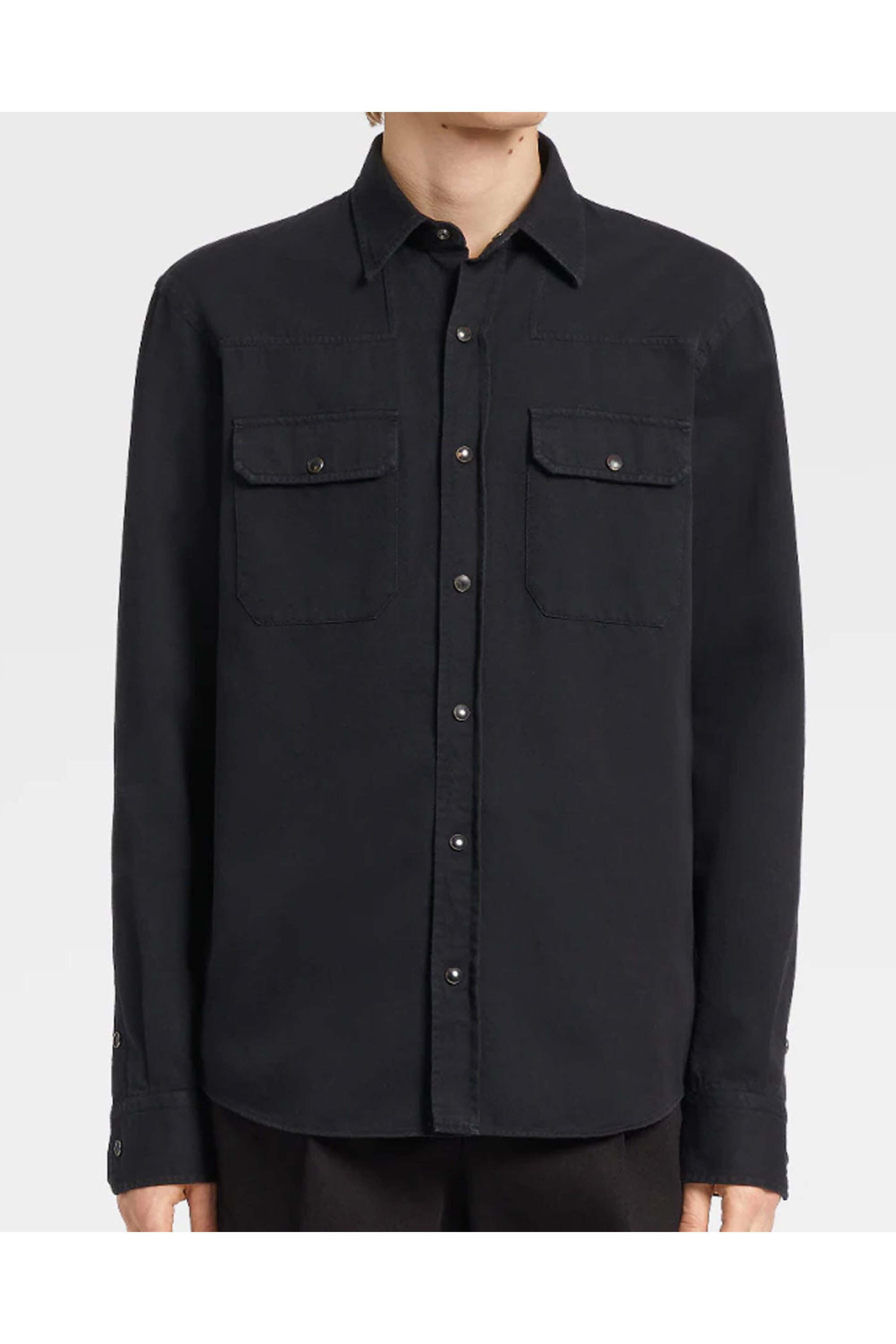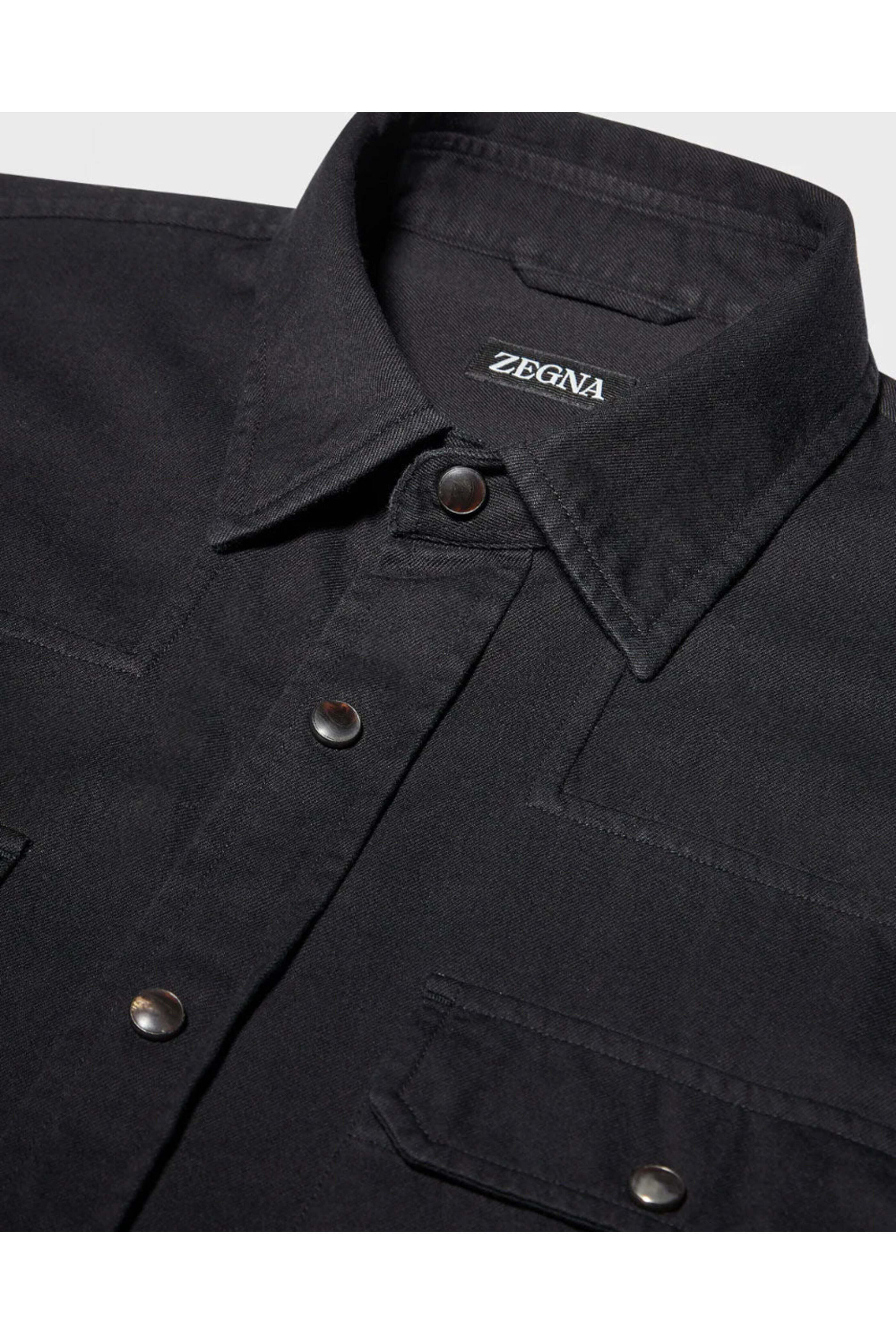 Zegna Black Denim Long Sleeve Shirt. Semi spread collar. Snap button down front. Long sleeves. Standard cuffs. Patch flap chest pockets with snap closures. Western style. Leisure fit. 100% cotton.