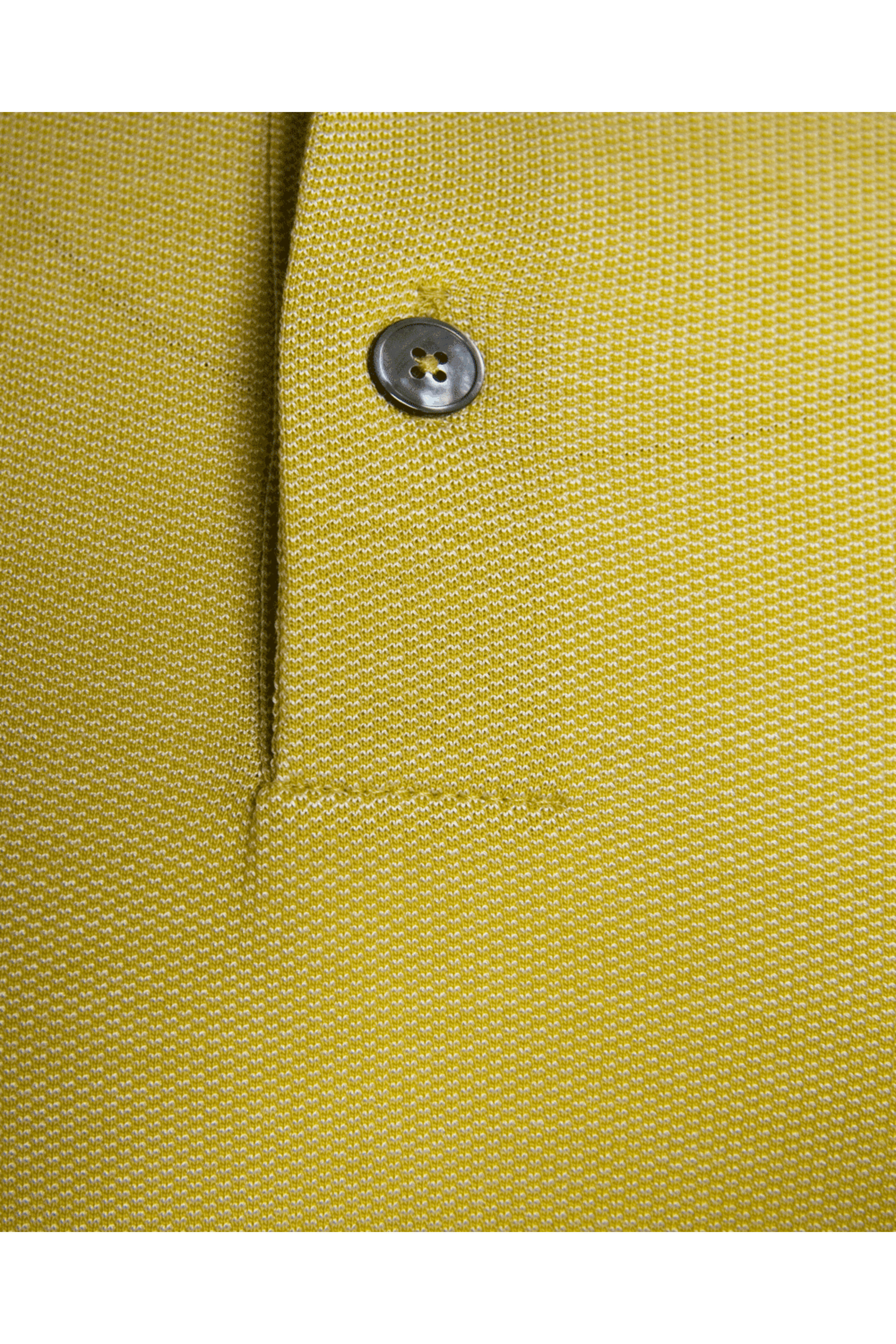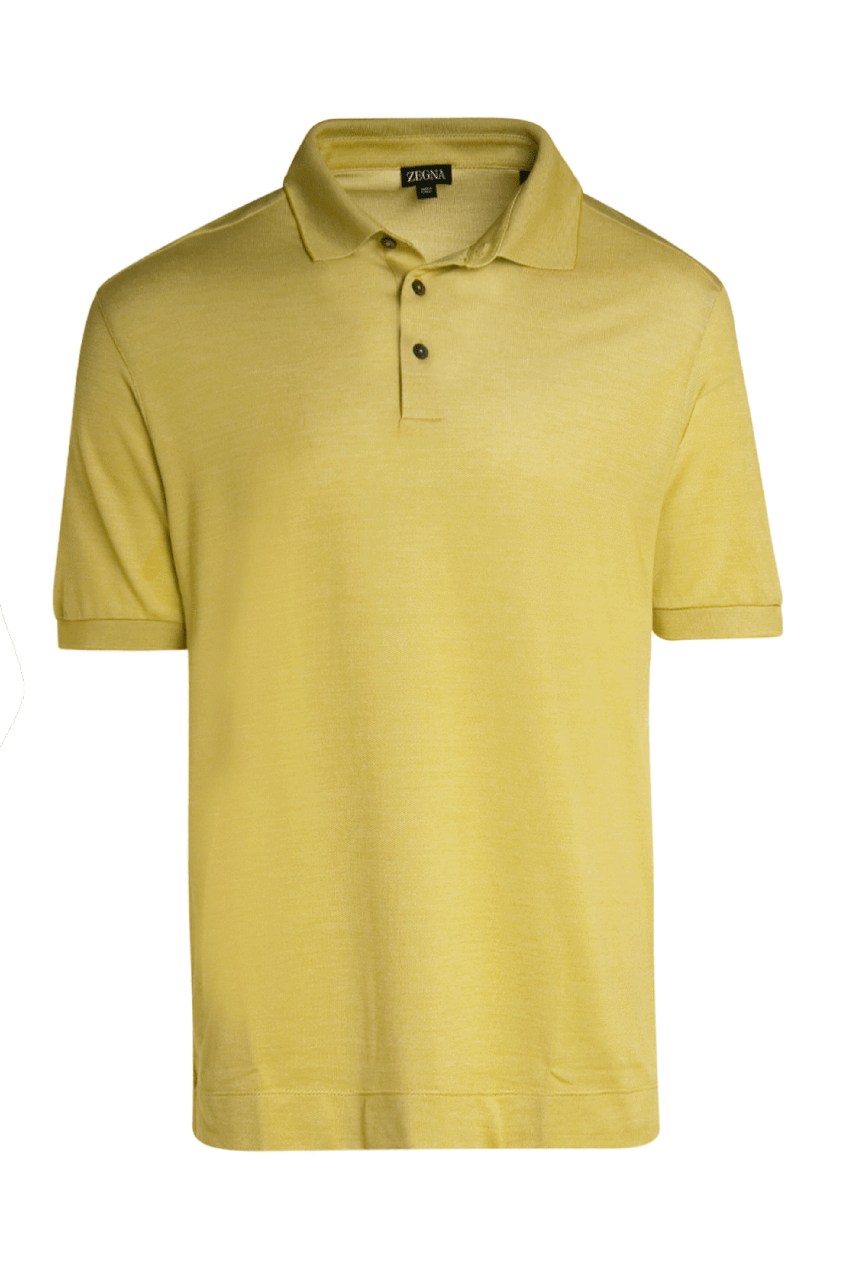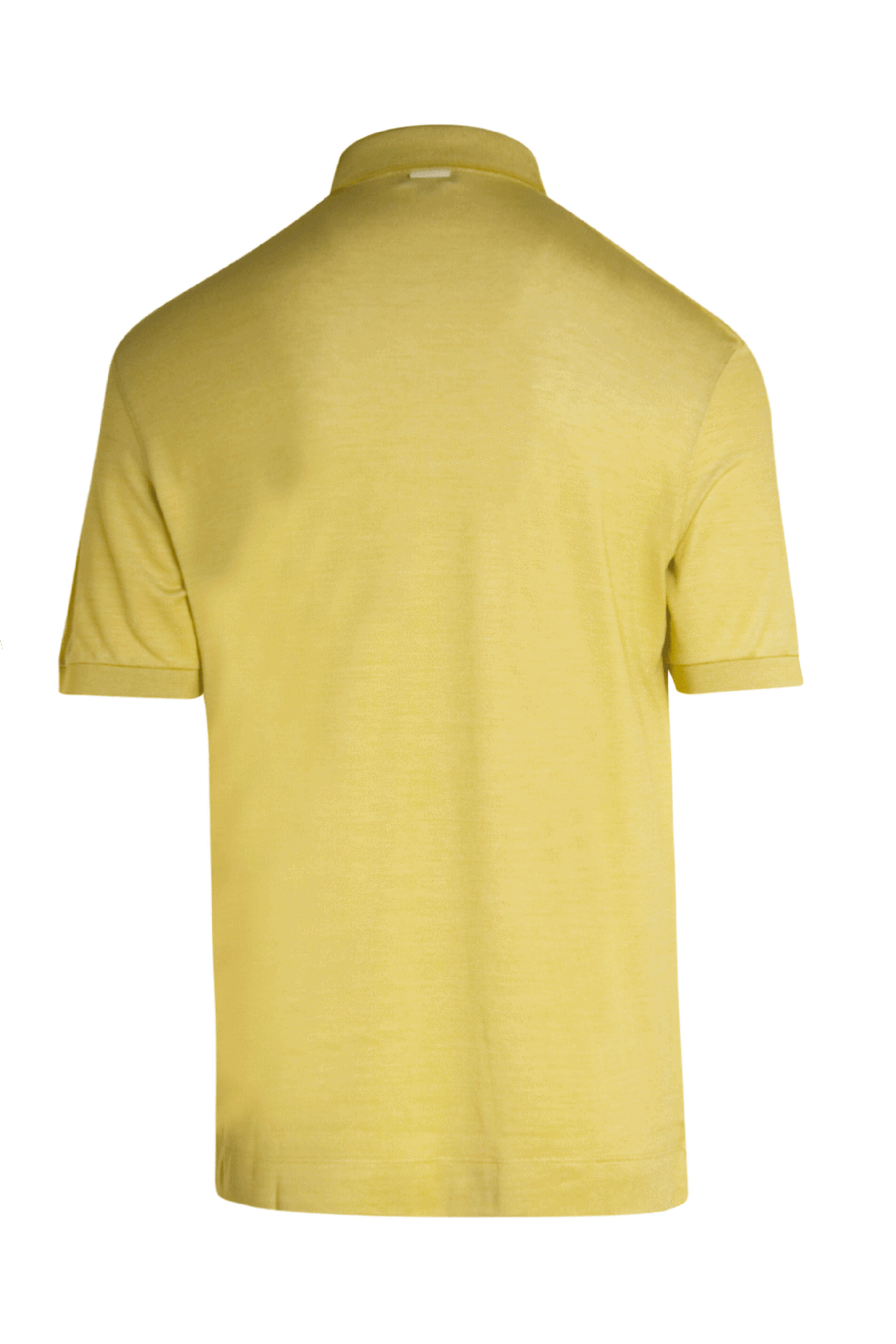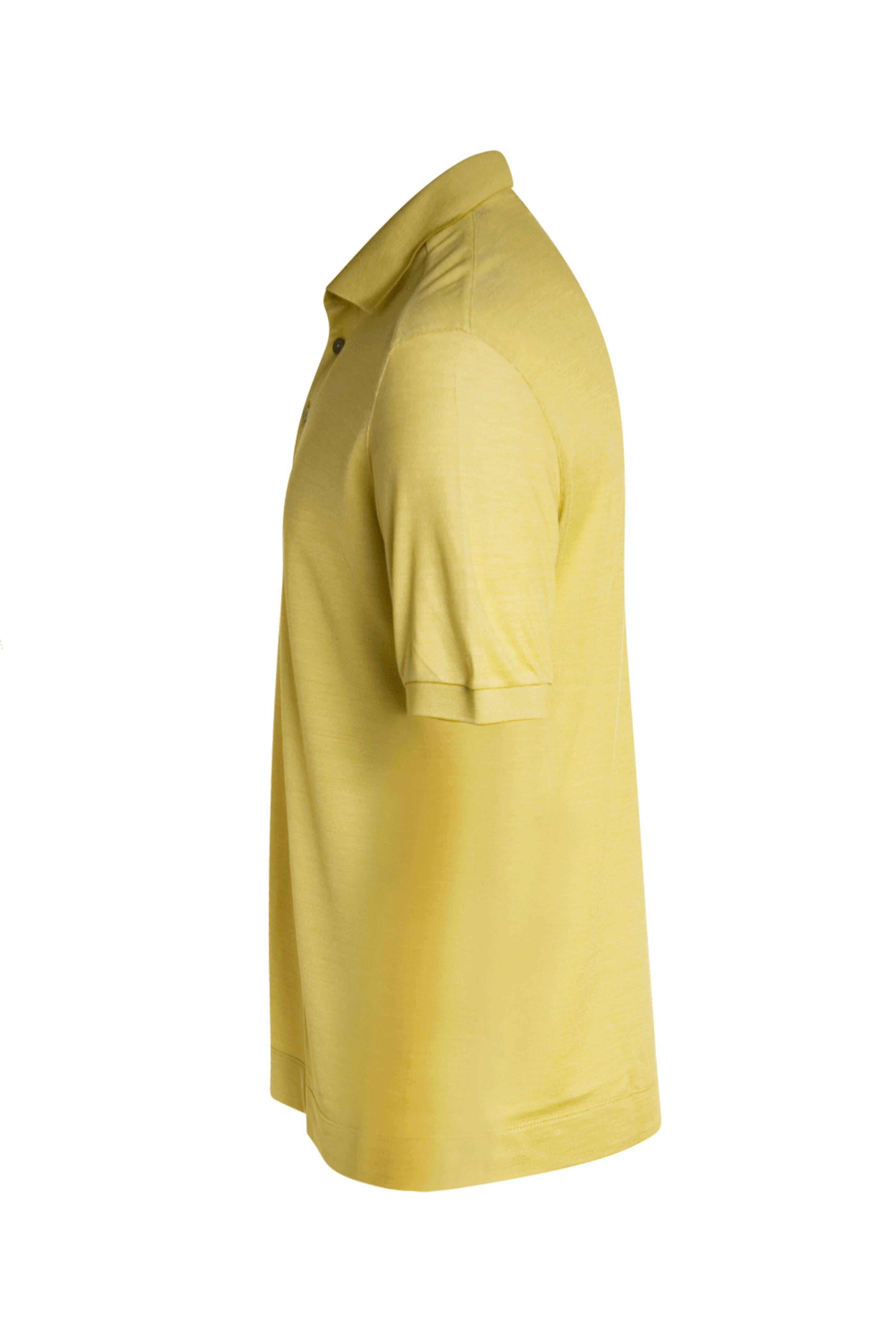 Zegna Yellow Short Sleeve Polo. Spread collar. Three button placket. Short sleeves. Ribbed trims. Tonal stitching. Straight hem. 52% cotton 48% silk.