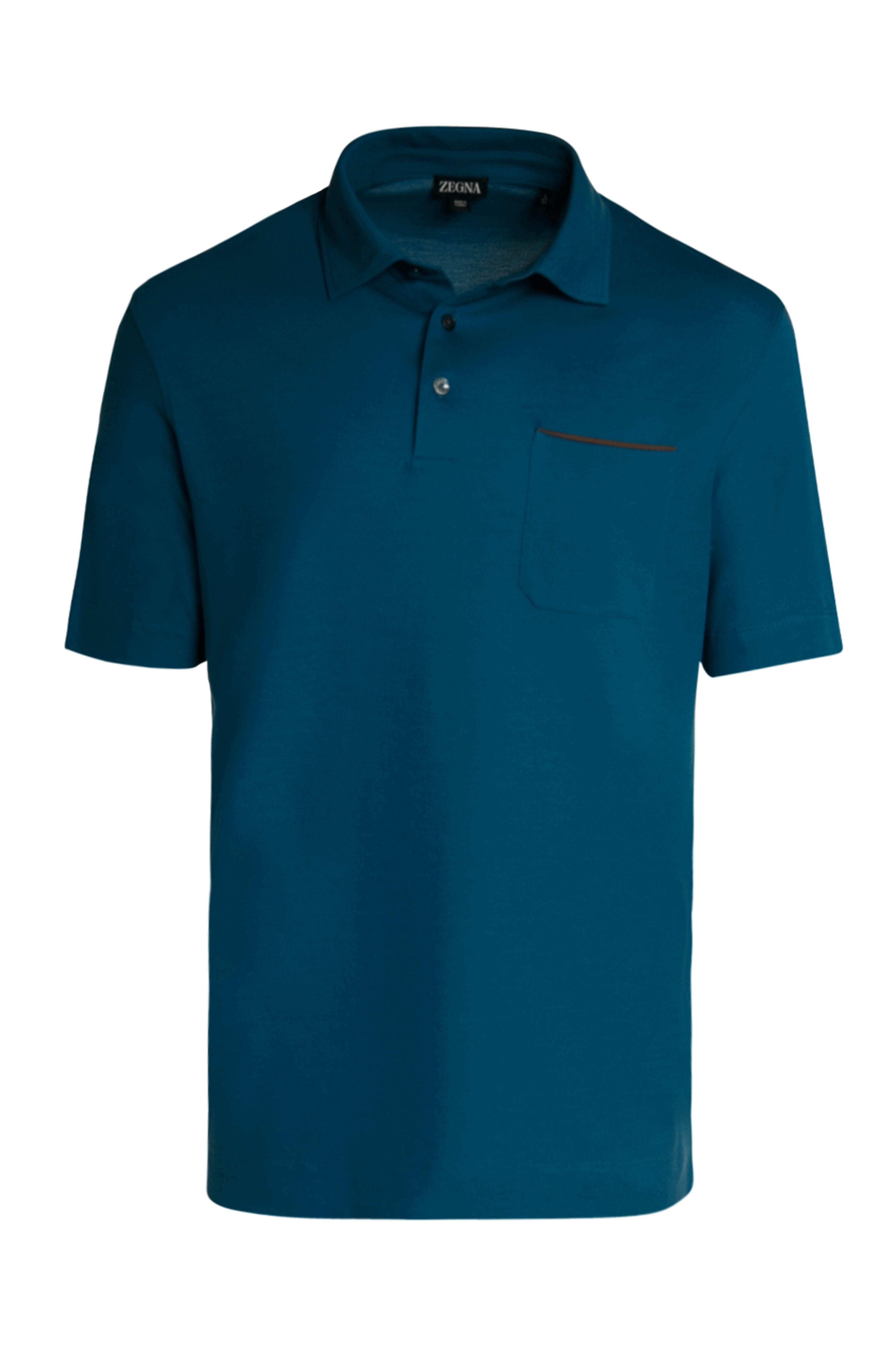 Zegna Teal Cotton Short Sleeve Polo. Spread collar. Three button placket. Front left chest patch pocket with contrast detail. Short sleeves. Ribbed trims. Tonal stitching. Straight hem. 100% cotton.
