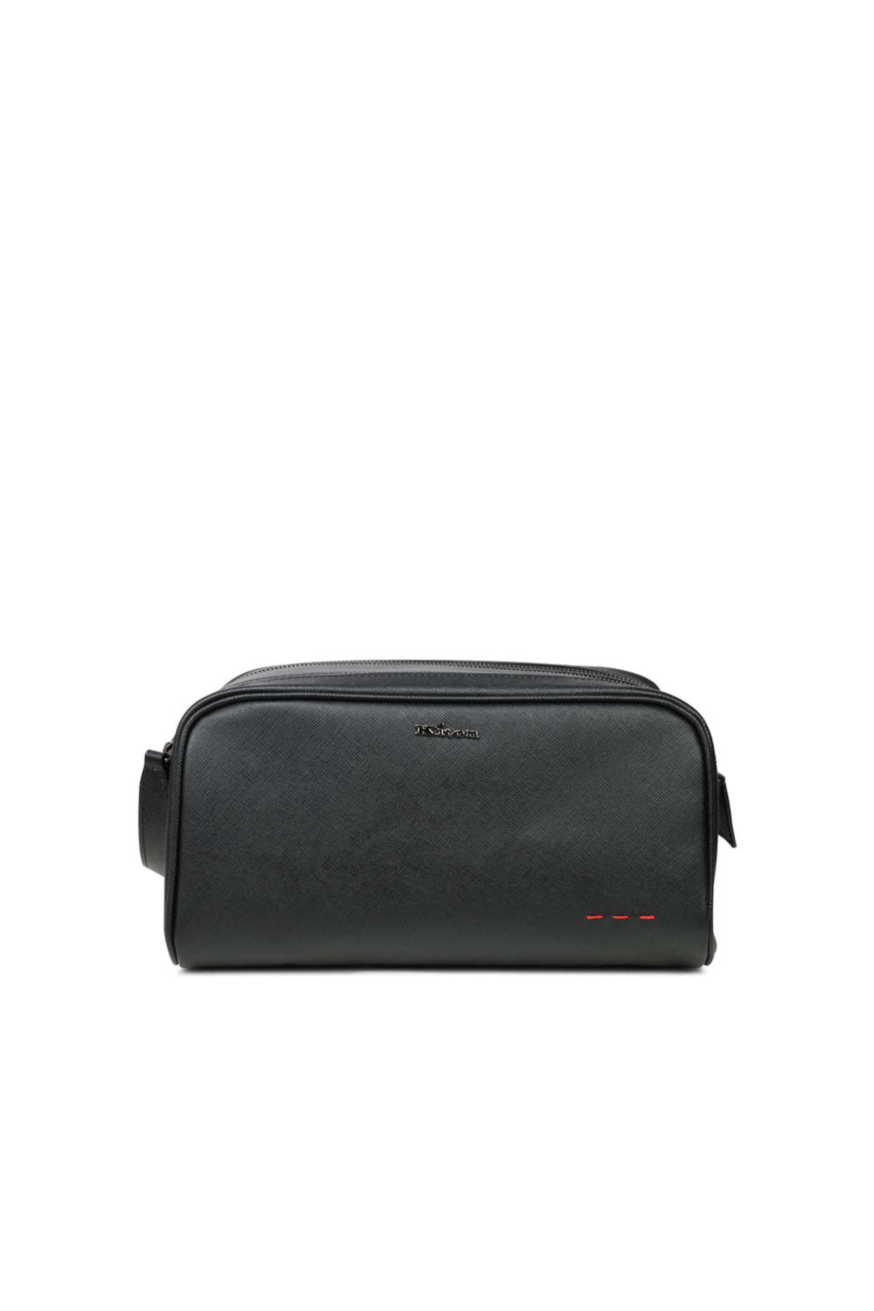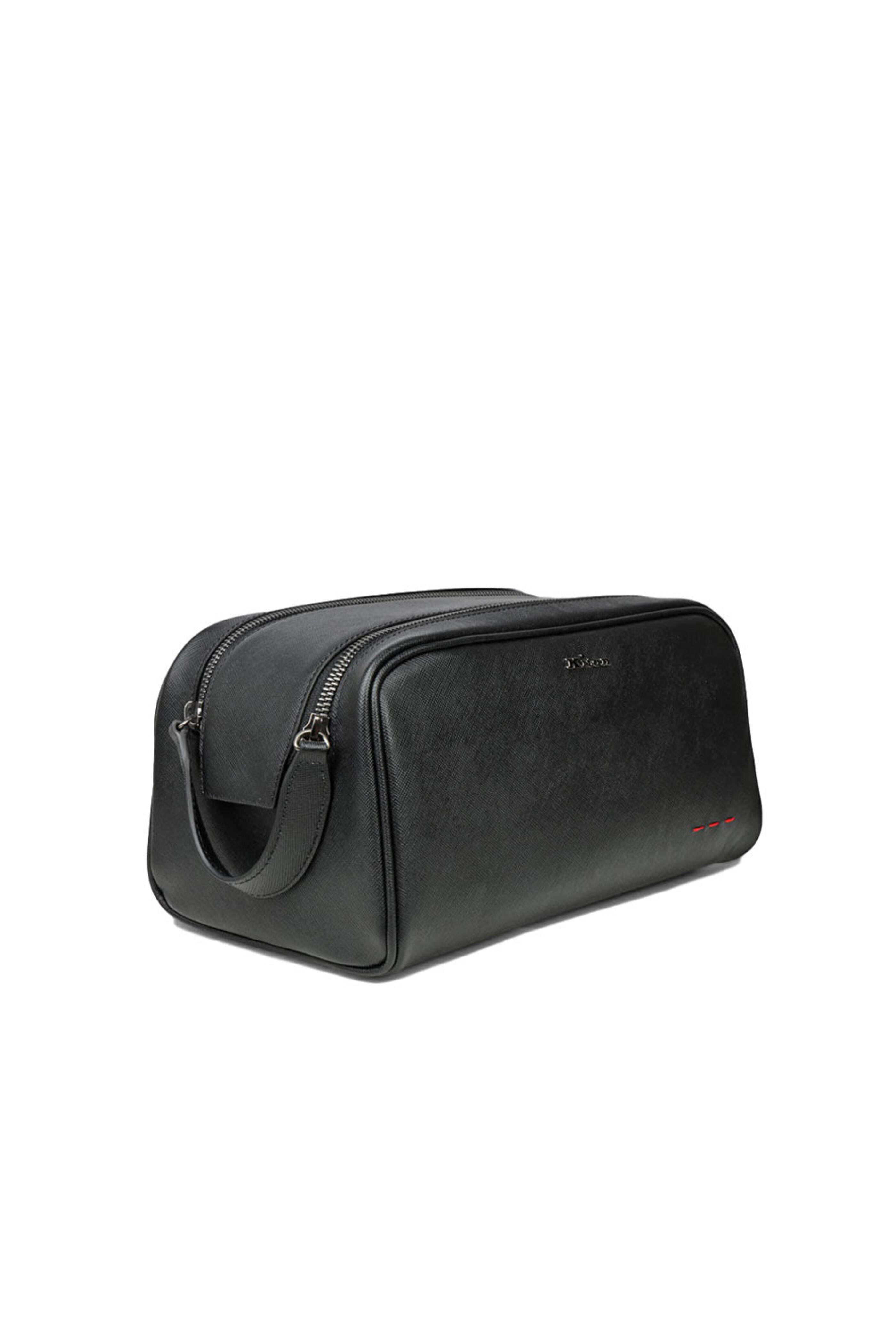 Saffiano leather outer. Dula exterior top zip closures. Side handle. Silver plated hardware. Kiton signature logo. Interior wall pocket. Fabric lining. Made in Italy. 10.5 L x 5.5W x 5.5 H.