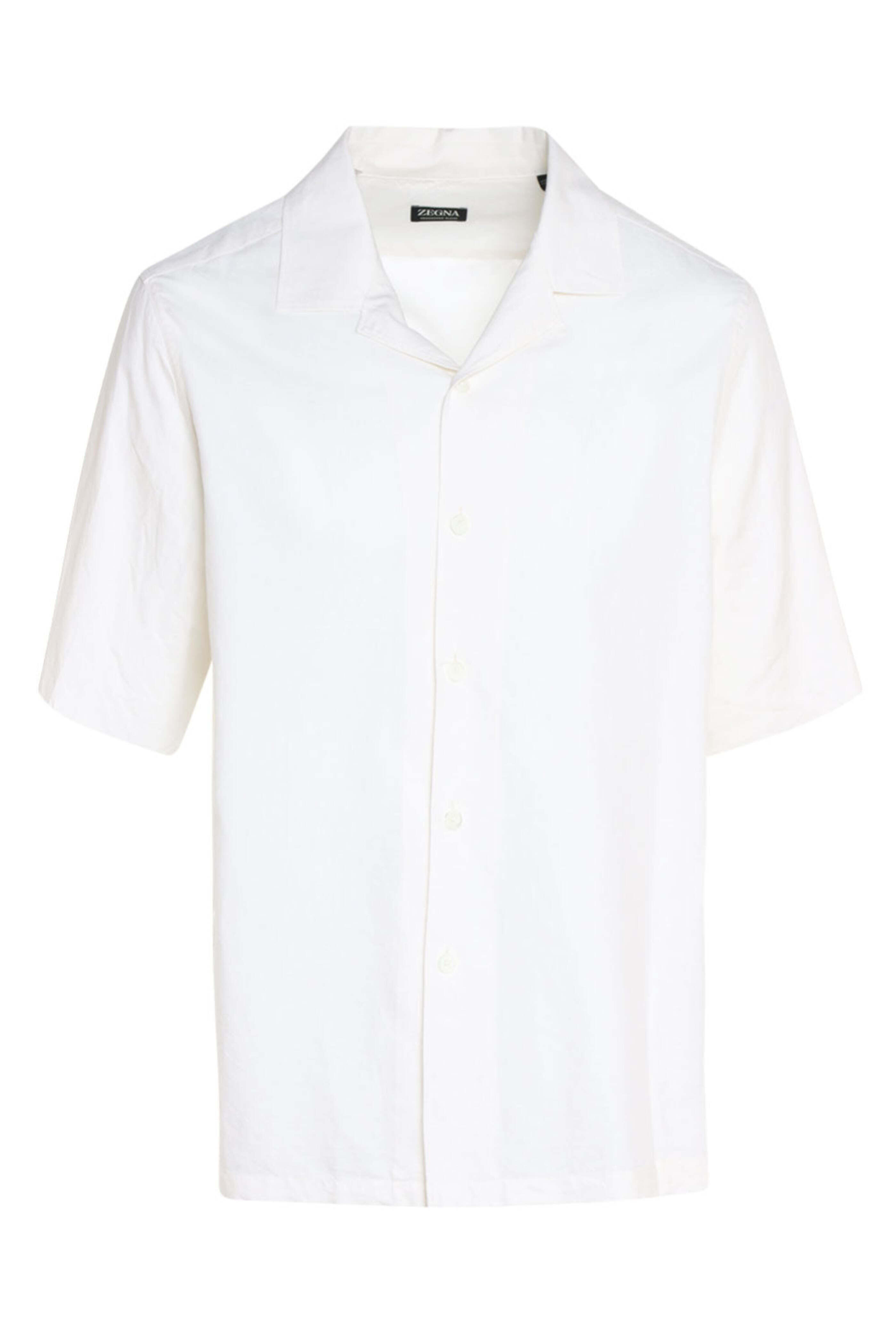 Zegna Cream Crossover Blend Short Sleeve Sportshirt. Camp collar. Button down front. Short sleeves. Side vents. Tonal stitching. Straight hem. 60% cotton 25% linen 15% silk.