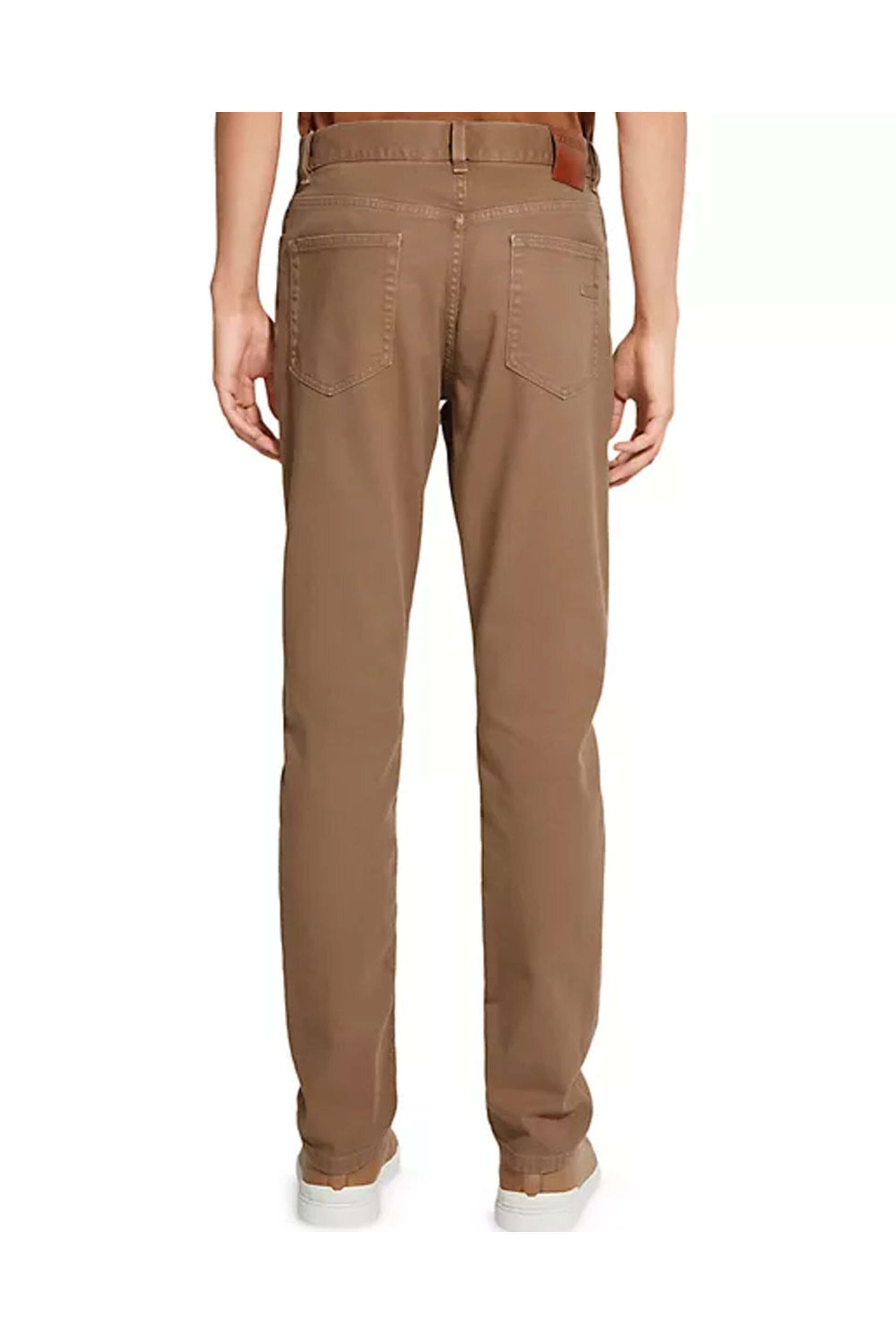 Zegna Dark Taupe 5 Pocket Pants. Zip fly. Single button closure. Double belt loops. Five pocket style. Fabric embroidered back patch. Garment-dyed. Slim fit. Made in Italy. 97% Cotton, 3% elastane.