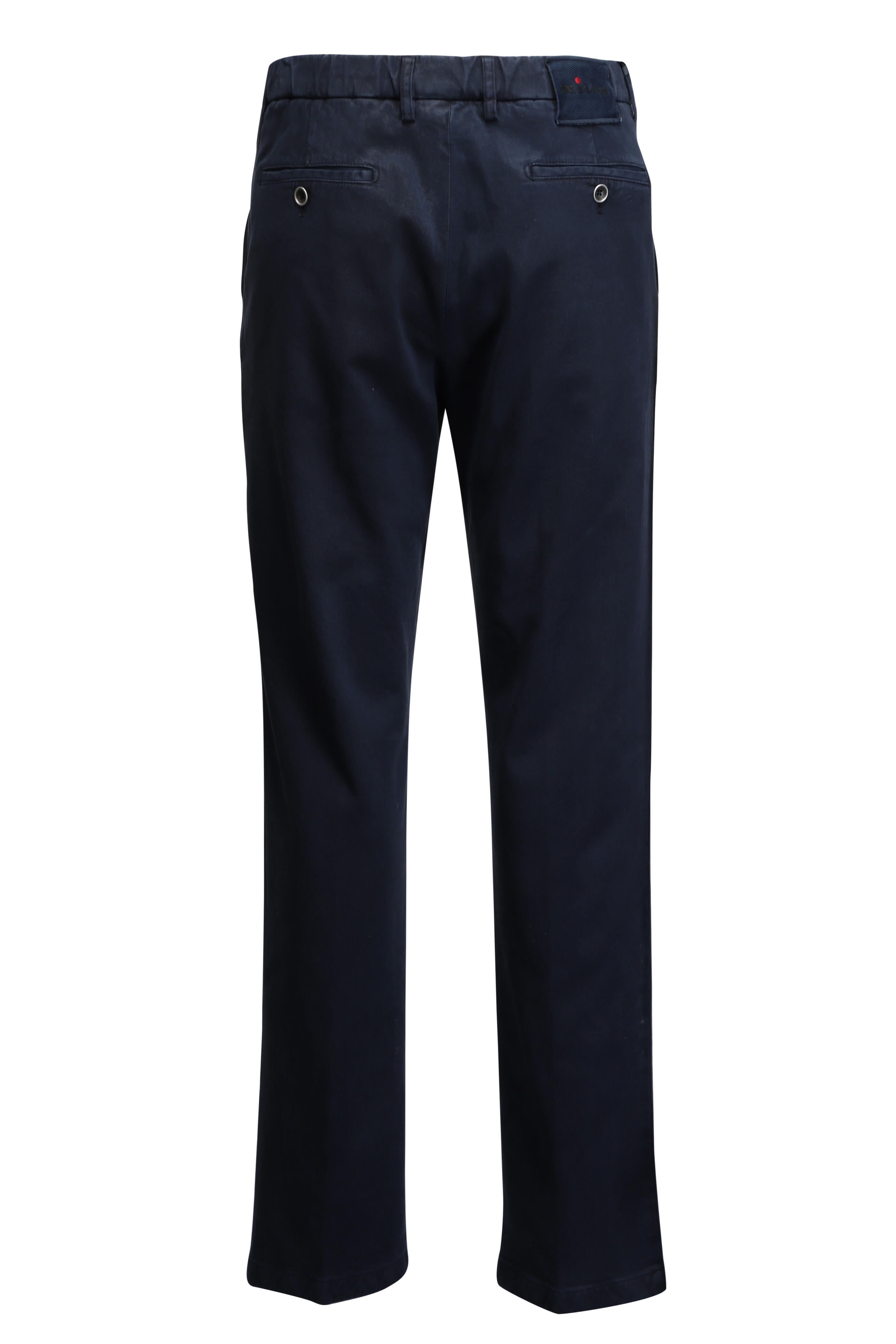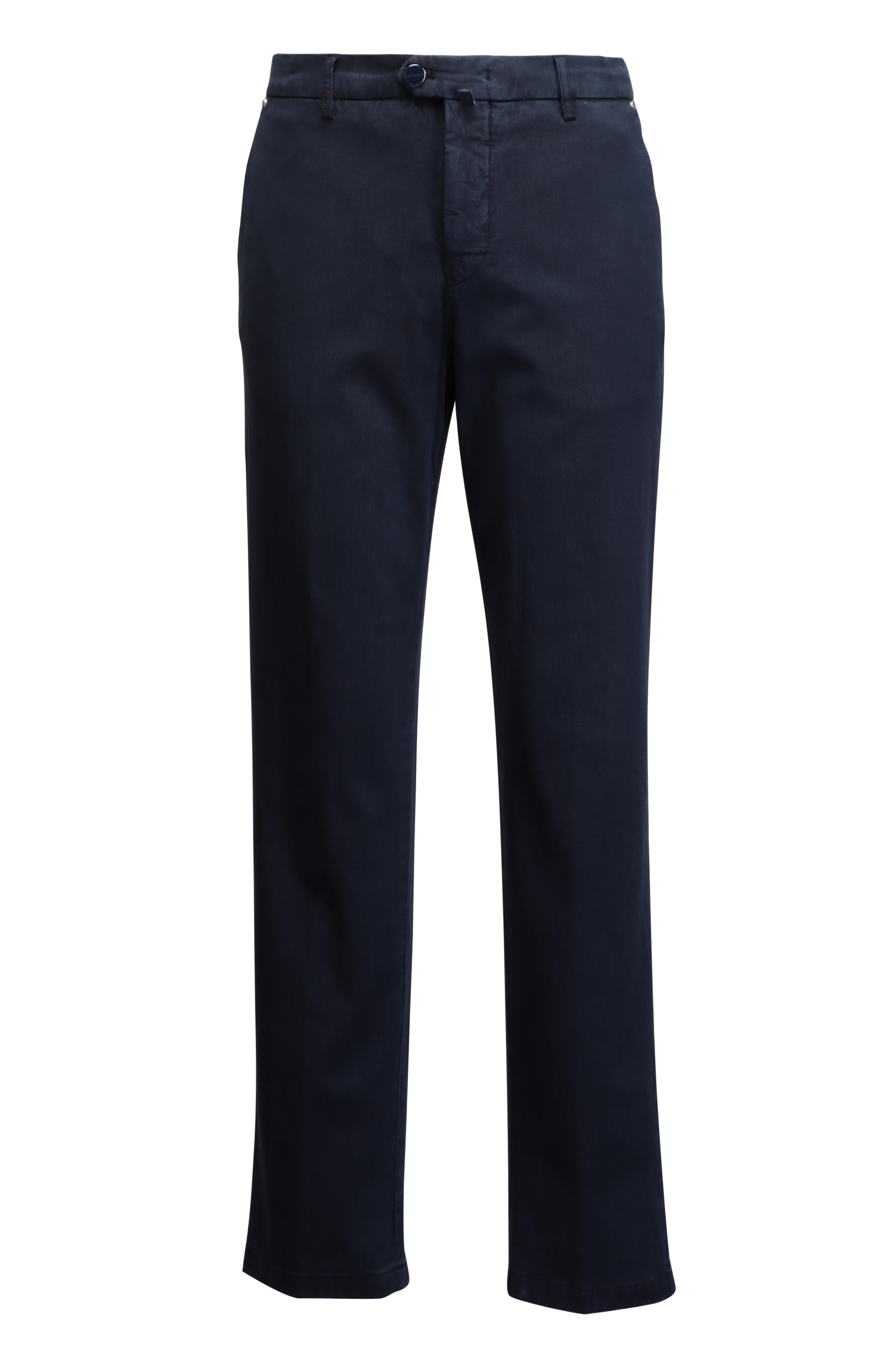 Zip fly; three button closure. Banded waist; belt loops. Side slip pockets; back button besom pockets. Made in Italy. Inseam: 35". 57% lyocell, 40% cotton, 3% elastane. Dry clean.