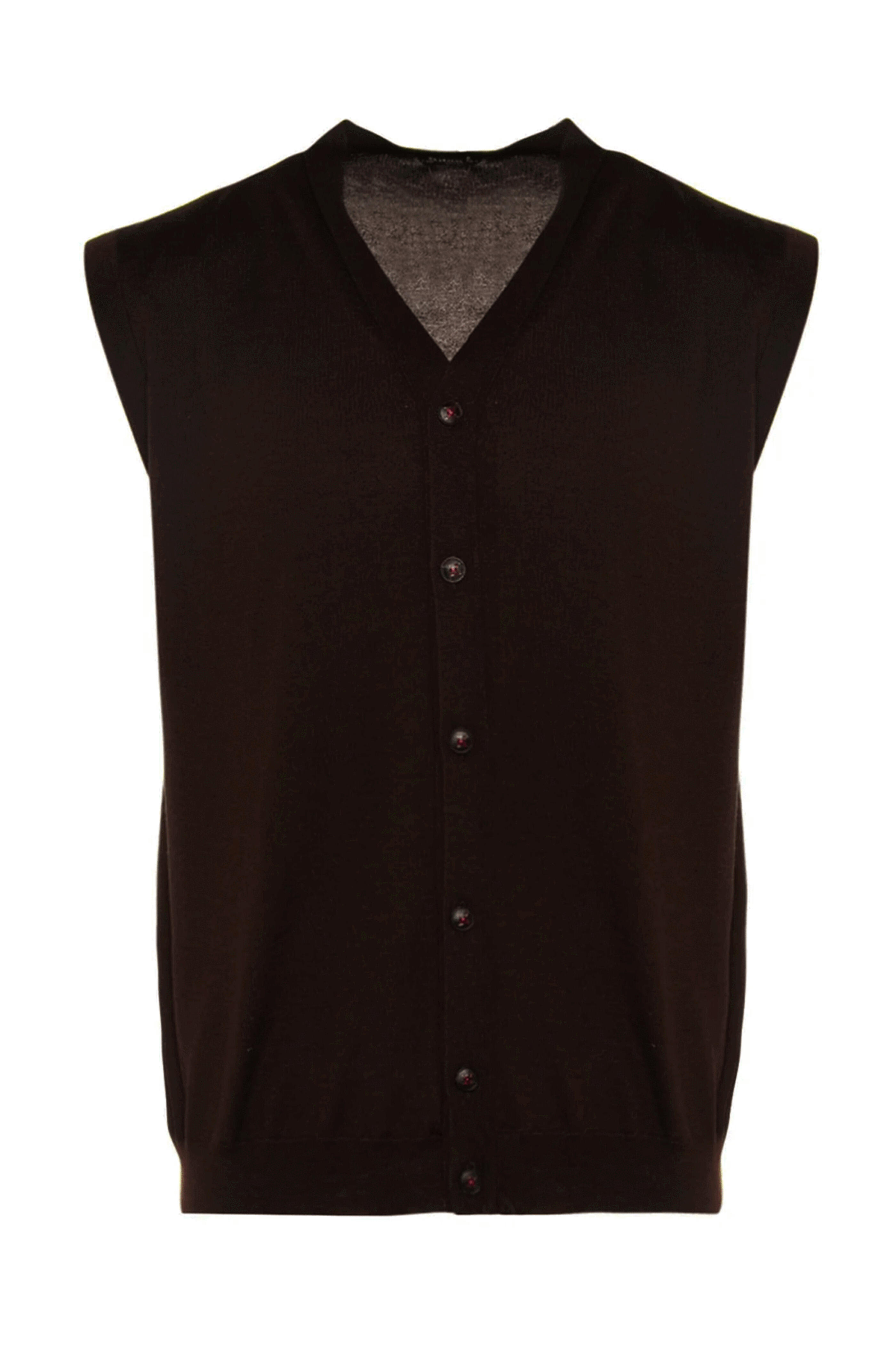 Kiton Chocolate Brown Full Button Vest. V neckline. Button down closure. Sleeveless. Ribbed trims. Made in Italy. 80% cashmere 20% silk.
