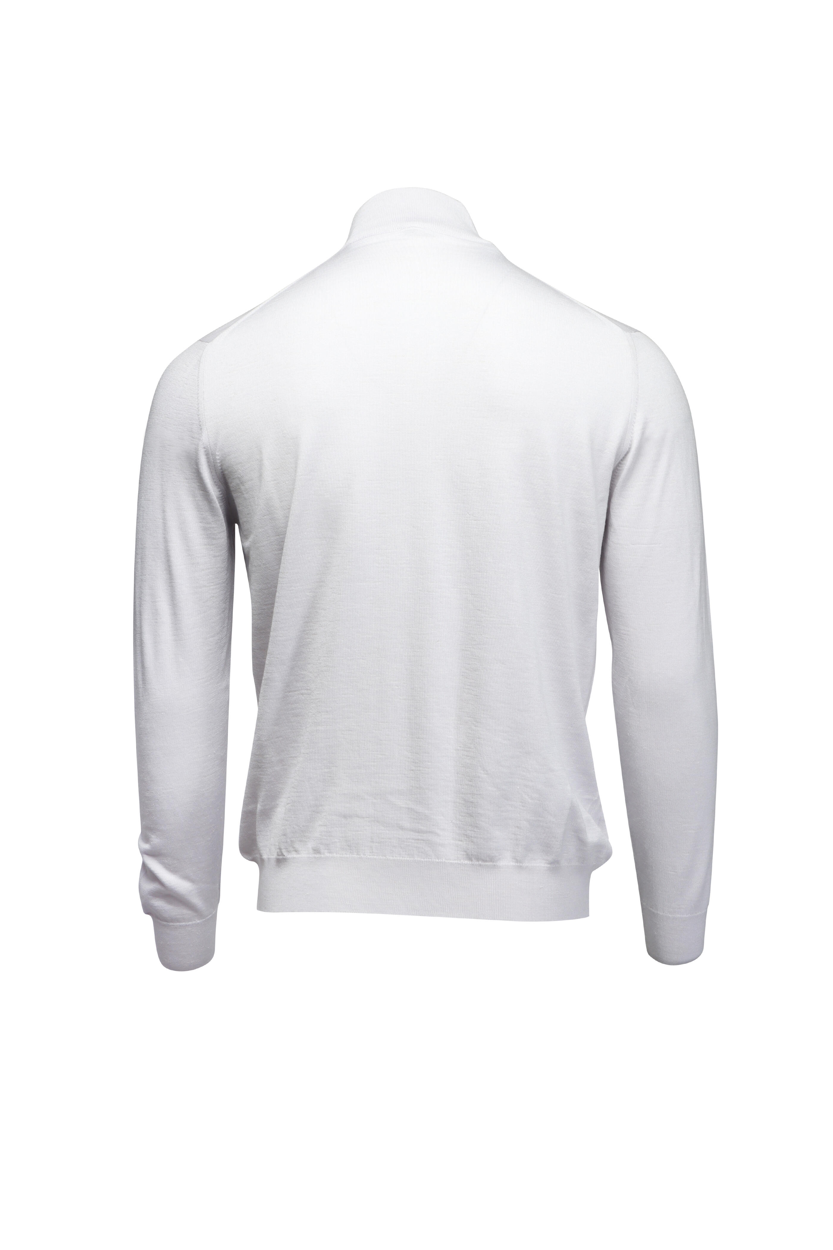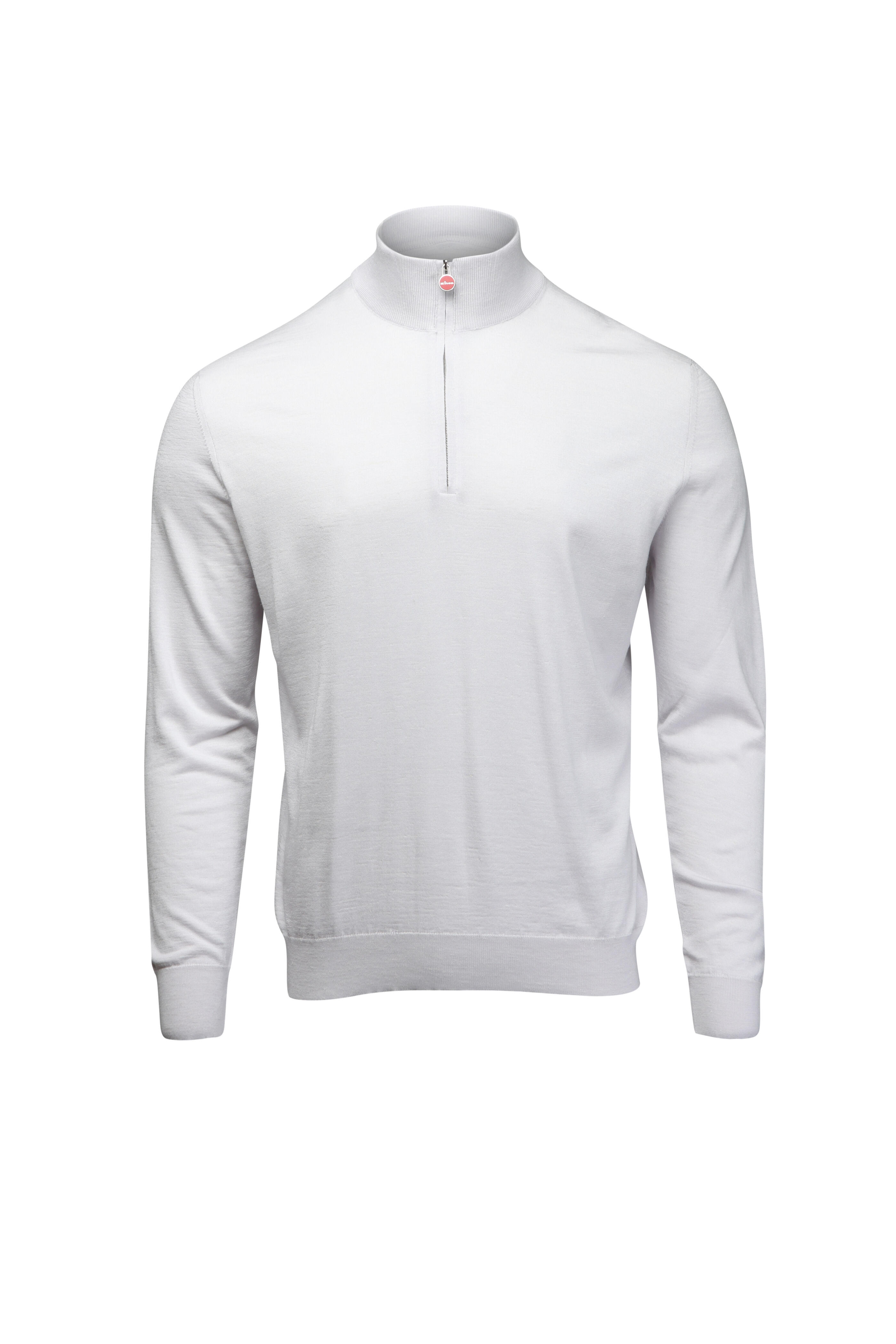 Stand collar. Quarter zip placket. Ribbed trims. Made in Italy. 60% silk, 30% cashmere, 10% linen. Dry clean.