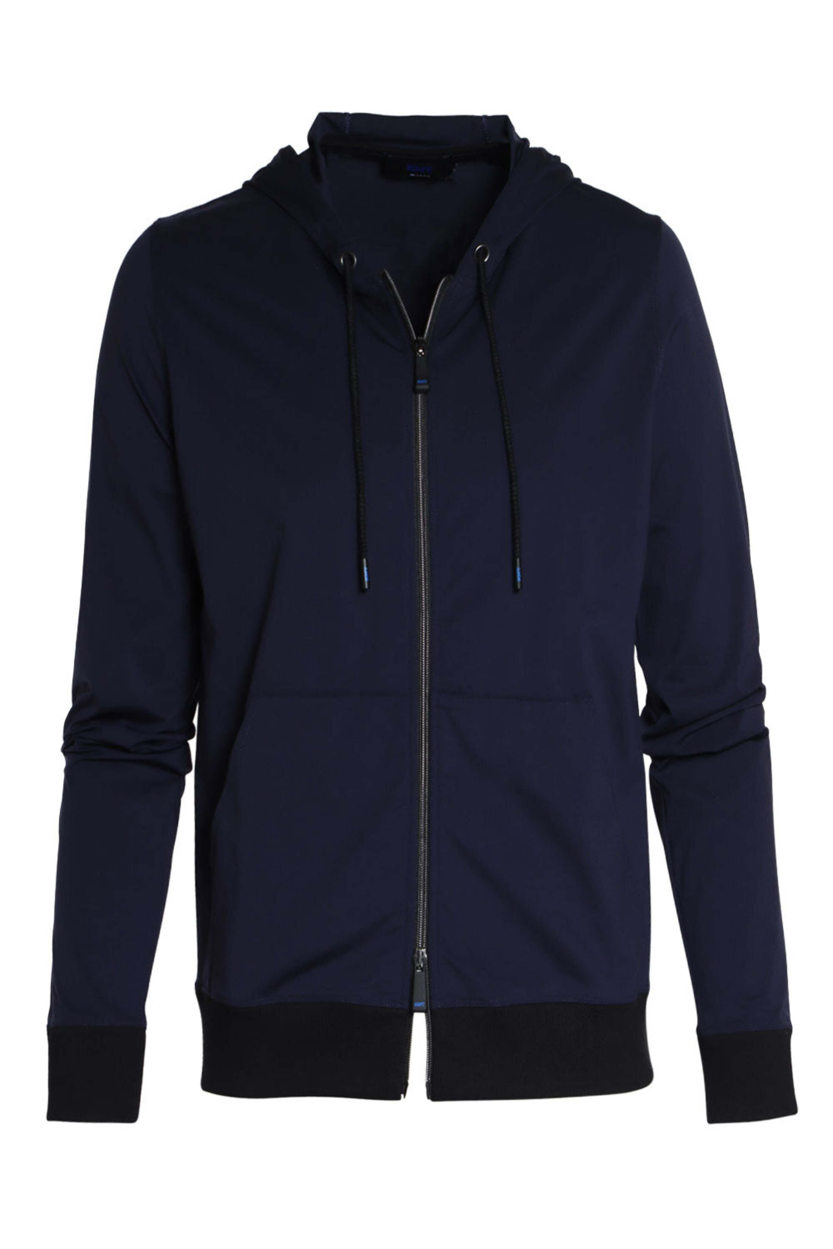 KNT Navy Elastic Nylon Blend Hooded Zip Jacket. Hooded collar with drawstring. Two-way zip closure. Kangaroo pocket. Long sleeves. Ribbed contrasting trims. Tonal stitching. Straight hem. Made in Italy. 85% nylon 15% elastane.