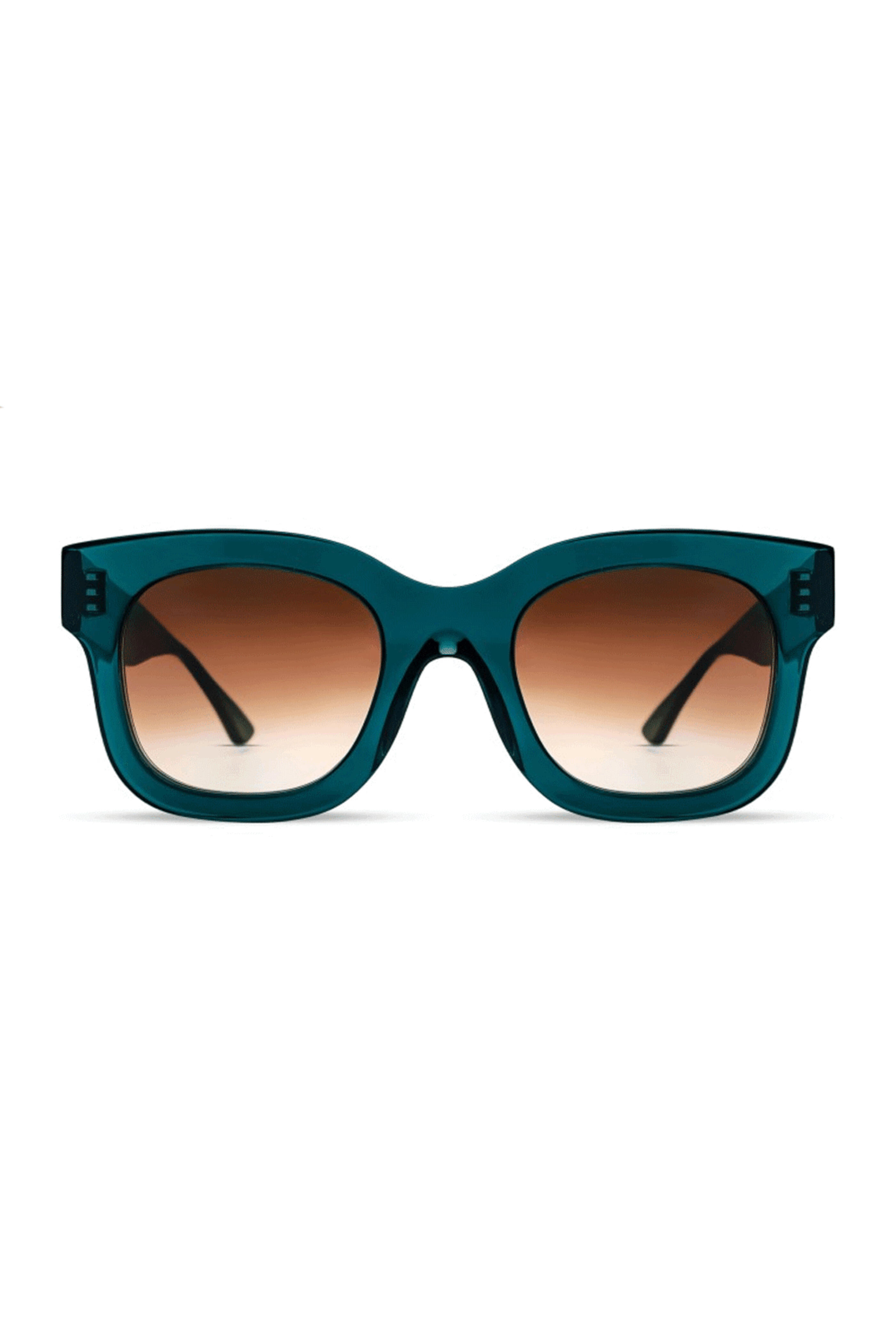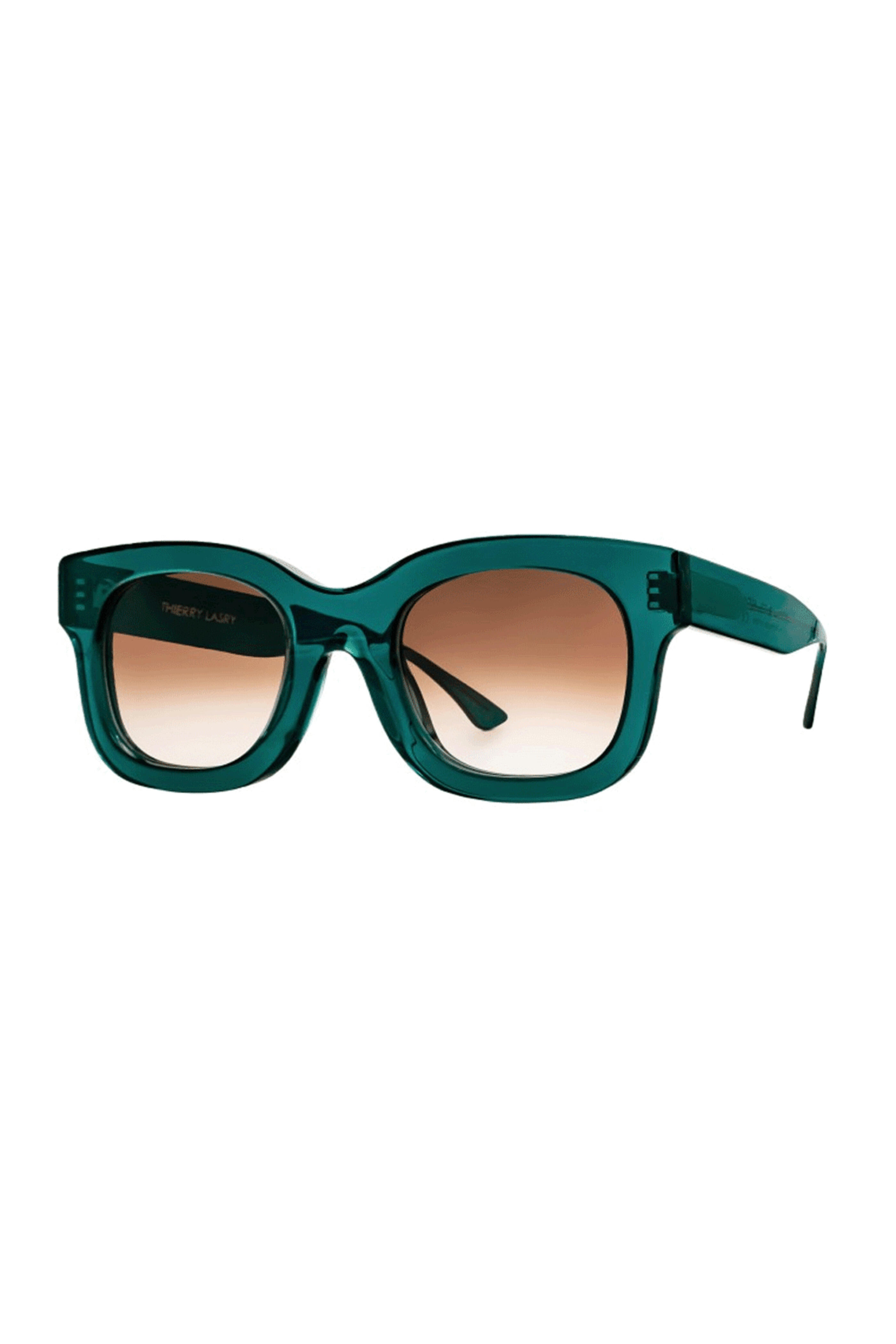 Thierry Lasry Unicorny Rectangular Sunglasses in Blue. Translucent green. Gradient brown lenses. Acetate composition. Width: 144mm. Height: 57mm. Lens: 50mm. Bridge: 23mm. Temple: 145mm. Handmade in Italy. 100% UV protection.