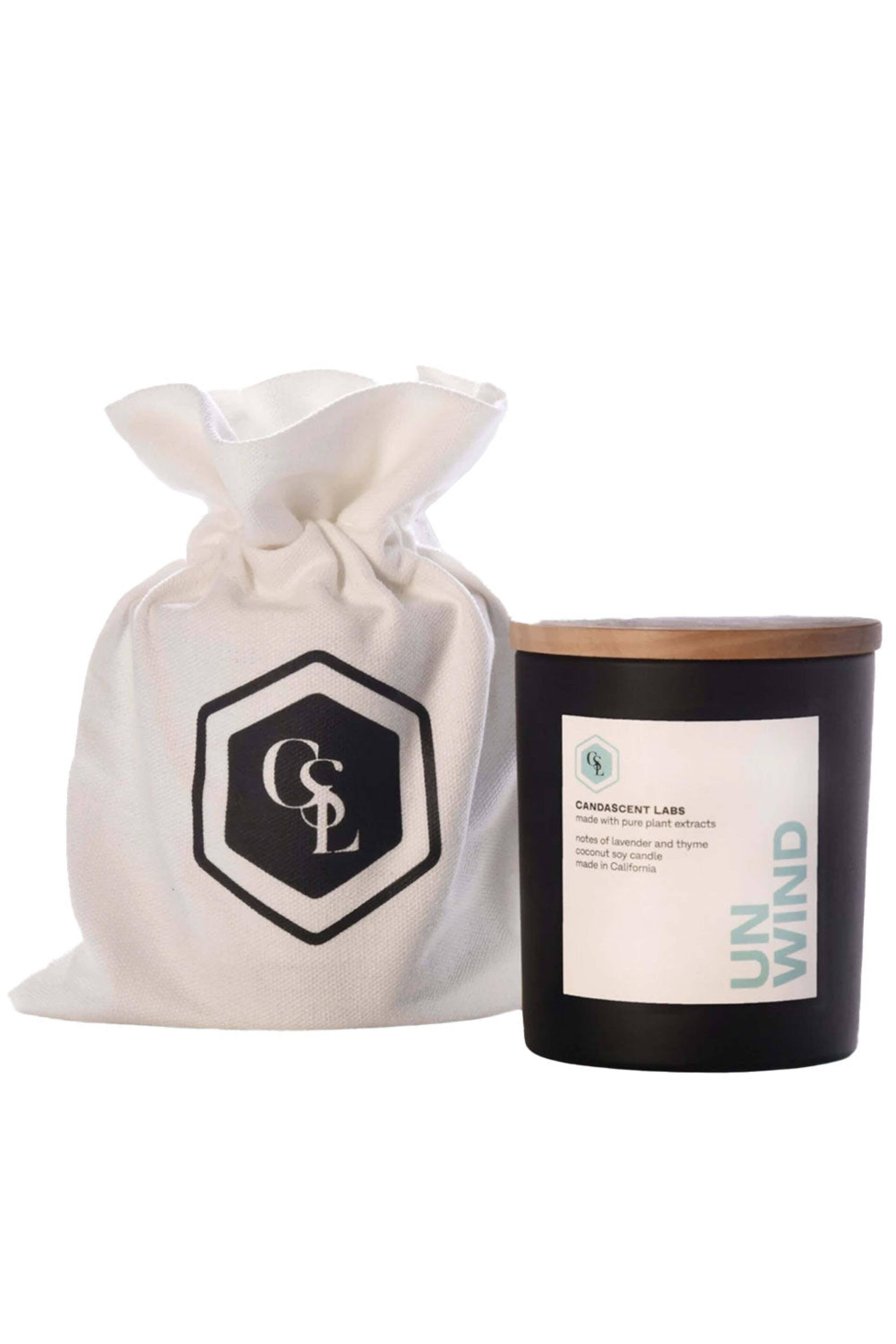 Candascent Labs Unwind Candle. Scent: Lavender and Thyme. Burn time up to 45 hours. 200 g/7.1 oz candle. Coconut soy wax. Lead and zinc free cotton wick. Made in California.