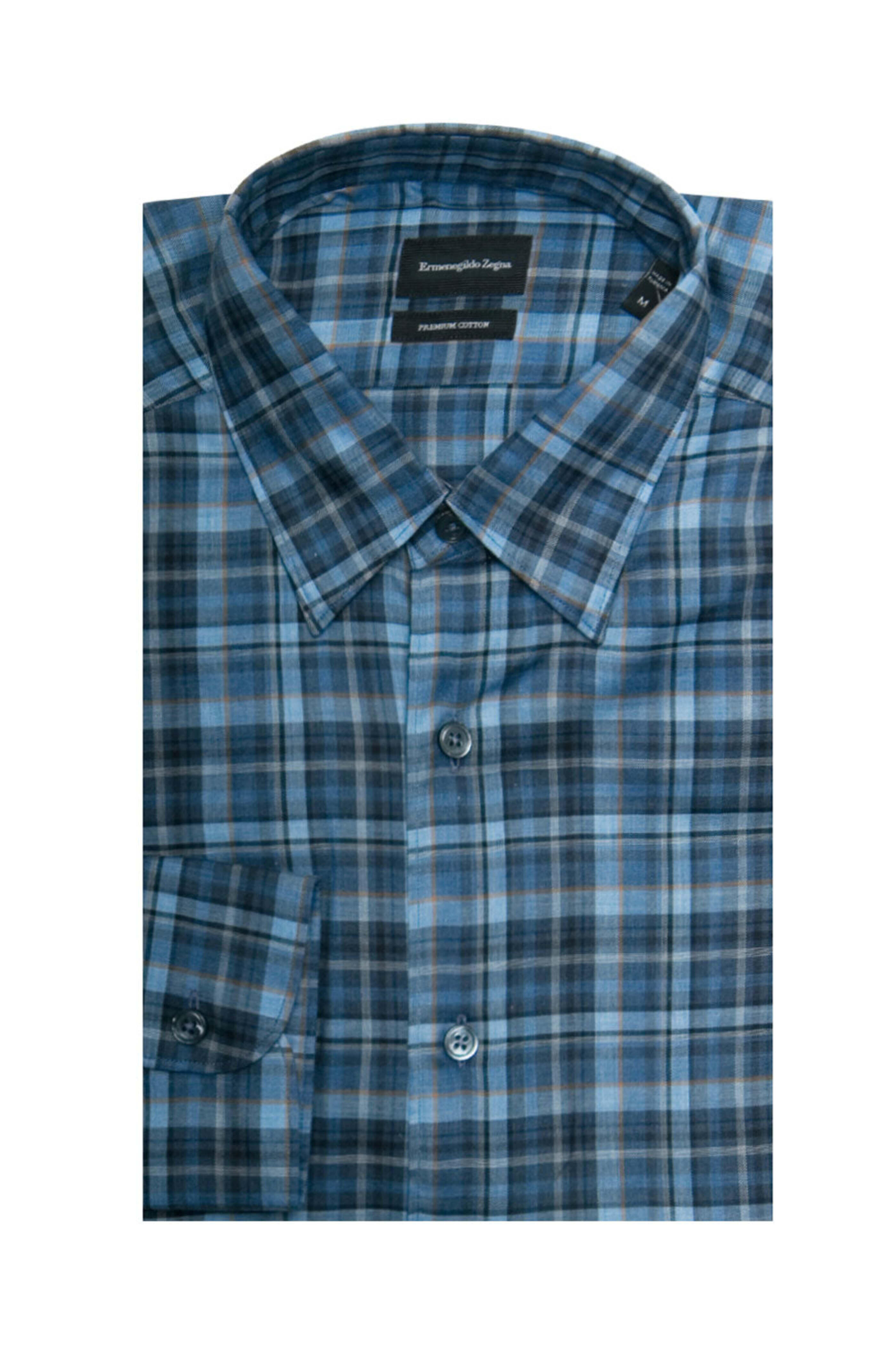 Ermenegildo Zegna Blue and White Tartan Sportshirt. Spread collar. Long sleeve. Single button cuff. Curved hem. 100% cotton.