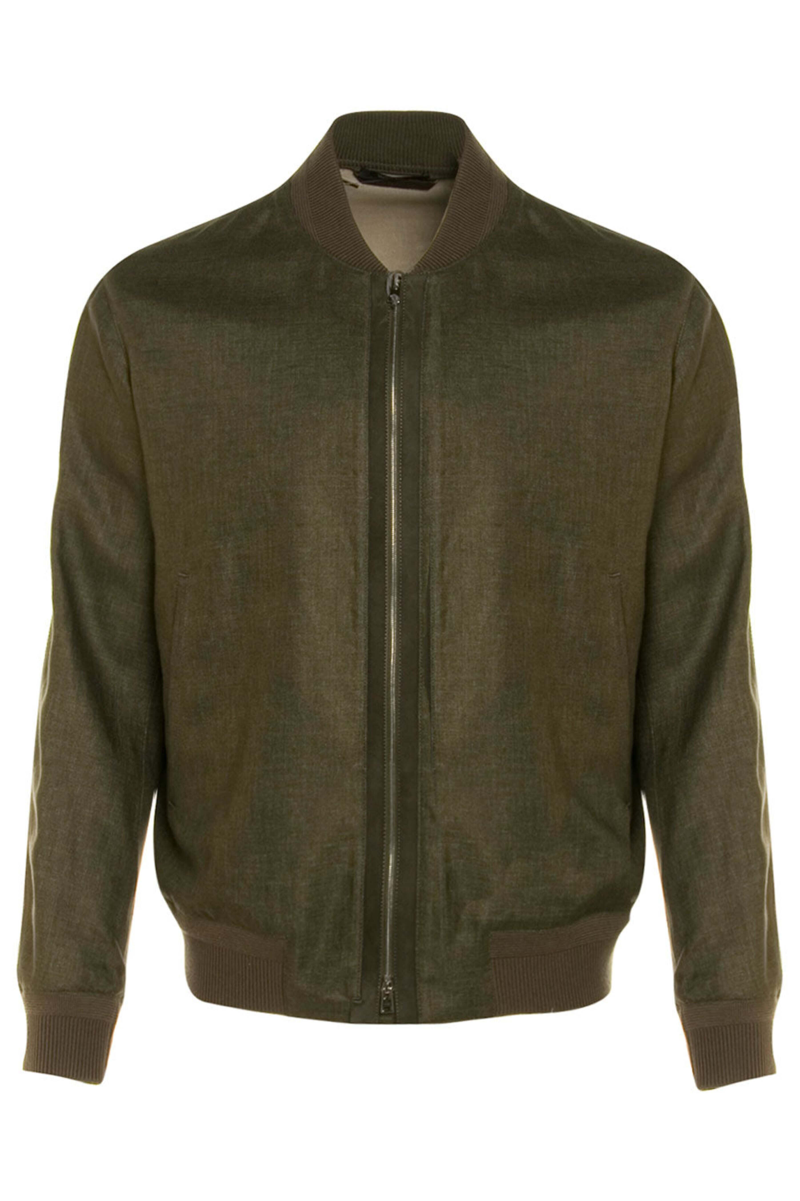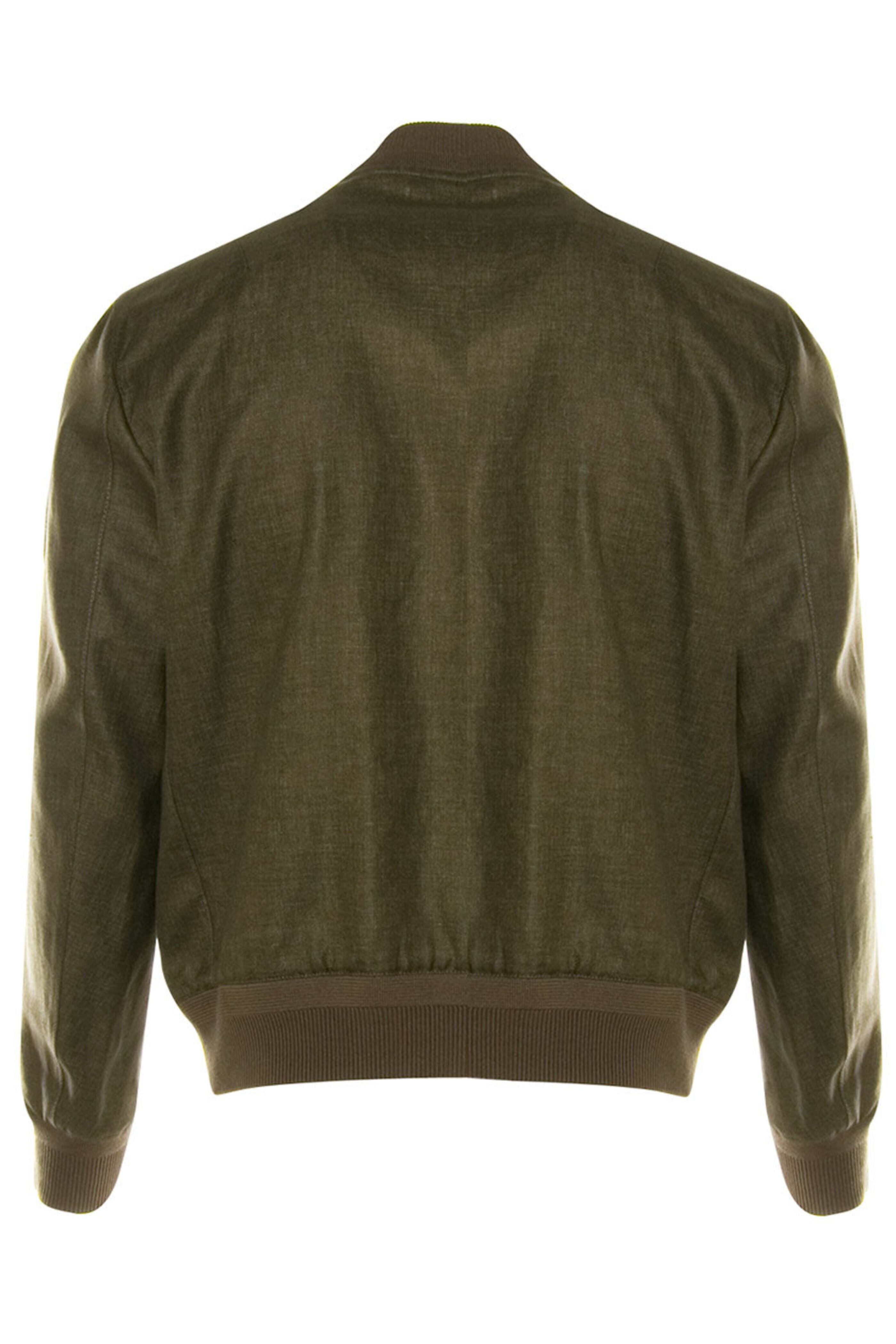 Zegna Olive Green Linen Bomber Jacket. Stand collar. Two-way zip front. Side pockets with snap closures. Long sleeves. Ribbed trims. Silver tone hardware. Linen outer. Polyester lining. Made in Italy.
